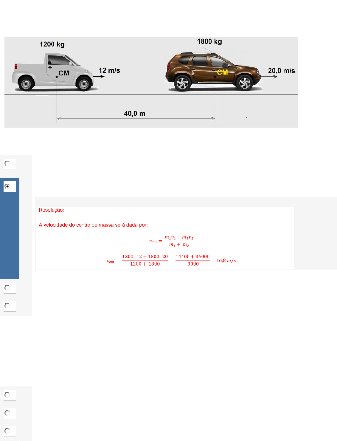 Questão 1/5 - Física Mecânica Um carro utilitário ecológico elétrico de 1200 kg desloca-se a 12,0 m/s ao longo de uma rua retilínea. Um Renault Duster de 1800 kg e se deslocando a 20,0 m/s, tem seu centro de massa situado a uma distância de 40,0 m na frente do centro de massa do utilitário, veja figura. Calcule a velocidade do centro de massa total do sistema. Nota: 20.0 A 10,3 m/s B 16,8 m/s Você acertou! C 40,3 m/s D 54,2 m/s Questão 2/5 - Física Mecânica Uma plataforma giratória gira com aceleração angular constante de 2,25 rad/s2. Após 4,0 s ela girou por um ângulo de 60,0 rad. Qual era a velocidade angular inicial da plataforma quando t = 0s? Assinale a resposta correta: Nota: 20.0 A 20,2 rad/s B 26,6 rad/s C 31,4 rad/s D 10,5 rad/s Você acertou! Questão 3/5 - Física Mecânica Uma bola de 1,2 kg cai verticalmente em um piso com velocidade de 25 m/s e ricocheteia com uma velocidade inicial de 10 m/s. (a) Qual é o impulso recebido pela bola durante o contato com o piso? (b) Se a bola fica em contato com o piso por 0,020 s, qual é a força média exercida pela bola sobre o piso? Assinale a resposta correta: Nota: 20.0 A J = 42 N.s; Fméd = 2,1 kN Você acertou! B J = 30 N.s; Fméd = 1,5 kN C J = 18 N.s; Fméd = 0,9 kN D J = 12 N.s; Fméd = 0,6 kN Questão 4/5 - Física Mecânica Um operário está usando uma chave de boca para afrouxar uma porca. A ferramenta tem 25,0 cm de comprimento e ele exerce uma força de 17,0 N sobre a extremidade do cabo formando um ângulo de 52º com o cabo, veja a figura. Qual torque o operário exerce sobre o centro da porca? Nota: 20.0 A 5,64 N.m B 4,10 N.m C 3,35 N.m Você acertou! D 2,15 N.m Questão 5/5 - Física Mecânica Uma roda de bicicleta possui diâmetro de 622 mm e parte do repouso girando com aceleração angular constante de 3,5 rad/s2. No instante em que a roda completa a sua terceira volta completa, calcule a aceleração radial de um ponto da borda, usando a relação ar=v2/rar=v2/r Assinale a resposta correta: Nota: 20.0 A 54,6 m/s2 B 41,0 m/s2 Você acertou! C 26,7 m/s2 D 15,1 m/s2