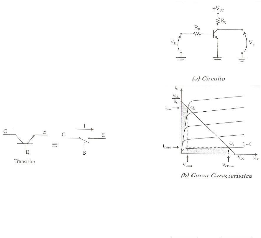 EXPERIÊNCIA N∘ 05 TRANSISTOR BIPOLAR COMO CHAVE Fundação Universidade Federal de Rondônia Núcleo de Tecnologia Departamento de Engenharia Elétrica - DEE Disciplina de Eletrônica I I. OBJETIVOS ∙ Levantadas na prática passada as curvas de trabalho de um transistor operando com diferentes correntes de base, calcular os resistores de polarização do transistor para que o mesmo funcione como chave (saturação e corte) seguindo as especificações de projeto. ∙ Uma vez conhecidos os valores dos resistores de polariza- ção, simular o mesmo no programa Multisim ou Proteus. ∙ Posteriormente, comparar os valores calculados e os valores de simulação com os valores obtidos mediante experimentação no laboratório. II. INTRODUÇÃO Um transistor operando na região de saturação e de corte funciona como uma chave, ou seja, como um elemento de controle on-off, conduzindo corrente ou não. Figura 1. Analogia Transistor - Chave. O circuito de polarização utilizado nesta aplicação é o de corrente de base com duas fontes de alimentação, sendo que a fonte de polarização da base é, na realidade, o sinal de entrada que controla o transistor, cortando-o (chave aberta) ou saturando-o (chave fechada). Para que o transistor opere na região de corte 푄1, é necessário que a tensão de entrada 푉퐸 seja menor que 푉퐵퐸 de condução. Nesta situação, não circula corrente pelo coletor (퐼푐표푟푡푒 ∼= 0) e a tensão de saída é máxima (푉푆 = 푉퐶퐸 ∼= 푉퐶퐶). Para que o transistor opere na região de saturação 푄2, é necessário que a tensão de entrada 푉퐸 seja maior que 푉퐵퐸 de condução. Nesta situação, a corrente de coletor é máxima (퐼퐶푠푎푡), dentro de um limite imposto pela polarização, e a tensão de saída é mínima. Para dimensionar 푅퐶 e 푅퐵 , utiliza-se a análise das malhas de entrada e de saída. Malha de Entrada: 푉푅퐵 = 푉퐸 − 푉퐵퐸 . Figura 2. Transistor operando como chave. Malha de Saída: 푉푅퐶 = 푉퐶퐶 − 푉퐶퐸 . Assim tem-se: 푅퐵 = 푉퐸 − 푉퐵퐸 푖퐵 푒 푅퐶 = 푉퐶퐶 − 푉퐶퐸 푖퐶 (1) Como o corte do transistor depende apenas da tensão de entrada 푉퐸 , o cálculo dos resistores de polarização é feito baseando-se apenas nos parâmetros de saturação. Um transistor comum, quando saturado, apresenta um 푉퐶퐸푠푎푡 de aproximandamente 0, 3푉 e um determinado valor mínimo de 훽 (entre 10 e 50), para garantir a saturação. A corrente de coletor de saturação 퐼퐶푠푎푡 depende da resistência acoplada ao coletor ou da corrente imposta pelo projeto. Assim, as equações ficam: 푅퐶 = 푉퐶퐶 − 푉퐶퐸푠푎푡 푖퐶푠푎푡 푒 푅퐵 = 푉퐸 − 푉퐵퐸 푖퐵푠푎푡 (2) III. MATERIAIS UTILIZADOS ∙ Osciloscópio Minipa MO - 1262; ∙ Multímetro digital ICEL MD - 6601; ∙ Transistor BC548; ∙ Resistores; ∙ Protoboard; ∙ LED. IV. PARTE EXPERIMENTAL A. Primeiro passo Projetando um circuito chaveado por transistor: a) Monte o circuito da figura 3 calculando os valores de 푅푏 e 푅퐶 com base nas fórmulas já apresentadas. O sinal de entrada é uma onda quadrada com tensão de 2.2Vp e frequência de 10KHz. Os parâmetros do transistor BC548 encontram-se na tabela I para a utilização nos cálculos. Adapte os valores dos resistores para valores comerciais. V퐵퐸푠푎푡 0,7V V퐶퐸푠푎푡 0,3V 훽푠푎푡 20 I퐶푚푎푥 100mA V퐶퐸푚푎푥 30V I퐶푠푎푡 10mA Tabela I PARÂMETROS DO TRANSISTOR BC548. Figura 3. Circuito chaveado por transistor. b) Com o osciloscópio utilizando a ponta de prova no canal 1 medir a tensão de entrada e frequência determinadas na prática, com outra ponta de prova no canal 2 medir a tensão de coletor-emissor no transistor. c) Altere a frequência do sinal de entrada para 100kHz, 1MHz, 2MHz e através do osciloscópio observe e ex- plique o que ocorre com a tensão no resistor 푅푐 em cada caso. B. Segundo passo Testando um circuito chaveado com transistor: a) Monte o circuito da figura 4 calculando os valores de 푅푏 e 푅퐶 com base nas fórmulas já apresentadas. Ressalta- se que o circuito agora possui um LED na malha de saída, o que acarreta na alteração de sua fórmula. O LED possui 푉퐷 = 1, 5푉 e 퐼퐷 = 25푚퐴. Adapte os valores dos resistores para valores comerciais. Figura 4. Circuito chaveado por transistor com LED de teste. b) Observe o que ocorre com o LED e comente. c) Agora mude a chave para a posição “OFF” e novamente observe o que ocorre com o LED e comente. C. Terceiro passo Projeto de um circuito de acionamento de lâmpada. a) Através dos conhecimentos adquiridos nas práticas anteri- ores, monte um circuito de acionamente de uma lâmpada incandescente de 127VAC/100W por meio de um sistema digital CMOS alimentado por 12V e com um transistor funcionando como chave. b) Especifique todos os componentes utilizados no projeto destacando seus parâmetros e realizando a análise técnica destes. REFERÊNCIAS [1] SEDRA, Adel S.; SMITH, Kenneth C. “Microeletrônica”, 5푎edição. São Paulo: Pearson Prentice Hall, 2007. [2] MARQUES, Angelo Eduardo B.; CHOUERI JÚNIOR, Salomão; CRUZ, Eduardo Cesar Alves. Dispositivos semicondutores: diodos e transistores, 11푎edição. São Paulo: Érica, 2007.
