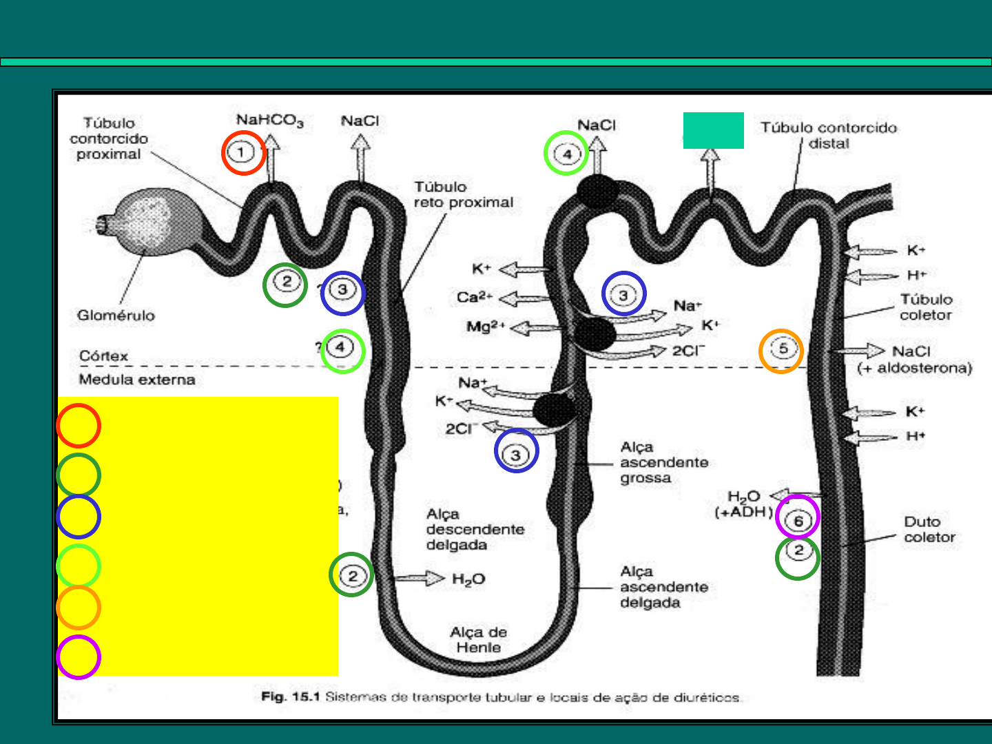 * DIURÉTICOS Ca 1- Acetazolamida 2- Diurético osmótico 3- Diurético de alça 4- Tiazídico 5- Antag. da aldosterona 6- Antag. do ADH Katzung/98 * DIURÉTICOS - CLASSIFICAÇÃO DE ACORDO C/A EXCREÇÃO DE SÓDIO I - Alta eficácia (>15%) (de alça) Ac. Etacrínico Sulfamídicos (furosemida, bumetanida, piretanida) II – Eficácia média (5-10%) Tiazídicos (clorotiazida, renzotiazida, hidroclortiazida) III – Fracos ou adjuntivos (<5%) Xantinas = (ação dilatadora da arteríola aferente e t. proximal) Agentes osmóticos = manitol Poupadores de potássio = (final t.distal de Na - K/H) Antagonista da aldosterona = espirolactona Triantereno e amilorida * DIURÉTICOS de ALÇA ALTA EFICÁCIA (>15%) Sulfamídicos (furosemida, bumetanida, piretanida) INDICAÇÕES = Edema agudo de pulmão/IC Hipercalemia Insuficiência Renal TOXICIDADE = Alcalose Metabólica Hipocalêmica Ototoxicidade (reversível) Hiperuricemia = gota < reabsorção de ácido úrico no túbulo proximal Reações alérgicas * DIURÉTICOS - TIAZÍDICOS II – EFICÁCIA MÉDIA (5-10%) Tiazídicos (clorotiazida, hidroclortiazida) MECANISMO = ( - ) reabs. de NaCl no TCD e TP porção terminal. (+) a reabsorção de Ca no TCD INDICAÇÕES = ICC; hipertensão; Nefrolitíase devido a hipercalciúria idiopática TOXICIDADE = Alcalose metabólica hipocalêmica hiperglicemia = (-) lib. de insulina e aprov. da glicose hiperlipidemia = (+) 5-15% do colesterol sérico e (+) LDL * DIURÉTICOS - OSMÓTICOS III – FRACOS OU ADJUNTIVOS (<5%) Agentes osmóticos = manitol MECANISMO = são filtrados e ñ/reabsorvidos INDICAÇÕES = 1- (+) volume urinário para impedir anúria em casos que a hemodinâmica do rim está comprometida; 2- redução da pressão intracraniana e intra-ocular, pela diurese hídrica TOXICIDADE = 1- expansão do volume extracelular, por extrair água dos compartimentos intracelulares; 2- desidratação e hipernatremia, com uso excessivo. * Diuréticos Osmóticos- Manitol III – FRACOS OU ADJUNTIVOS (<5%) Agentes osmóticos = manitol MECANISMO = são filtrados e ñ/reabsorvidos INDICAÇÕES = 1- (+) volume urinário para impedir anúria em casos que a hemodinâmica do rim está comprometida; 2- redução da pressão intracraniana e intra-ocular, pela diurese hídrica TOXICIDADE = 1- expansão do volume extracelular, por extrair água dos compartimentos intracelulares; 2- desidratação e hipernatremia, com uso excessivo. * DIURÉTICOS – POUPADORES DE POTÁSSIO III – FRACOS OU ADJUNTIVOS (<5%) Poupadores de potássio = (final túbulo distal) 1-Espirolactona = antagonista competitivo da aldosterona 2- Triantereno e amilorida = (-) do transporte de Na pelos canais da membrana luminal. INDICAÇÕES = 1- excesso de mineralocorticóides devido hipersecreção primária (sindrome de Conn) 2- aldosteronismo secundário em conseqüência de ICC, cirrose hepática, síndrome nefrótica. TOXICIDADE = 1- hipercalemia 2- acidose metabólica hiperclorêmica 3- ginecomastia, por serem esteróides * DIURÉTICOS – PADRÕES ELETROLÍTICOS * Diuréticos que bloqueiam a reabsorção do Na+: Mecanismos de ação Mais potentes Menos potentes Local de ação Nome Mecanismo Alça furosemida Co-transporte Na+/Cl- Início do TCD tiazidas Co-transporte Na+/Cl- Término do TCD amilorida Canal de Na+ espironolactona Antagonista mineralocorticóide * DIURÉTICOS – doses padrões de referência * DIURÉTICOS – doses padrões de referência * INTERAÇÕES FARMACOLÓGICAS IMPORTANTES COM DIURÉTICOS AINES Sal Descongestionantes Probenecida Hipercalemia- Induzida pelos Diuréticos Poupadores de K Aumento da Ototoxicidade dos Diuréticos de Alça Resposta Diurética Reduzida Inibidores da ECA Beta-Bloqueadores Suplementos de K Diuréticos Poupadores de K Heparina Drogas Ototóxicas