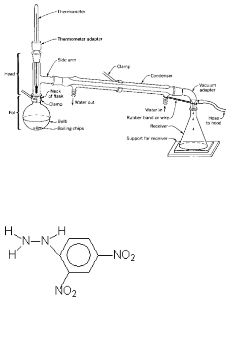 DESTILAÇÃO SIMPLES Diogo Émerson L. Carvalho e Talita Soares de Souza e Silva Centro Federal de Educação Tecnológica de Minas Gerais, Departamento de Química, Av. Amazonas, 5253, Nova Suíça, 30.421-169 - Belo Horizonte, MG – Brasil. ________________________________________________________________________________ Resumo: Este experimento teve o objetivo de introduzir a técnica de destilação simples e mostrar a aplicação desta técnica na purificação de solventes orgânicos. Separou-se o cinamaldeído extraído do pó de canela do solvente orgânico, hexano. Palavras chave: destilação simples, cinamaldeído, hexano. Laboratório de Química Orgânica – 2º. Semestre de 2012 – Profa. Adriana Akemi ________________________________________________________________________________ INTRODUÇÃO Destilação é um método ou processo físico de separação de uma mistura de líquidos ou de sólidos dissolvidos em seus componentes. Esse processo é caracterizado pelo fato de o vapor formado possuir uma composição diferente do líquido residual. O vapor é condensado e o produto obtido é conhecido como destilado Nesse processo, é importante que a substância a ser destilada seja volátil na temperatura utilizada.¹ O primeiro documento impresso e largamente difundido na sociedade sobre a aplicação do processo de destilação deve-se a Brunswig, publicado em 1500, embora existam relatos históricos que os alquimistas alexandrinos e árabes tenham sido os precursores da técnica. Durante muito tempo, esse tem sido um importante método de separação e/ou purificação de compostos químicos em laboratórios e em indústrias, pois se trata de um procedimento simples, eficiente e economicamente viável para muitos processos de separação de misturas. O equipamento para execução da técnica consiste de um frasco de destilação (no qual será aquecida a mistura de líquidos ou de soluções de sólidos dissolvidos em solvente), uma fonte de aquecimento, um condensador e um vaso de coleta do destilado.¹ Figura 1- Aparelhagem utilizada na destilação simples. Fonte: http://www.qmc.ufsc.br/qmc5230/aula02/destsimples.html Figura 2- 2,4-dinitrofenil-hidrazina Fonte: http://disciplinas.uniararas.br/quimica/wp-content/dpoffline_quimica/biomedica/modulo9/biom-modulo-9.htm MATERIAIS E MÉTODOS Reagentes e solventes - Extrato de canela em hexano ou pentano. Vidrarias e materiais Balão de fundo redondo; Pérolas de vidro ou de porcelana; Cabeça de destilação; Funil de vidro; Frascos coletores de destilados; Béqueres; Alonga; Equipamentos Suporte universal; Garras; Alonga; Funil analítico; Condensador reto; Tubos de látex; Termômetro; Manta de aquecimento com termostato. PROCEDIMENTOS Primeiramente foi montada a aparelhagem de destilação simples. No balão de fundo redondo foi colocado o hexano com o cinamaldeído extraído do pó de canela da aula anterior. A chapa foi ligada e a temperatura de ebulição do hexano é de 62°C. A faixa de temperatura medida foi de 60°C-65C° A primeira substância recolhida é chamada de calda, e é recolhida em um frasco separado para descarte. Posteriormente, é recolhida a fração de interesse, líquido transparente. Por fim, foi recolhida a fração da calda do final da destilação, um líquido amarelo. A caracterização foi feita medindo o índice de refração. O índice padrão segundo o catalogo Aldrich é de 1,3790 e o medido foi de 1,3755. RESULTADOS E DISCUSSÕES No processo de destilação, quando o líquido a ser destilado apresenta temperatura de ebulição elevada, deve-se baixar a pressão com uma bomba de vácuo a fim de diminuir a temperatura de ebulição. Neste experimento, não foi necessário este abaixamento da pressão do sistema, já que a temperatura ebulição do solvente utilizado não foi muito alta. Quando a mistura contida no balão de fundo redondo, sobre a manta aquecedora, entrou em ebulição, mediu-se a temperatura do sistema com um termômetro de mercúrio e a temperatura observada foi de aproximadamente 62°C. Este valor foi apenas estimado. Uma vez que, a parte esmerilhada do vidro do balão ficou exatamente sobre a altura atingida pela coluna de mercúrio, o que impossibilitou uma leitura exata. A temperatura de ebulição do hexano, segundo a literatura, varia de 62º C a 74º C. ² Também segundo a literatura, a temperatura do outro componente da mistura, ou seja, o cinamaldeído, é de 248°C.³ A destilação simples foi uma técnica adequada para a separação destes componentes devido a grande diferença entre suas temperaturas de ebulição. Este processo permite apenas a separação de líquidos que possuem uma diferença no ponto de ebulição maior do que cerca de 80°C. 4 Passados alguns minutos do início da destilação, recolheu-se num balão de fundo redondo, cerca de 25mL do destilado. Esta primeira fração recolhida é chamada “cabeça de destilação”. A “cabeça de destilação” é um produto que destila abaixo da temperatura de ebulição do hexano.5 Este produto é, na verdade, uma mistura de impurezas formada por constituintes voláteis e que, por este motivo, foi descartada. A caracterização inicial se deu por meio da cor das substâncias, enquanto o hexano é conhecido por ser incolor, o cinamaldeído é conhecido por sua coloração amarela. Caracterizando-se o hexano através do índice de refração foi possível identificá-lo, pois o índice no catálogo de Aldrich é de 1,3790 e o índice obtido experimentalmente foi de 1,3755. A caracterização do cinamaldeído foi obtida misturando-o com 2,4-dinitrofenil-hidrazina, quanto menos conjugado a substância ela tende para a cor amarela e quanto mais conjugado a substância mais ele tende para a cor vermelha. Após o teste, resta uma solução amarela ácida e o precipitado laranja. CONCLUSÕES Com a extração simples, devido a diferença de temperatura de ebulição do hexano e do cinamaldeído, foi pos