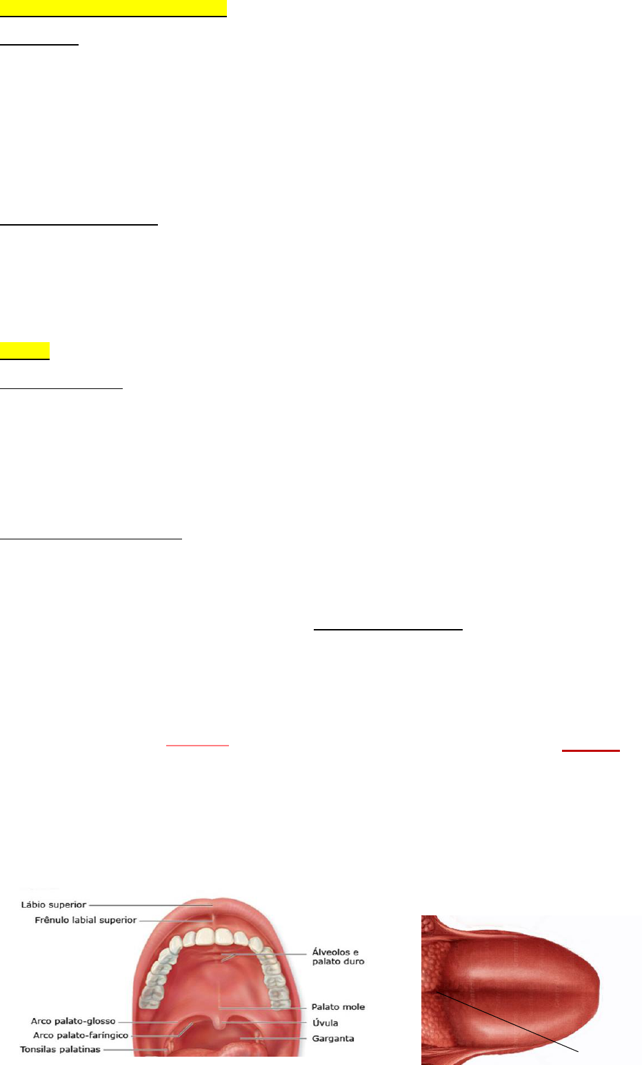 ANATOMIA DO SISTEMA DIGESTÓRIO AUTORIA DE NOÇÕES GERAIS DO SISTEMA FUNÇÕES: • Suprimento de nutrientes por meio da digestão • Mastigação (desintegração mecânica parcial dos alimentos) • Deglutição (condução do bolo alimentar) • Ingestão (desintegração química do alimento) • Absorção (feita pelos intestinos) • Excreção (eliminação do que não foi digerido por meio das fezes) DIVISÃO FUNCIONAL: CANAL ALIMENTAR (órgão formadores do tubo que vai conduzir o bolo alimentar) GLÂNDULAS ANEXAS (órgãos secretores de subst. que atuam em modificações químicas e proporcionam a absorção) BOCA: BOCA EXTERNA: • Primeira porção do canal alimentar • Comunica CAVIDADE ORAL com o meio externo • Limitada pelos LÁBIOS • Formada por Músculos Esfíncteres CAVIDADE ORAL/BUCAL: • Anterior a ela, há o espaço entre lábios e dentes chamado de VESTÍBULO • Limites: ANTERIOR Lábios e fenda entre eles (Rima bucal) POSTERIOR Orofaringe, através do ISTMO DAS FAUCES LATERAL Bochechas SUPERIOR Palatos INFERIOR Músculos do assoalho da boca (M. Milo-hióideo) SALIÊNCIAS Gengiva, Dentes, Língua Rebeca Zilli PALATO teto da cavidade oral, que a separa da nasal PALATO DURO: anterior e ósseo PALATO MOLE: posterior e muscular *no plano médio do palato se projeta uma saliência (ÚLVULA), e dois arcos laterais (PALATOGROSSO e PALATOFARINGEO) que abrigam a tonsila palatina (amígdala). LÍNGUA órgão muscular revestido por mucosa que exerce importantes funções na mastigação, deglutição, degustação e fonação (articular palavras) FACE SUPERIOR DORSO DA LÍNGUA *presença de papilas gustativas (papila valada) *no início do terço posterior da língua, nota-se um sulco terminal que divide ela em CORPO e RAÍZ Sulco terminal co rp o ra íz FARINGE: Na deglutição, o palato mole é elevado e bloqueia a continuidade entre a NASO e a BUCOFARINGE (assim o alimento não se direciona para a cavidade nasal); a CARTILAGEM EPIGLÓTICA fecha o início da laringe (ÁDITO) e evita que o alimento penetre o trato respiratório. As partes da faringe participantes do processo digestório são: • BUCOFARINGE: separada da cavidade oral pelo ÍSTMO DAS FAUCES • LARINGOFARINGE: posterior à laringe, se direciona ao ESÔFAGO ESÔFAGO: • Órgão tubular, oco e comprido. • Encontra-se após a laringofaringe e se direciona para o estômago. • Dividido em: PORÇÃO CERVICAL, PORÇÃO TORÁCICA (maior porção) PORÇÃO ABDOMINAL. • Fica entre a Coluna vertebral e a Traqueia • Atravessa o DIAFRAGMA pelo Hiato Esofágico • Luz aumenta com a passagem do bolo (Peristaltismo) HÉRNIA DE HIATO ESOFÂGICO Às vezes a parte abdominal pode escapar através do hiato esofágico e fazer uma hérnia de hiato, em que o ácido clorídrico ataca o esôfago, isso gera esofagite de refluxo. DIAFRAGMA: DENTES utilizados para a trituração mecânica do alimento: são estruturas rijas, esbranquiçadas, implantadas em gonfose na Maxila e Mandíbula. de leite: 20 dentes permanente: 32 dentes GLÂNDULAS SALIVARES consideradas órgãos anexos do sistema que secretam enzimas digestórias (as extras parietais são as mais importantes) PARÓTIDAS lateral à face, anterior ao ouvido SUBMANDIBULAR anterior à parótida (maxila) SUBLINGUAL no assoalho da boca (é a menor) ÍSTIMO DAS FAUCES REGIÃO LIMITE ENTRE CAVIDADE ORAL E BUCOFARINGE Limites: SUPERIOR: Úvula, LATERAL: Arcos INFERIOR: Dorso língua coroa corpo raiz • Separa abdômen de tórax por septo muscular (musculo diafragma) • Concavidade inferior • Apresenta parte tendínea, (centro tendinoso); parte periférica (aderida as 6 ultimas costelas, xifoide e coluna). • Aorta, Veia Cava Inferior e Esôfago atravessam ele pelos hiatos respectivos ESTÔMAGO: • Dilatação do canal alimentar • Localizado logo abaixo do DIAFRAGMA • Numerosas pregas em sua parede interna • Sua maior porção está à esquerda do plano mediano • Possui duas margens: CURVATURA MAIOR (esquerda) CURVATURA MENOR (direita) • Possui dois óstios: óstio cárdico e óstio pilórico • Dividido em: CÁRDIA área comunicante com o ESÔFAGO FUNDO porção mais alta CORPO maior parte do órgão ANTRO PILÓRICO porção terminal contínua ao DUODENO INTESTINO DELGADO: INTESTINO GROSSO: porção terminal do canal alimentar, mais calibroso subdividido em segmentos: CECO (fundo cego, onde se abre o óstio ileocecal) CÓLON ASCENDENTE (vertical até Flex. Cólica dir.) CÓLON TRANSVERSO (horizontal até Flex. Cólica esq. CÓLON DESCENDENTE (vertical até altura da C. ilíaca)aior parte CÓLON SIGMÓIDE (trajeto sinuoso; adentra pelve) RETO (estreitamento até o ânus) no ÓSTIO PILÓRICO há um dispositivo chamado PILORO que regula o trânsito do bolo alimentar por condensação de feixe muscular (abre e fecha) (FIM DO ESÔFAGO) (COMEÇO DO INTESTINO) • Arco em “U” aberto para a esquerda; • “abraça” a cabeça do PANCREAS; • Retroperitoneal • Possui numerosas alças intestina Subdividido em três segmentos: DUODENO: porção fixa, inicia-se no óstio pilórico e termina ao nível de uma brusca angulação, a FLEXURA DUODENO-JEJUNAL. JEJUNO E ÍLEO: não apresentam limite nítido, logo, são descritos juntamente. Porção mais móvel, inicia-se na FLEXURA DUODENO- JEJUNAL e termina no intestino grosso pelo ÓSTIO ILEOCECAL. Está preso a parede posterior do abdômen por uma prega peritoneal ampla MESENTÉRIO jejuno e íleo duodeno ) *O INTESTINO GROSSO APRESENTA SULCOS TRANSVERSAIS (HAUSTOS); CONDENSAÇÕES DA MUSCULATURA LONGITUDINAL (TÊNIAS); E UM APÊNDICE ONDE SE ACUMULA GORDURA* ) APÊNDICE FICA AQUI (CONVERGÊNCIA DE TÊNIAS) FÍGADO: • O órgão mais volumoso do corpo • Abaixo do diafragma (tem face diafragmática e face visceral) • Situado à direita do abdome • Essencial para varias atividades do organismo (bile, defesa, metabolismos) • Apresenta impressões dos órgãos que se relacionam com ele (esôfago, intestino