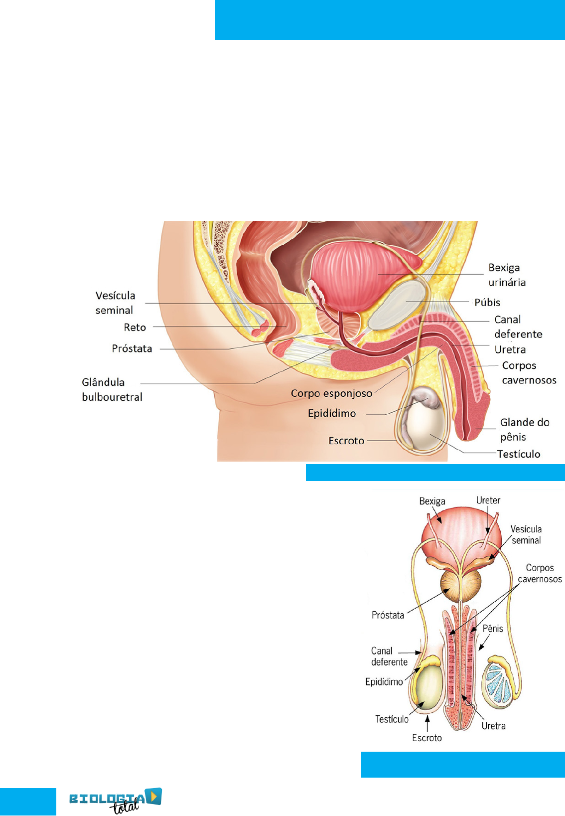 30 Sistema Reprodutor Humano. Estude com a gente! www.biologiatotal.com.br O sistema reprodutor é um termo aplicado a um grupo de órgãos necessários ou acessórios aos processos de reprodução. As unidades básicas da reprodução sexual são as células germinativas masculinas e femininas. Sistema Reprodutor Masculino O aparelho reprodutor masculino compreende os órgãos genitais externos (genitália externa) e os órgãos localizados no interior do corpo. A genitália externa é formada pelo pênis e pelo saco escrotal. Pênis Órgão copulador masculino que possui em seu interior três cilindros de tecido esponjoso (os corpos cavernosos), formado por veias e capilares sanguíneos modificados. Os corpos cavernosos ao se encher de sangue provocam a ereção do pênis. A região anterior do pênis forma a glande (a “cabeça”), onde a pele é fina e apresenta muitas terminações nervosas, o que determina grande sensibilidade à estimulação sexual. A glande é recoberta por uma prega protetora de pele chamada prepúcio, às vezes removida cirurgicamente por meio da circuncisão. Aparelho Reprodutor Masculino (vista lateral) Aparelho Reprodutor Masculino (vista frontal) 31 Si st em a Re pr od ut or H um an o Estude com a gente! www.biologiatotal.com.br Saco Escrotal Ou escroto, é uma bolsa de pele situada abaixo do pênis, dentro do qual se aloja o par de testículos, que são as gônadas masculinas. Os testículos permanecem a uma temperatura de 2 a 3ºC, inferior à temperatura corporal, o que é necessário para que os espermatozoides se formem normalmente. Homens que apresentam os testículos embutidos na cavidade abdominal (criptorquidia), não formam espermatozoides, sofrendo esterilidade. Os órgãos reprodutores masculinos internos são os testículos, os dutos condutores de espermatozoides (canais deferentes, canal ejaculador e uretra) e as glândulas acessórias (vesículas seminais, próstata e glândulas bulbouretrais). Testículos É neles que se formam os espermatozoides. São constituídos por tubos finos e enovelados (os túbulos seminíferos), e por camadas envoltórias de tecido conjuntivo. A espermatogênese (ou formação de espermatozoides) ocorre por diferenciação e meiose de células localizadas na parede interna dos túbulos seminíferos. Entre os túbulos, localizam-se as células intersticiais (ou células de Leydig), cuja função produzir testosterona, o hormônio sexual masculino. Espermatogênese Ocorre na parede dos túbulos seminíferos pela diferenciação de células chamadas espermatogônias, que, a partir da puberdade, passam a se multiplicar e vão se transformando em espermatócitos primários. Cada um destes origina dois espermatócitos secundários, que sofrem a segunda divisão meiótica e originam, cada um, duas espermátides que se diferenciam em espermatozoides. Os espermatozoides recém-formados caem na cavidade interna dos túbulos seminíferos e passam a se deslocar passivamente em seu interior, devido as contrações das paredes dos túbulos e do fluxo de líquido presente dentro deles. Ao lado, segue o esquema da espermatogênese. Espermatogênese Espermatozoide (gameta masculino) 32 Si st em a Re pr od ut or H um an o Estude com a gente! www.biologiatotal.com.br Epidídimo É um enovelado localizado sobre o testículo em comunicação direta com os túbulos seminíferos. Os espermatozoides recém-formados passam para o epidídimo, onde terminam sua maturação e ficam armazenados até sua eliminação durante o ato sexual. Canais Deferentes São dois tubos musculosos que partem dos epidídimos e sobem para o abdome, contornando a bexiga. Sob a bexiga, os vasos deferentes provenientes de cada testículo se fundem em um único tubo, o duto ejaculador, que desemboca na uretra. Vesículas Seminais São duas glândulas que produzem um líquido nutritivo, o fluído seminal, que contêm o açúcar frutose, cuja função é nutrir os espermatozoides. Sua secreção é lançada no duto ejaculatório e constitui cerca de 60% do volume total do fluído eliminado durante o ato sexual. A vesícula também secreta prostaglandinas. Próstata A próstata é a maior glândula acessória do sistema reprodutor masculino. Sua secreção é viscosa e alcalina; tem por função neutralizar a acidez da urina residual acumulada na uretra e também a acidez natural da vagina. A próstata envolve a porção inicial da uretra, onde lança sua secreção através de uma série de pequenos dutos. Glândulas Bulbouretrais (de Cowper) Durante a excitação sexual, elas liberam um líquido cuja função ainda não é muito bem conhecida. Acredita-se que a secreção destas glândulas contribua para a limpeza do canal uretral antes da passagem dos espermatozoides. Uretra A uretra é um duto comum aos sistemas reprodutor e urinário do homem. Ela percorre o interior do pênis, abrindo-se para o exterior na extremidade da glande. Ejaculação No clímax do ato sexual, o esperma ou sêmen, constituído pelos espermatozoides e pelas secreções das glândulas acessórias, é expulso do corpo por contrações rítmicas da parede dos dutos espermáticos. A eliminação dos espermatozoides é chamada ejaculação. Sistema Reprodutor Feminino O aparelho reprodutor feminino compõe-se de órgãos genitais externos formados pelos pequenos e grandes lábios vaginais e pelo clitóris, que, em conjunto, formam a vulva. Óvulo (gameta feminino) 33 Si st em a Re pr od ut or H um an o Estude com a gente! www.biologiatotal.com.br Os órgãos reprodutores femininos internos são os ovários, as tubas uterinas, o útero e a vagina. Ovários Os dois ovários da mulher estão situados na região das virilhas, um em cada lado do corpo. Tem forma de uma pequena azeitona, com 3 cm de comprimento e apresentam em sua porção mais externa (córtex ovariano), as células que darão origem aos óvulos. Ovulogênese É o processo de formação dos óvulos, inicia-se ainda antes do nasci