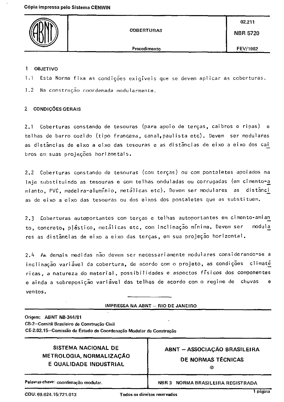 C6pia impressa pelo Sistema CENWIN 02.211 COBERTVRAS NBR 5720 Procedimento FEVl1982 1 OBJETIVO 1.1 Esta Norma fixa as condi.$es exigiveis que se devem aplicar as coberturas. 1.2 Na constru& coordenada modularmente. 2 CONDI@ES GERAIS 2.1 Coberturas constando de tesouras (para apoio de terqas, caibros e ripas) e telhas de barro cozido (tipo francesa, canal,paulista etc). Devem ser modulares as distkcias de eixo a eixo das tesouras e as distkcias de eixo a eixo dos cai bros em suas projqoes horizontais. 2.2 Coberturas constando de tesouras (corn teqas) ou corn pontaletes apoiados na laje substituindo as tesouras e corn telhas onduladas ou corrugadas (em cimento-a- mianto, PVC, madeira-aluminio, metalicas etc). Dcvem ser modulares as di st%ci as de eixo a eixo das tesouras ou dos eixos dos pontaletes que as substituem. 2.3 Coberturas autoportantes corn teqas e telhas autoportantes em cimento-amian to, concrete, pla‘stico, metslicas etc, corn inclinqao minima. Devem SCT modula res as distkcias de eixo a eixo das tersas, em sua projeG;o horizontal. 2.4 As demais medidas nao devem ser necessariamente modulares considerando-se a inclinqao varikel da cobertura, de acordo corn o projeto, as condi$%s cl imat ri cas , a natureza do material, possibilidades e aspectas fisicos dos componentes e ainda a sobreposi$ao variivel das telhas de acordo corn o regime de chuvas e ventos. IMPRESSA NA ABNT - RIO DE JANEIRO Origem: ABNT NB-344181 CB-2-Cornit Brasileiro de Constru& Civil CE-2:02.15-Comissiio de Estudo de CoordenaqBo Modular da Constru+ SISTEMA NACIONAL DE METROLOGIA. NORMALIZACAO E QUALIDADE INDUSTRIAL ABNT - ASSOCIACAO BRASILEIRA DE NORMAS TECNICAS 0 P&was-chave: coordena+io modular. CDU:69.024.15:721.013 I NBR 3 NORMA BRASILEIRA REGISTRADA Todos OS direitor resewados 1 pigina