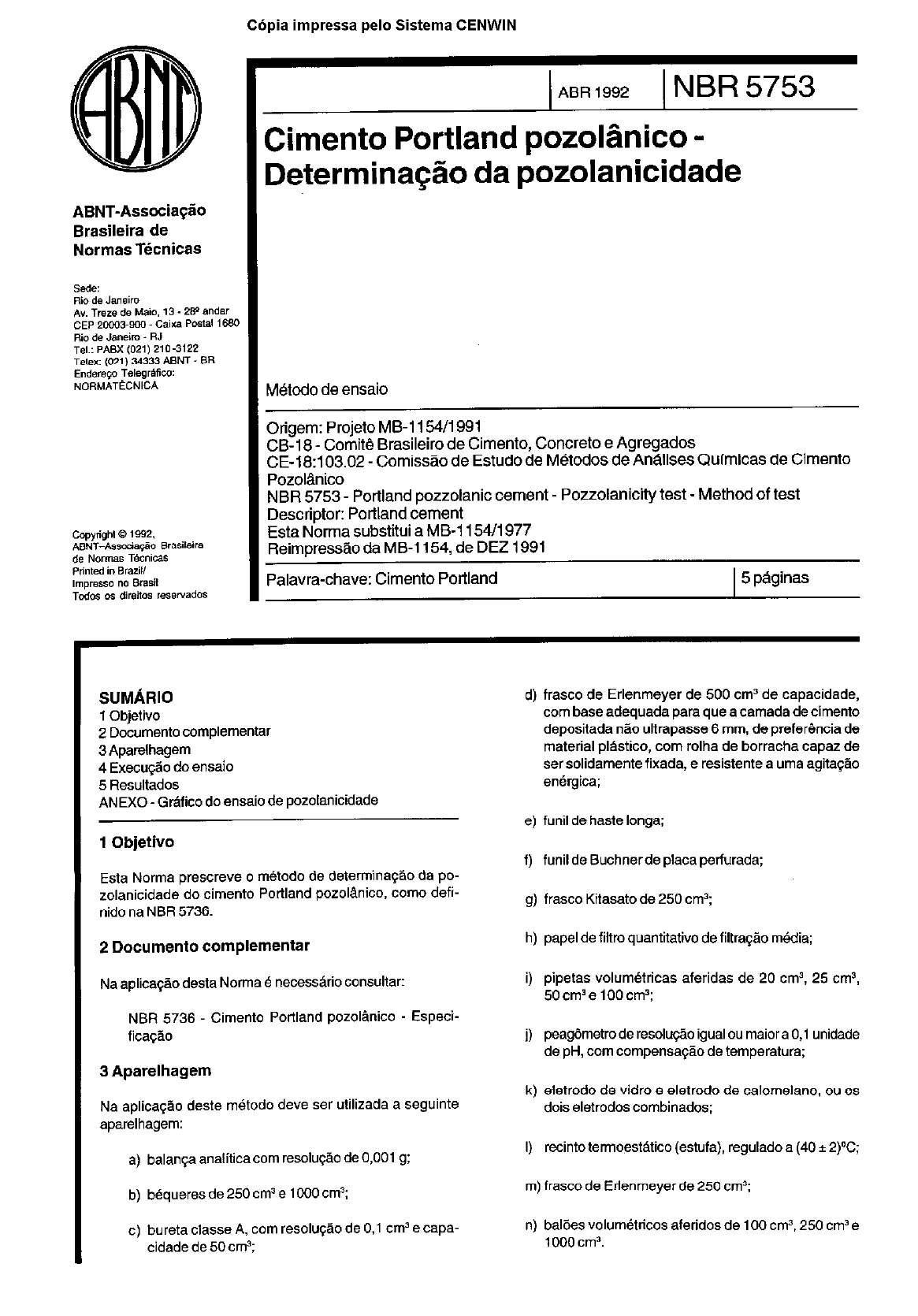 C6pia impressa pelo Sistema CENWIN ABNT-Associa@O Braaileira de Normas Trknicas ABR 1992 ( NBR 5753 Cimento Portland pozolhico - Determina@o da pozolanicidade M&do de ensaio Origem: Projeto MB-I 154/i 991 CB-I 8 - Cornit Brasileiro de Cimento, Concrete e Agregados GE-1 8:103.02 _ Comisstio de Estudo de M6todos de An6lises Quimicas de Cimento Pozol&ico NBR 5753 - Portland pozzolanic cement - Pozzolanicity test - Method of test Descriptor: Portland cement Esta Nona substiiui a MB-I 154/i 977 ReimpressSo da MB-l 154, de DE2 1991 Palavra-chave: Cimento Portland 1 5 paginas SUM&IO 1 Objetivo 2 Documento complementar 3 Aparelhagem 4 Ex%cu@o do ensaio 5 Resultados ANEXO - Gtifico do ensaio de pozolanicidade 1 Objetivo E%t% Norma prescreve 0 m&do de detennina$~o da po- zolanicidade do cimento Portland pozol&ico, corn0 defi- nido na NBR 5736. d) fiasco de Edenmeyer de 500 cm~ de capacidade, corn base adequada par% que a camada de cimento depositada nZo ultrapasse 6 mm, de prefer&&a de material pl&tico, corn rolha de borracha capaz de ser solidamente fixada, e resistente a urn% agita@ao %n&gica; e) funil de haste longa; 1) funil de Buchnerde placa perfurada; g) fiasco Kitasato de 250 cn?; 2 Document0 complementar N% aplica@io d&a Norma B necesstio consultar: h) papel de filtro quantitative de filtra@o m&Ua; i) pipetas volum&ricas aferidas de 20 cm3, 25 cm3, 50 cm’ e 100 cm’; NBR 5736 Cimento Portland pozolanico - Especi- fica@o 3 Aparelhagem i) pea@m%tro de r%solu@o igual ou maiora 0,l unidade de pH, corn comp%nsa@o de temperatura; Na aplica@o d&e m&do dew? ser utilizada a seguinte aparelhagem: a) balanqa analitica corn resolu@~o de 0,001 g: b) bequeres de 250 cm3 e 1000 cm”; C) bureta classe A, corn resolu~Bo de 0.1 cm’% capa- cidade de 50 cm’; k) eletrodo de vidro e eletrodo de calomelano. ou OS dois eletrodos combinados; I) recinto temwst~~ico (estufa), regulado a (40 + 2)T; m) fiasco de Erlenmeyer de 250 cm>; n) bal6es volum&icos aferidos de 100 cm3. 250 cm3 e 1000 cm3. C6pia imwessa ~elo Sistema CENWIN NBR 5753/l 992 4 Execu~+~ do ensaio 4.1 Fieagentes Na aplica@c desta Norma devem ser utilizadcs cs seguin- tes reagentes: a) dgua destilada rec&m-fervida; b) indicadcrde alaranjadc-de-metila; c) indicadcrde azul-de-hidrcxinaftcl; d) dcidc clcridricc (HCI), d= 1,19 e 37%; e) sclu~~c de bcidcclcridricc, 0,l N; f) sclu~c de clcretc de c&lcic, 0.2 M; g) sclu~Zc de sal diss6dicc de dcidc etilencdiaminc te- traceticcdiidratc (EDTA Na) 0,02 M M.M 372.24; h) sclu@c de hidrbxidc de pct8ssic,20%; i) sclu@c detrietanclamina, 50%. 4.2.1 Solu~Bo de indfcador de alaranjadode-metila Dissolver 5 mg de indicadcr de alaranjadc-de-metila em 50 cm3 de dgua. 4.22 Solu~Bo de acid0 clorfdrico 0,l N Transferir 6,5 cm3 de HCI para urn balk vclum&icc de 1000 cm3, ccntendc 500 cm’ de bgua, ccmpletar c volume para 1000 cm3 e hcmcgeneizar. 4.2.2.1 Padroniza@o Pesar (2.6500 + 0,OlOO) g de Na,CO, anidrc, tratado pre- viamente entre 27oOC e 300DC, per 40 min. Dissolver e diluir em b&c vclumetricc at8 perfazer 500 cm3. Hcmcgeneizar bem. Transferir, corn auxilic de uma pipeta, 25 cm*desta sclu@o para c fiasco de Erlenmeyer de 250 cm’, adicionar duas cu tr& gctas de alaranjadc-de-metila e titular corn sclu~~c de HCI, at8 a ccr mudar do amarelc para c ala- ranjadc. [= 25 volume gastc 4.2.3 Solu$Bo de hidr6xido de potesslo 20% Dissolver e diluir 200 g de KOH em tigua, at8 pedazer 1000cm3desclu@ic. 4.2.4 Solugio de trietanolamina 50% Cobcar 500 cm3 de Bgua em urn b&quer e adicicnar 500 cm’ de trietanclamina a uma temperatura acima de 22oc. 4.2.5 Solu@io de indicador azul-de-hfdroxlnaftol Dissolver e diluir 1 g de azul-de-hidroxinaftcl em 100 cm3de sclu~c de trietanolamina preparada de acordc corn 4.2.4. 4.2.6 Solu@c de clcreto de ctilcio 092 M Tcmar cerca de 1,5 g de C&O,, deixar em estufa cu mufla a 250DC, per 3 h. Esfriar em dessecadcr, pesar 0,500O g para urn bbquer e, vagarcsamente, adicicnar 2 cm3 de HCI (ver 4.1-d). Adicionar 200 cm3 de dgua, aquecer para eliminar tcdo c CO,, passar para c balHc volum&ricc de 250 cm3 I?, depois de fric, acedar c volume corn &gua. 4.2.7 Solu.+ de EDTA-Na, 0,02 M Pesar 7,4446 g de EDTA-Na, dissolver e diluir em balSc vclum&icc de 1000 cm3. Esta sclu~Bc dew ser armaze- nada em frascc de pclietilenc. 4.2.7.1 Padronlza@c Pipetar 20 cm3da sclu~Bc de clcreto de celcic (preparada de accrdc corn 4.2.6) e transferir para c bequer de 250 cm3, adicicnar 50 cm” de dgua e sclu~Bc de KOH (preparada de accrdc corn 42.3). at6 pH de 128 a 13,0. Adicionar cerca de cincc gctas de indicadcr azul-de-hidrcxinaftol (prepara- do de accrdc corn 4.2.5) e titular corn solu~Hc de EDTA-Na, at6 atingir uma colora@ azul intensa f, = 20 volume gastc 4.3 Princfplo do m&do@, 4.3.1 No ensaic descritc, a pczclanicidade B avaliada, ccmparandc a quantidade de hidrbxidc de c&lcio presente na fase liquida em ccntatc corn c cimento hidratadc corn a quantidade de hidrkidc de celcic que pcderia saturar urn meic da mesma alcalinidade. 4.3.2 Para realizar c ensaic, 6 ccnveniente ccnhecer a sclu- bilidade do hidrbxidc de ctilcic a 40°C em uma solu~~c cuja alcalinidade livre varia de zerc a cerca de 100 milimcles de baseforte pcrlitrc. 4.4 Procedimento 4.4.1 lntroduzir no frascc de Erlenmeyer. per meic de uma pipeta, 100 cm3 de dgua destilada e cclccar c frascc arrc- lhadc no recintc termcest8ticc, at6 alcan$arc equilibric de temperatura (cercade 1 h). 4.4.2 Intrcduzir, em seguida, no frascc de Edenmeyer, per meic de urn funil de haste long& (20 + 0.01) g do cimentc a ensaiar. Fechar em seguida c recipiente. fixandc bem a rclha. Agitarenergicamentedurante20s, afimde impedira fcrma@c de aglcmeradcs de cimentc. Equipe Auditora C6pia impressa pelo Sistema CENWIN 4.4.3 Recolocar o fiasco de Erlenmeyer no recinto termoes- Utica, assegurando que o fundo esteja perfeitamente hori- zontal, de forma que a camada de cimento que se deve depositar tenha a espessura uniforme. Realizar todas as opera@es fora do recinto termpest8tico. 