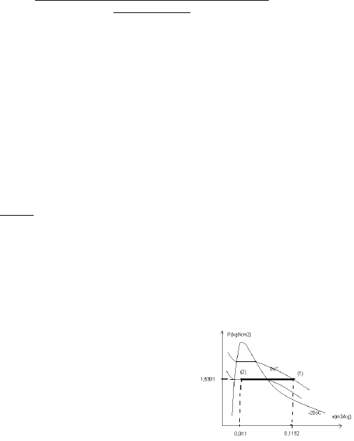 FACULDADE DE ENGENHARIA MECÂNICA SOUZA MARQUES TERMODINÂMICA II 1ª Lista de Exercícios - Trabalho – Gabarito 22/08/2013 Profª Rosa Maria Nielsen 01 - Em um aparelho de ar condicionado o fluido refrigerante R-12 está a uma temperatura inicial (estado 1) de 0ºC e é resfriado isobaricamente no condensador até a temperatura final de -20ºC e título final de 10% (estado 2). Determine: a. A pressão (kPa) e o volume específico (m3/kg) do refrigerante no estado (2), após o resfriamento. b. Esquematizar num diagrama pressão versus volume específico o processo de resfriamento do refrigerante, indicando para os estados (1) e (2), os valores de pressão, volume específico e temperatura. c. O trabalho específico realizado durante o processo. Solução: a. Estado (2): vapor úmido de R-12 a –20o C, 10%. Tabela B.3.1, tem-se: p2 = 150,93 kPa L = 0,000685 m3/kg V = 0,108847 m3/kg 2 = L+x (v - L) 2 = 0,000685 + 0,1 (0,108847 - 0,000685) → 2 = 0,011 m3/kg b. Estado (1): p1 = p2 = 150,93 kPa (processo isobárico) e T1 = 0o C, portanto, vapor superaquecido. Tabela B.3.2: 1 = 0,119980 m3/kg Diagrama p x : c. w = p (2 1) = 150,93 (0,011 – 0,119980) → w = - 16,45 kJ/kg 02 - Um cilindro equipado com êmbolo sem atrito contém 1,5 kg de ar inicialmente a 1,0 kgf/cm2 e 35ºC. Em certo instante, vários pesos são colocados sobre o êmbolo e o ar é comprimido isotermicamente, até que a pressão final seja de 6,0 kgf/cm2. Calcular o trabalho realizado durante este processo, em kJ. Solução: Compressão isotérmica de gás ideal: 1W2 = p1 V1 ln (V2/V1) V1 = m R T = 1,5 . 0,287 . 308 = 1,326 m3 p1 100 p1 V1 = p2 V2 → 100 . 1,326 = 600 . V2 → V2 = 0,221 m3 1W2 = p1 V1 ln (V2/V1) = 100 . 1,326 ln (0,221/1,326) 1W2 = - 237,59 kJ 03 - O cilindro mostrado na figura abaixo contém 0,2 kg de vapor úmido de água a 150ºC. O êmbolo desliza sem atrito e possui massa desprezível. O volume inicial é de 20 litros. Transfere-se calor ao sistema até que o título atinja o valor de 90%. Determine: a. O volume final (m3). b. O trabalho realizado pela água durante o processo (kJ). Solução: a. Estado (1): vapor úmido de água a 150o C. 1 = V1/m = 0,020/0,2 = 0,1 m3/kg Tabela B.1.1, tem-se: p1 = 475,9 kPa Processo isobárico: p1 = p2 L = 0,001090 m3/kg V = 0,39278 m3/kg 2 = L+x (v-L) 2 = 0,001090 + 0,9 (0,39278 - 0,001090) → 2 = 0,3536 m3/kg V2 = 2 . m = 0,3536 . 0,2 → V2 = 0,07072 m3 b. 1W2 = p (V2 - V1) = 475,9 (0,07072 – 0,020) 1W2 = 24,14 kJ 04 - Um cilindro, com êmbolo móvel, contém 2 kg de água líquida saturada a 5,0 bar. Calor é fornecido à água num processo isobárico até que dentro do recipiente exista a mesma quantidade, em massa, de vapor saturado e líquido saturado. Pede-se: a. O título no estado inicial e no estado final. b. O trabalho realizado pelo sistema durante o processo. Solução: a. Estado (1): água líquida saturada a 5,0 bar. Tabela B.1.1, tem-se: p1 = 500 kPa L = 0,001093 m3/kg V = 0,3749 m3/kg 1 = L = 0,001093 m3/kg → x1 = 0 x2 = mV/(mV + mL) = 0,5 → x2 = 50% 2 = 0,001093 + 0,5 (0,3749 - 0,001093) → 2 = 0,187997 m3/kg b. 1W2 = m p (2 - 1) = 500 . 2 (0,187997 - 0,001093) 1W2 = 186,90 kJ