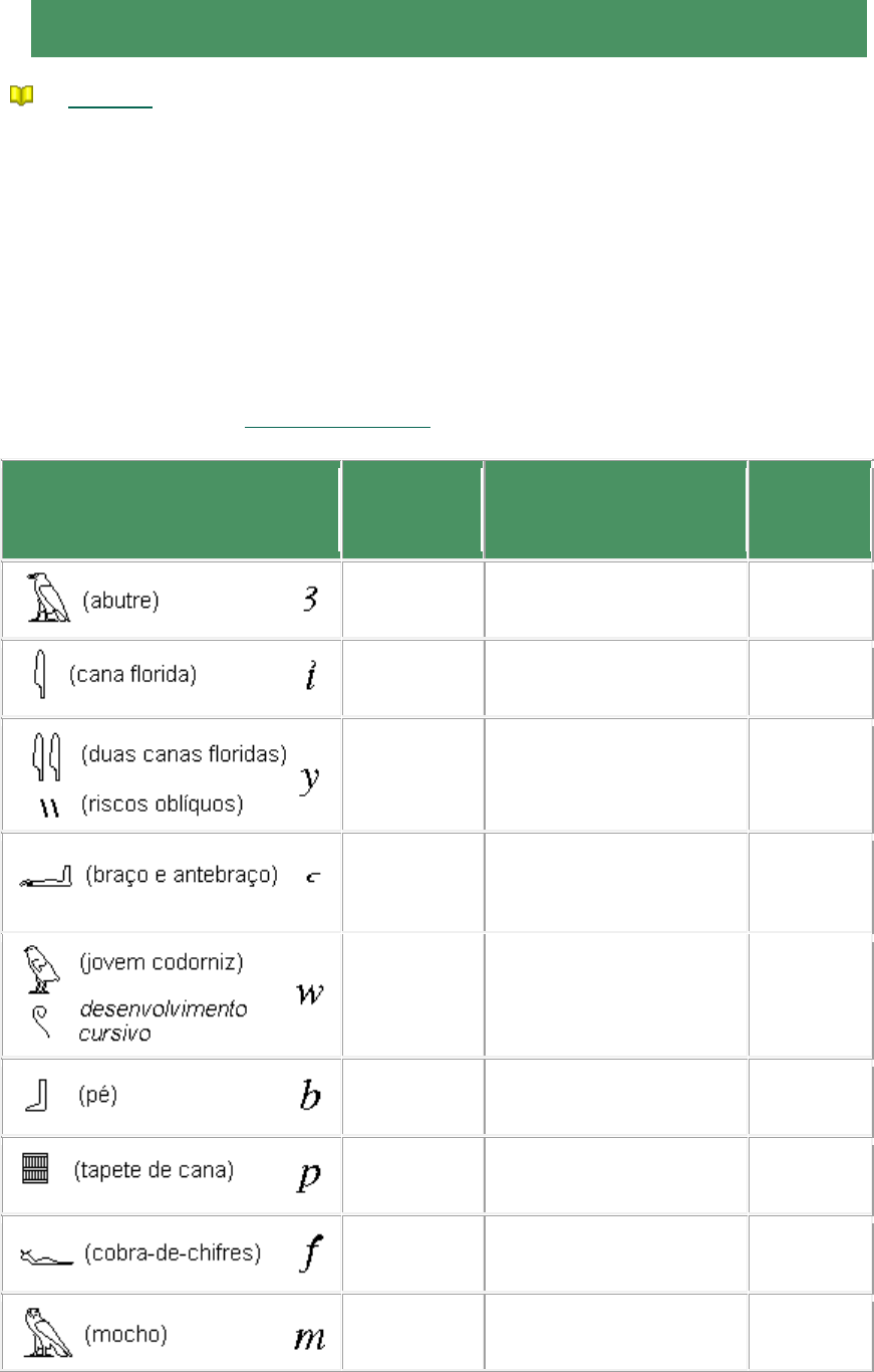 Alfabeto do Egípcio Médio > Entrada > Alfabeto Aqui estão os 26 hieróglifos do chamado "alfabeto" egípcio, dispostas na ordem convencionada pelos linguistas. São estes os sinais hieroglíficos que mantiveram o seu valor fonético praticamente inalterado durante mais de 3000 anos, desde os tempos pré-dinásticos até ao século 5 d.C. Tal como no Hebreu e Árabe actuais (que pertencem ao grupo das línguas Camito-Semíticas), a antiga língua egípcia não continha vogais que pudessem ser escritas. Daí todos os hieróglifos serem considerados consoantes. As excepções são A, i, y, w e a, que são consideradas semi-vogais, ou consoantes fracas. Veja abaixo também a Legenda da tabela . Hieróglifo e Transliteração Transcrição Valor Sonoro e outros equivalentes Código de Gardiner A a em pai (paragem da glote) G1 i semelhante a i em rio M17 y i em rio M17A Z4 a a (Ayin das línguas semíticas) D36 w u em rua G43 Z7 b b em bota D58 p p em pá Q3 f f em faca I9 m m em mel G17 n n em noite N35 S3 r r em trio D21 h h como na exclamação "Ah!" O4 H H ligeiramente gutural V28 x j no espanhol "mujer" ( kh ) Aa1 X ch no alemão "ich" ( h ) F32 s s em sete O34 S29 S ch em chuva ( ch, sh ) N37 q semelhante a c em cão N29 k c em cão V31 g g em gato W11 t t em tio X1 T tch ao espirrar "Atchim!" ( tj ) V13 d d em dado D46 D dj em adjectivo ( dj ) I10 Como se pode verificar, algumas letras do alfabeto de transliteração são escritas com letras do alfabeto latino. Desta maneira, este alfabeto garante uma utilização mais alargada na maioria das escritas ocidentais actuais, e permite o intercâmbio fácil de textos em ambiente informático. Limita-se assim o uso de sinais diacríticos. O quadro seguinte representa as letras do alfabeto de transliteração que não fazem parte do alfabeto latino, e a respectiva transcrição equivalente: Noutros casos, existe mais do que um hieróglifo para representar o mesmo valor fonético, como nas letras m, w e s. Legenda Hieróglifo - sinal visual representando objectos animados e inanimados, desenhados o mais próximo possível da realidade. Transliteração - alfabeto criado por académicos que constitui uma aproximação dos hieróglifos ao alfabeto latino e adoptado por convenção internacional. Note-se que a maioria das vogais não possui correspondência na língua portuguesa. Transcrição - equivalência em caracteres ASCII descritos no Manuel de Codage, um conjunto de regras para a troca facilitada de textos egípcios entre usuários de computadores. Evita-se assim o uso dos sinais diacríticos da transliteração, na sua maioria não utilizados nos alfabetos latinos modernos. Valor Sonoro - pronunciação aproximada da letra na língua portuguesa, quando possível. Na maior parte das letras, puramente convencional. Outros Equivalentes - outras maneiras comuns de representar a letra nas línguas portuguesa e inglesa, esta última por ser universal na transmissão de textos a nível académico. Código de Gardiner - código único do hieróglifo, segundo a classificação na Lista de Sinais de Gardiner. Lista de Sinais de Gardiner de hieróglifos egípcios > Entrada > Lista de Gardiner A - Homem e suas ocupações B - Mulher e suas ocupações C - Divindades Antropomórficas D - Partes do corpo humano E - Mamíferos F - Partes de Mamíferos G - Aves H - Partes de aves I - Animais anfíbios, etc. K - Peixes e partes de peixes L - Invertebrados e animais menores M - Árvores e Plantas N - Céu, terra e água O - Edifícios e partes de edifícios P - Barcos e partes de barcos Q - Móveis domésticos e funerários R - Móveis de templos e emblemas S - Coroas, vestuário, adornos, etc. T - Guerra, caça, matadouro U - Agricultura, ofícios e profissões V - Corda, fibra, cestos, sacos, etc. W - Vasos de pedra e cerâmica X - Pão e bolos Y - Escrita, jogos, música Z - Traços, figuras geométricas, etc. Aa (ou J) - Não classificados Os hieróglifos egípcios esão usualmente ordenados segundo o sistema de classificação proposto pelo egiptologista britÂnico A.H. Gardiner (1879-1963), que o apresentou ao mundo nas várias edições do seu livro Egyptian Grammar, de 1927 a 1957. Este sistema apresentou a melhor solução para organizar os hieróglifos egípcios conhecidos, que são encontrados frequentemente em textos de Egípcio Médio, a fase considerada clássica da língua egípcia. Estes textos foram escritos com hieróglifos desde cerca de 1200 a.C. até ao século V da era cristã. Gardiner criou uma lista de quase 700 sinais hieroglíficos, que dividiu em várias categorias simples de compreender, tais como "Mamíferos", "Pássaros", "Árvores e Plantas", etc. A cada categoria foi atribuída uma letra do alfabeto (A, B, C,...), e dentro de cada categoria os sinais são numerados sequencialmente (por ex.: A1, A2, A3, etc). A tabela ao lado descreve as categorias criadas por Gardiner, com todos os seus sinais hieroglíficos. O método de classificação proposto por Gardiner tornou-se a base de codificação para todos as aplicações de de processamento de textos hieroglíficos que apareceram depois de 1985. Nas aplicações de software descritas neste sítio são fornecidos todos os sinais classificados por Gardiner, e muitos outros. Gardiner também avançou e desenvolveu o conhecimento da língua e escritas egípcias. Apesar de o seu trabalho estar hoje ultrapassado em muitos aspectos, particularmente no estudo do sistema verbal, continua a ser um referência muito importante no estudo da egiptologia. Gardiner definiu a base que ajudou a criar o padrão para a partilha de textos hieroglíficos na actualidade. É verdade que Gardiner classificou apenas cerca de 10% do número total de hieróglifos actualmente conhecidos, pois a quantidade hoje descrita ascende a mais de 6900 glifos. Muitos destes sinais hieroglíficos suplementares foram descritos pelo CCER na Holanda, no seu livro Hieroglyphica. Esses hieróglifos constituem hoje a 