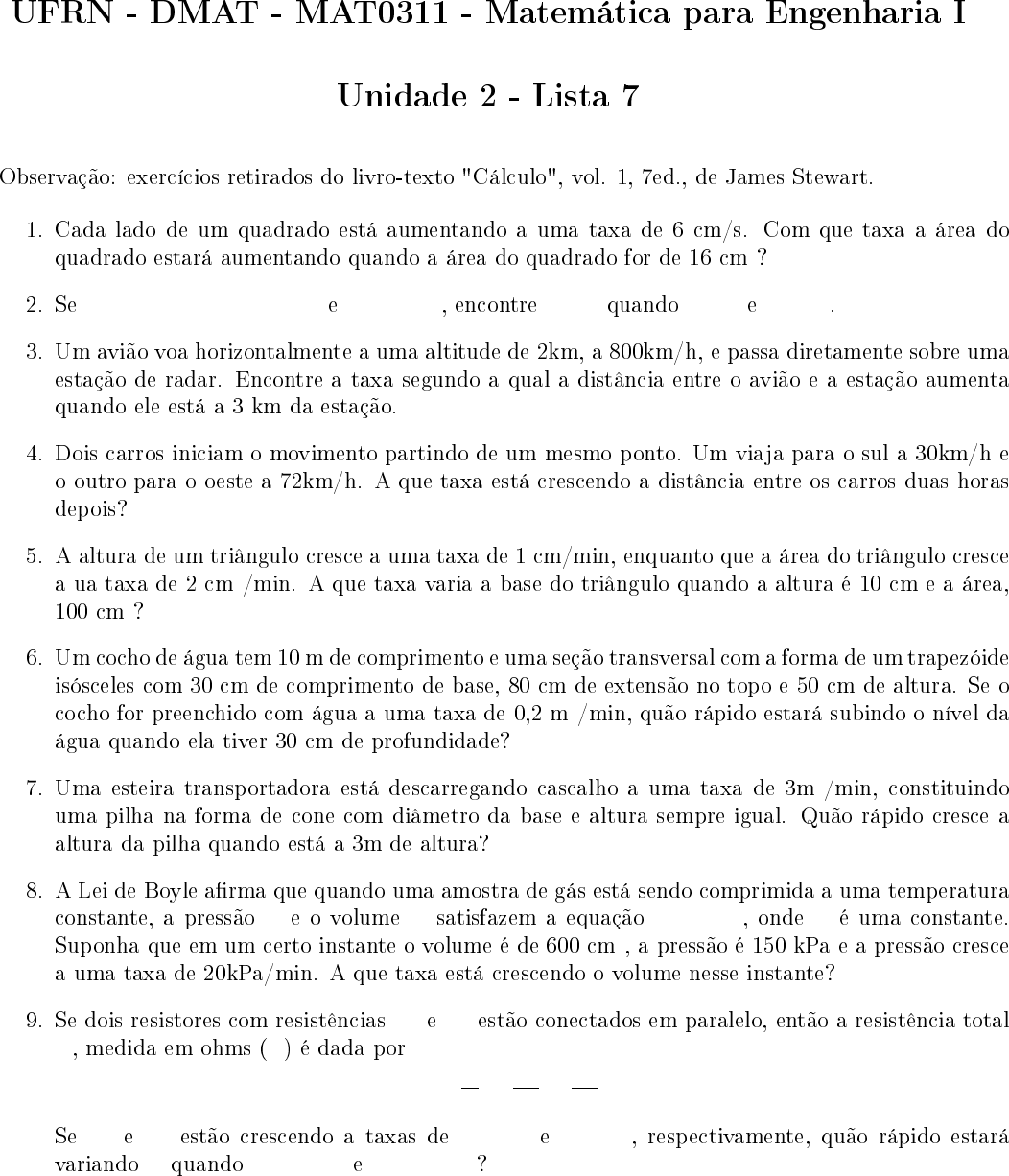UFRN - DMAT - MAT0311 - Matemática para Engenharia I Unidade 2 - Lista 7 Observação: exercícios retirados do livro-texto "Cálculo", vol. 1, 7ed., de James Stewart. 1. Cada lado de um quadrado está aumentando a uma taxa de 6 cm/s. Com que taxa a área do quadrado estará aumentando quando a área do quadrado for de 16 cm 2 ? 2. Se z2 = x2 + y2, dx/dt = 2 e dy/dt = 3, encontre dz/dt quando x = 5 e y = 12. 3. Um avião voa horizontalmente a uma altitude de 2km, a 800km/h, e passa diretamente sobre uma estação de radar. Encontre a taxa segundo a qual a distância entre o avião e a estação aumenta quando ele está a 3 km da estação. 4. Dois carros iniciam o movimento partindo de um mesmo ponto. Um viaja para o sul a 30km/h e o outro para o oeste a 72km/h. A que taxa está crescendo a distância entre os carros duas horas depois? 5. A altura de um triângulo cresce a uma taxa de 1 cm/min, enquanto que a área do triângulo cresce a ua taxa de 2 cm 2 /min. A que taxa varia a base do triângulo quando a altura é 10 cm e a área, 100 cm 2 ? 6. Um cocho de água tem 10 m de comprimento e uma seção transversal com a forma de um trapezóide isósceles com 30 cm de comprimento de base, 80 cm de extensão no topo e 50 cm de altura. Se o cocho for preenchido com água a uma taxa de 0,2 m 3 /min, quão rápido estará subindo o nível da água quando ela tiver 30 cm de profundidade? 7. Uma esteira transportadora está descarregando cascalho a uma taxa de 3m 3 /min, constituindo uma pilha na forma de cone com diâmetro da base e altura sempre igual. Quão rápido cresce a altura da pilha quando está a 3m de altura? 8. A Lei de Boyle afirma que quando uma amostra de gás está sendo comprimida a uma temperatura constante, a pressão P e o volume V satisfazem a equação PV = C, onde C é uma constante. Suponha que em um certo instante o volume é de 600 cm 3 , a pressão é 150 kPa e a pressão cresce a uma taxa de 20kPa/min. A que taxa está crescendo o volume nesse instante? 9. Se dois resistores com resistências R1 e R2 estão conectados em paralelo, então a resistência total R, medida em ohms (Ω) é dada por 1 R = 1 R1 + 1 R2 . Se R1 e R2 estão crescendo a taxas de 0, 3Ω/s e 0, 2Ω/s, respectivamente, quão rápido estará variando R quando R1 = 80Ω e R2 = 100Ω? 10. Uma câmera de televisão está posicionada a 1200 m de uma base de lançamento de foguete. O mecanismos de foco da câmera também deve levar em conta o aumento da distância entre a câmera e o foguete em subida. Vamos supor que o foguete suba verticalmente e com uma velocidade de 200m/s quando já estiver subido 900m. (a) Quão rápido estará variando a distância da câmera ao foguete naquele momento? (b) Se a câmera de televisão se mantiver sempre na direção do foguete, quão rápido estará vari- ando o ângulo de elevação dela naquele mesmo momento? Respostas 1. 48 cm 2 /s 2. ±46/13 3. 800 √ 5/3km/h 4. 78 km/h 5. 1,6 cm/min 6. 10/3 cm/min 7. 4/(3pi)m/min 8. 80cm3/min 9. 107/80Ω/s 10. (a) 120 m/s (b) ≈ 0, 107rad/s