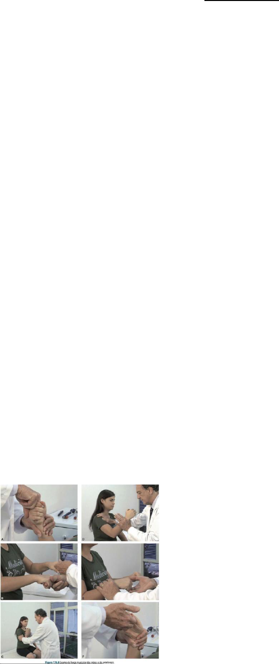 Tônus Muscular O tônus pode ser considerado como o estado de tensão constate a que estão submetidos os músculos tanto em repouso, tônus de postura, como em movimento, tônus de ação O exame do tônus é realizado com o paciente deitado e em completo relaxamento muscular, obedecendo à seguinte técnica Inspeção: Verifica-se a existência ou não de achatamento das massas musculares de encontro ao plano do leito. É mais evidente nas coxas e só tem valor significativo na acentuada diminuição do tônus Palpação das massas musculares: Averígua-se o grau de consistência muscular, a qual se mostra aumenta nas lesões motoras centrais e diminuída nas periféricas Movimentos passivos: Imprimem-se movimentos naturais de flexão e extensão nos membros e observam-se: A passividade: Se há resistência (tônus aumentado) ou se a passividade está aquém do normal (tônus diminuído) A extensibilidade: Se existe ou não exagero no grau de extensibilidade da fibra muscular. Assim, na flexão da perna sobre a coxa, fala-se em diminuição do tônus quando o calcanhar toca a região glútea de modo fácil Balanço passivo: O examinador, com as suas duas mãos, segura e balanço o antebraço do paciente, observando-se se a mão movimenta de forma normal, exagerada (hipotonia) ou diminuída (hipertonia). Pode ser observado em MMII, segurando a perna e observando o balanço dos pés A diminuição do tônus (hipotonia) ou seu aumento (hipertonia) devem ser registrados com as respectivas graduações e sede. Ex.: Moderada hipotonia nos MMII; acentuada hipertonia nos membros direitos. Na hipotonia observam-se achatamento das massas musculares no plano do leito, consistência muscular diminuída, passividade aumentada, extensibilidade aumentada. É encontrada nas lesões do cerebelo, no coma profundo, no estado de choque do SNC, nas lesões das vias de sensibilidade proprioceptiva consciente, das pontas anteriores da medula, nos nervos, na coreia aguda e em algumas encefalopatias (mongolismo) Na hipertonia encontram-se consistência muscular aumentada, passividade diminuída e extensibilidade aumentada. Presente em lesões das vias motoras piramidais e extrapiramidal. Força Muscular O paciente procura fazer os mesmos movimentos mencionados na motricidade voluntária, porém, com oposição aplicada pelo examinador. Abrir e fechar a mão, estender e fletir o antebraço, abduzir e elevar o braço, fletir e estender a perna e ou pé e fletir a coxa. Não havendo indícios de doença que justifique examina particularizado de determinados segmentos, esse exame é realizado rotineiramente de modo global Nos casos de discreta ou duvidosa deficiência motora dos membros, realizam-se as denominadas provas deficitárias, representadas pelas provas de Barré, Mingazzini e dos braços estendidos. O resultado do exame da força pode ser registado de duas maneiras: ambas anotando a graduação e a sede Literalmente: Força normal dos quatro membros Força discretamente diminuída na extensão do antebraço direito Forca moderadamente diminuída na flexão da perna esquerda Forca muito reduzida na extensão do pé direito Força abolida na flexão da coxa esquerda Percentualmente 100% força normal 75%: movimento completo contra a força da gravidade e contra certa resistência aplicada pelo examinador 50%: movimento contra a força da gravidade 25% movimento completo sem a força da gravidade 10%: discreta contração muscular 0%: nenhum movimento