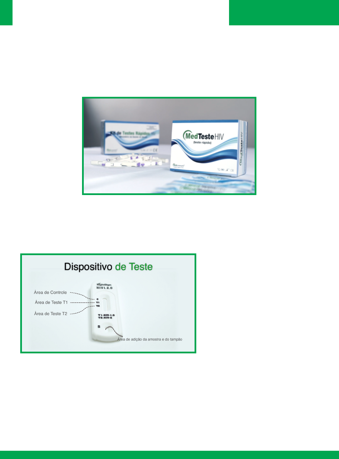MEDTESTE HIV | TESTE RÁPIDO PARA DETECÇÃO DE ANTICORPOS ANTI-HIV Finalidade O MedTeste HIV é um imunoensaio cromatográfico rápido para a detecção qualitativa dos anticorpos do Vírus da Imunodeficiência Humana (HIV) tipo 1, tipo 2 e subtipo O no sangue total humano, soro ou plasma, auxiliando no diagnóstico das infecções por HIV. O teste é um imunoensaio qualitativo baseado em membrana. O dispositivo de teste é composto por quatro áreas: a área S, onde são aplicadas a amostra e a solução tampão; as áreas de teste T1 e T2, onde ocorre a reação e a área de controle C, local de controle da viabilidade do teste. » Área S: onde são aplicadas a amostra e a solução tampão; » Área de Controle (C): local de controle do teste; » Áreas de Teste (T1 e T2): locais em que ocorre a reação. A membrana que compõe o teste é pré-revestida com antígenos recombinantes de HIV nas regiões das linhas de teste, T1 e T2, e com antígenos recombinantes de HIV conjugados a ouro coloidal, que será responsável pela coloração do teste. A linha de teste T1 é pré-revestida com antígeno do HIV-1 e subtipo O e a linha de teste T2 é pré-revestida com o antígeno do HIV-2. Durante o teste, a amostra de sangue total, soro ou plasma e solução tampão migram por capilaridade através da membrana, reagem com os antígenos recombinantes de HIV conjugados a ouro coloidal e continuam a migração através da membrana, reagindo com os antígenos recombinantes de HIV nas linhas de teste. Se a amostra contiver anticorpos anti-HIV-1 e/ou anti-Subtipo O, ou anti-HIV-2, uma linha colorida aparecerá na região da linha de teste T1 ou T2, respectivamente. Se a amostra contiver anticorpos anti-HIV-1 e/ou anti-Subtipo O e anti-HIV-2, duas linhas coloridas aparecerão nas regiões das linhas de teste T1 e T2. As linhas coloridas que aparecem nas áreas de teste indicam um resultado reagente. Se a amostra não contiver anticorpos anti-HIV-1, anti-Subtipo O e/ou anti-HIV-2, nenhuma linha colorida aparecerá na região da linha de teste, indicando um resultado não reagente. Uma linha colorida deve sempre aparecer na área de controle do teste. A presença desta linha indica que o volume da amostra foi suficiente para a realização do teste e que ele é válido. Materiais fornecidos com o kit MedTeste HIV 1. Instrução de Uso 2. Dispositivo de Teste 3. Solução Tampão 4. Pipeta 5. Lanceta descartável SOLUÇÃO TAMPÃO PIPETA LANCETA MEDLEVENSOHN TESTE RÁPIDO HIV Materiais necessários, mas não fornecidos com o kit MedTeste HIV Equipamentos de Proteção Individual (EPI’s) indispensáveis 1. Luvas descartáveis 2. Jalecos 1. Caixa coletora perfurocortante 2. Cronômetro 3. Álcool 70% 4. Algodão Precauções » O MedTeste HIV é um teste somente para uso profissional de diagnóstico in vitro. É recomendado não utilizá-lo após a data de validade indicada no rótulo. » Não coma, beba ou fume na área onde as amostras ou kits serão manipulados. » Não utilize o teste caso a embalagem esteja danificada. » Contra riscos residuais, trate todas as amostras como materiais potencialmente infectantes, portanto, as normas universais de biossegurança devem ser adotadas, incluindo o uso de equipamentos de proteção individual. Observe as precauções estabelecidas contra perigos microbiológicos durante todo o procedimento e siga os procedimentos padrão para a disposição das amostras. » Utilize roupas de proteção como jaleco, luvas descartáveis e, se necessário, proteção para os olhos enquanto as amostras são analisadas. » O teste usado deve ser descartado de acordo com as regulamentações locais. » Umidade acima de 60% e temperaturas acima de 30ºC podem afetar negativamente os resultados. » Descarte todo o material utilizado em recipiente para descarte de materiais com risco biológico. As lancetas utilizadas para punção devem ser descartadas separadamente em recipiente adequado para resíduos perfurocortantes. Armazenamento e Estabilidade do MedTeste HIV O kit de teste deve ser armazenado a temperatura ambiente ou refrigerado (2 a 30ºC). O teste e seus componentes são estáveis até a data de validade indicada no rótulo. O dispositivo de teste deve permanecer na embalagem fechada até o momento da utilização. Após aberto, é recomendado utilizar o teste em até 1 hora. Os kits não devem ser congelados. Realização do teste através de punção digital 01. Para a realização do teste é necessário que o kit e as amostras estejam a temperatura ambiente, entre 15-30°C. 02. Remova o dispositivo de teste da embalagem e coloque-o em uma superfície limpa e nivelada. 03. Identifique o dispositivo de teste com as iniciais do nome do paciente. 04. Selecione um dos dedos, indicador, médio ou anelar para fazer a punção. 05. Massageie a mão no sentido do punho para o dedo e passe álcool setenta porcento (70%) na ponta do dedo para assepsia. 06. Remova a ponta da lanceta com firmeza e pressione a mesma na lateral da ponta do dedo. Limpe o primeiro sinal de sangue. 07. Aperte o bulbo da pipeta e por sucção preencha o equivalente a um terço da pipeta. Evite a formação de bolhas de ar. 08. Dispense duas gotas da amostra de sangue na área S, pressionando a pipeta. 09. Havendo ou não sobra de sangue na pipeta descartar em local apropriado. ATENÇÃO! Não ultrapasse 20 minutos para a interpretação do resultado. A leitura dos resultados após 20 minutos pode indicar resultados falso-positivos. 11. Dispare o cronômetro e após 10 minutos leia o resultado. 10. Segure verticalmente o frasco de solução tampão e adicione duas gotas na área S. Interpretação dos resultados RESULTADO NÃO REAGENTE Apenas uma linha colorida aparece na região de controle (C). Nenhuma linha colorida deve aparecer nas regiões de teste T1 e T2. RESULTADO REAGENTE PARA HIV-1 Uma linha colorida aparece na região de controle (C) e outra linha colorida aparece na região de teste T1.