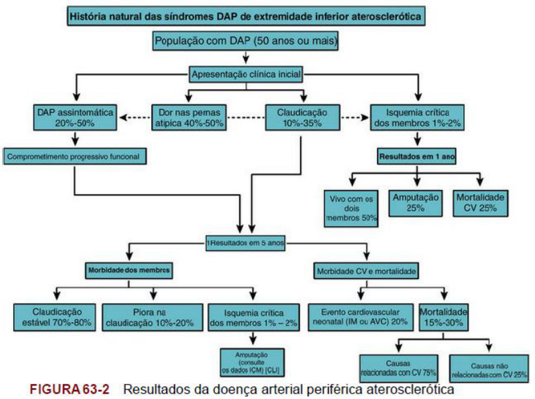 Doença oclusiva arterial periférica Epidemiologia Doença arterial oclusiva periférica (DAOP), comumente chamada de doença arterial periférica (DAP)ou doença vascular periférica (DVP), refere-se à obstrução ou deterioração das artérias, exceto as que suprem o coração e dentro do cérebro. Existem vários processos patológicos que manifestam seus efeitos na circulação arterial. O denominador comum desses processos é o comprometimento da circulação e a isquemia resultante no órgão final envolvido. Muito prevalente em nossa sociedade, a doença oclusiva arterial, em sua interação, constitui a principal causa de morte. Além da morte por infarto do miocárdio ou AVC, a incapacidade significativa e a perda de função por DAP resultam em alto custo na qualidade de vida para a nossa população envelhecida e um custo financeiro direto ao nosso sistema de saúde. A incidência de DAP sintomática aumenta com a idade em cerca de 0,3%/ano para homens entre 40-55anos para cerca de 1%/ano para homens acima dos 75 anos. Nos Estados Unidos, a DAP afeta 12%-20%dos americanos com mais de 65 anos. A DAP é mais predominante na população não branca, e não está totalmente explicado o aumento na incidência dessa comorbidade. Índice tornozelo-braquial (ITB) menor que 0,90 é quase duas vezes mais comum em negros não hispânicos que em brancos. O risco aumenta em fumantes e pacientes com hipertensão (HAS), dislipidemia, estado hipercoagulável, insuficiência renal e diabetes melito (DM) (Fig.63-1). A predominância de DAP é muito alta em população diabética mais jovem, afetando um em cada três diabéticos com mais de 50 anos. O diagnóstico é crítico porque as pessoas com DAP têm risco de ataque cardíaco ou acidente vascular cerebral (AVC) 4-5 vezes maior que na população da mesma idade(Fig. 63-2). O risco de DAP também aumenta em indivíduos com mais de 50 anos, homens, obesos ou com histórico familiar de doença vascular, ataque cardíaco ou AVC. Outros fatores de risco que estão sendo estudados incluem níveis de vários mediadores inflamatórios, como proteína C reativa e homocisteína. Princípio básico da doença vascular: Microanatomia da Parede Vascular A parede arterial consiste em três camadas concêntricas: 1. A camada mais interna é a íntima. Estruturalmente, é um tubo de células endoteliais em que o eixo longo de cada célula é orientado longitudinalmente. As células são alinhadas em camada única e interagem com o sangue, fornecendo reatividade metabólica e sinalizando através do transporte de mediadores pela sua arquitetura celular interna. A parte íntima é separada da média pela membrana elástica interna. 2. A parte média é a principal estrutura de suporte para a artéria. É predominantemente composta de células musculares lisas dispostas circunferencialmente, colágeno, elastina e proteoglicanos. Os proteoglicanos são formados de dissacarídeos ligados à proteína; eles servem de material de liga ou cimento nos espaços intersticiais. O suprimento sanguíneo para a parte mais interna da média é feito por difusão direta através da íntima. O suprimento sanguíneo para as camadas mais externas é fornecido pelas artérias penetrantes menores, conhecidas como vasa vasorum. A média é separada da camada mais externa, a adventícia, pela membrana elástica externa. 3. A adventícia contém fibroblastos, colágeno e tecido elástico, e é a camada de força da artéria. Aterosclerose A aterosclerose é a patologia mais comum associada a DAP. Há vários termos usados para descrever esse processo que são semelhantes e, mesmo assim, distintos em ortografia e significado, e que normalmente são confundidos. A raiz principal, athera, vem do grego e significa “papa de aveia”; um ateroma pode ser literalmente traduzido como uma massa de papa de aveia. A aterosclerose é o endurecimento de uma artéria provocado especialmente por uma placa ateromatosa. O termo aterogênico é usado para substâncias ou processos que causam aterosclerose. Arteriosclerose é um termo geral que descreve qualquer endurecimento (e perda de elasticidade) de artérias médias ou grandes (do grego arteria,significando artéria, e esclerosis, significando endurecimento); aterosclerose é qualquer endurecimento (e perda de elasticidade) das arteríolas (pequenas artérias). Vários fatores causais foram definidos para a arteriosclerose. Hiperlipidemia, hipercolesterolemia,hipertensão, diabetes melito e exposição a agentes infecciosos ou toxinas como o fumo são fatores de risco importantes e independentes. Pensa-se que o mecanismo comum seja a lesão da célula endotelial, a proliferação de célula muscular lisa, reatividade inflamatória e depósito de placa. Há vários componentes encontrados na placa aterosclerótica — lipídios, células musculares lisas, tecido conjuntivo e células inflamatórias, geralmente macrófagos. O acúmulo de lipídios é central ao processo e distingue ateromas de outras arteriopatias. Em placas avançadas, é vista calcificação, e áreas erosivas ou ulcerações podem ocorrer, expondo o conteúdo da placa a células pró-trombóticas circulantes. Há uma correlação importante entre morfologia da placa e sequela clínica. O núcleo lipídico da placa pode se tornar uma mistura necrótica de lipídios extracelulares amorfos, proteínas e fatores pró-trombóticos cobertos por uma camada de células musculares lisas de espessura variável, a capa fibrosa. Se a capa fibrosa fina se rompe e os conteúdos do centro lipídico são expostos aos fatores humorais circulantes, o corpo, percebendo a ulceração como uma lesão, mobiliza as plaquetas para o local e inicia a formação de trombos. Dessa forma, uma estenose hemodinamicamente insignificante, de relativo baixo grau pode precipitar uma trombose aguda e resultar em evento isquêmico dramaticamente significativo. A morfologia da placa pode ser avaliada por ul