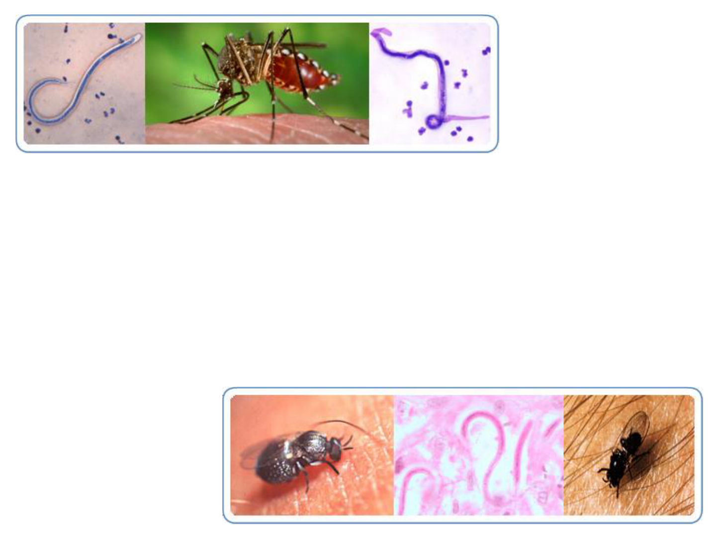 Filariose linfática e oncocercose Imagens: www.cdc.gov Objetivos: estudar as doenças ocasionadas por nematoides transmitidos por vetores 1. Agentes etiológicos da filariose linfática e oncocercose; 2. Vetores dos agentes etiológicos de ambas as doenças; 3. Ciclos de vida; 4. Patogênese e sintomatologia; 5. Diagnóstico e tratamento; 6. Prevenção e controle 7. Atividade – avaliação 01 Filariose linfática Agentes etiológicos: nematoides das espécies Wuchereria bancrofti, Brugia malayi e Brugia timori www.cdc.gov Filariose linfática Vetores: mosquitos Culex: Américas Anopheles: África Aedes e Mansonia: Ásia www.cdc.gov Filariose linfática Vermes adultos: vasos linfáticos e linfonodos Incapacitação de afetados http://www.filariasis.org/press_centre/hyd rocele.html Extraído de Luís Rey Extraído de Luís Rey Prevalência da filariose linfática www.cdc.gov 1,4 bilhões em risco; 120 milhões infectadas em 73 países (WHO) Américas: W. brancrofti Haiti, República Dominicana, Guiana e Brasil Ciclo de vida http://www.liquidjigsaw.com/science/animation/animations/lymfil/lymfil-lifecycle.html Aquisição de microfilárias pelo vetor http://itg.content-e.eu/Generated/pubx/161/filariasis/overview_of_characteristics_of_microfilariae.htm# Presença de microfilárias no sangue segundo a hora (Rachou & Deane). Extraído de Luís Rey Atividade noturna de Culex quinquefasciatus VectorBase Rack RL, Medical Hypotheses; 73(2), 2009, Pages 147–149 Patogenia e Sintomatologia Adenite: inflamação de gânglios/formação de granuloma/calcificação Linfagite: inflamação de vasos linfáticos Linfedema: inchaço resultante do mal funcionamento do sistema linfático (pernas, braços, seios e genitália) Quilúria: linfa na urina (presença de quilomicrons) Infecções secundárias: Staphylococcus Inflamação, fibrose, edema, infecções secundárias: elefantíase W. brancrofti: hidrocele, quilocele Pneumopatia eosinófila (rara): ↑ eosinofilia e ↑[IgE] Casos assintomáticos* Diagnóstico Gota espessa: coleta de sangue capilar Coleta de sangue venoso e filtragem em membrana de policarbonato (baixa microfilaremia) Ministério da Saúde: Normas e Manuais Técnicos Diagnóstico Imunocromatografia em cartão Ministério da Saúde: Normas e Manuais Técnicos Diagnóstico Clínico Epidemiológico Biopsia de linfonodo PCR Tratamento Dietilcarbamazina (DEC): microfilárias e adultos - derivado da piperazina - alteração do metabolismo do ácido aracdônico: vasoconstrição e adesão piperazina DEC Tratamento Ivermectina: microfilárias - agonista de GABA: paralisia Cirúrgico Vacina: pesquisa (Abundant Larval Transcript 2, tiorredoxina e transglutaminase) ivermectina Hernando G, Bouzat C (2014) Caenorhabditis elegans Neuromuscular Junction: GABA Receptors and Ivermectin Action. PLoS ONE 9(4): e95072. doi:10. 1371/journal.pone.0095072 Simbionte: Wolbachia Oncocercose Agente etiológico: nematoides da espécie Onchocerca volvulus www.cdc.gov Oncocercose Vetores: simulídeos (Simulium) www.cdc.gov Prevalência da oncocercose www.who.int 37 milhões de pessoas Ciclo de vida www.cdc.gov http://itg.content-e.eu/Generated/pubx/161/filariasis/overview_of_characteristics_of_microfilariae.htm# Patogenia e sintomatologia Oncocercomas: tumores benígnos (produção de microfilárias) Nódulos subcutâneos www.cdc.gov Patogenia e sintomatologia Dermatite oncocercosa: prurido intenso Hiperqueratose e despigmentação: pele de leopardo http://www.neglecteddiseases.gov/newsroom/ photo_galleries/uganda/photo_03.html Patogenia e sintomatologia Fáceis oncocercótica Extraído de Luís Rey Patogenia e sintomatologia Ceratite Ceratite: cegueira dos rios Diagnóstico Clínico: palpação Biópsia www.cdc.gov http://www.stanford.edu/class/humbio103/ParaSites200 6/Onchocerciasis/Diagnosis.html www.cdc.gov Diagnóstico Exame oftalmológico: humor aquoso Teste de Mazzotti: admistração de DEC e avaliação de erupção papular* http://www.stanford.edu/class/humbio103/ParaSites2006/Onchocer ciasis/Diagnosis.html Tratamento Ivermectina (DEC é contraindicada) Cirúrgico Preparando uma paciente para a nodulectomia, no México. (Luís Rey) Campanha em Olinda-PE Profilaxia e Controle da Filariose Linfática e da Oncocercose Tratamento dos doentes (reservatórios) Controle do vetor Vetores: Filo Arthropoda Subfilo Mandibulata Classe Insecta Ordem Diptera Simulium Borrachudos: transmitem a oncocercíase Gênero importante: Família Simuliidae Mosquitos Duas subfamílias de grande importância médica: Anophelinae (gênero Anopheles) Culicinae (gêneros Aedes e Culex) Anopheles darlingi Culex quinquefsciatus Aedes aegypti e Aedes albopictus Família Culicidae Organoclorados: DDT, o hexaclorociclohexano (HCH ou BHC), o dieldrin. Organofosforados: malation, fenitrotion, diclorvos e outros. Carbamatos: carbaril, propoxur. Piretróides: deltametrina, permetrina, cipermetrina, ciflu- trina e lambdacialotrina. Inseticidas Controle de mosquitos Uso racional de inseticidas para evitar o desenvolvimento de resistência Utilização rotativa: manutenção do pool genético Áreas vizinhas tratadas com inseticidas diferentes Associação com outros procedimentos de controle: Emprego de meios físicos, como a telagem das casas e o uso de mosquiteiros e cortinas (inclusive os impregnados com inseticidas) Roupas: evitar exposição da pele ao mosquito Repelentes Associação com outros procedimentos de controle: Hormônios juvenis (methoprene) e os inibidores da formação de quitina (TH.6040); Feromônios a fim de atrair os machos para as armadilhas ou para perturbar a reprodução: produtos vegetais com vários tipos de ação; Liberação de machos estéreis em áreas endêmicas; Controle biológico: Bacillus thuringiensis e B. sphaericus, produtores de uma endotoxina protéica que destrói o epitélio digestivo e mata as larvas que os ingerirem. Êxito para o controle das larvas dos simulídeos transmissores da oncocercíase,