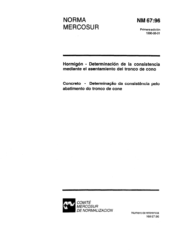 NORMA MERCOSUR NM 67:96 Primera edicih 1996-08-01 Hormig6n - Determinacidn de la consistencia mediante el asentamiento del tronco de cone Concrete - Determina@o da consisthcia pelo abatimento do tronco de cone COMITg MERCOSUR DE NORMA LlZACiON Ntimerode referencia NM 67:96 NM 67:96 Prefacio El CMN - Comite MERCOSUR de Normalization - tiene por objet0 promover y adoptar las acciones para la armonizacicln y la elaboration de las Normas en el Bmbito def Mercado Comljn del Sur - MERCOSUR, y esta integrado por 10s Organismos NacionalesdeNormalizackJnde 10s pafses miembros. El CMN desarrolla su actividad de normalization por mediodelosCSM-ComitesSectorialesMERCOSUR - creados para campos de action ctaramente definidos. Los proyectos de norma MERCOSUR, elaborados en el ambito de 10s CSM, circulan para votacion National por intermedio de 10s Organismos NacionalesdeNormalizaci6ndelospaisesmiembros. La homologac~ncomoNorMERCOSUR porpane delComite MERCOSUR de Normalization requiere la aprobacion por consenso de sus miembros. Esta Norma fue elaborada por el CSM 05 - Comite Sectorial de Cement0 y Hormigon. El texto-base del Proyecto de Norma MERCOSUR 05:03-OllOfueelaboradoporUruguayytuvoorigen en la Norma lnternacional IS0 4109:1980 Fresh concrete - Determination of consistency - Slump Test. A 10s efectos de esta Norma MERCOSUR, se han incorporado algunas especificaciones indicadas en las normas IRAM 1536~ NBR 7223, que no modifican el contenido de la description del ensayo de la Norma International. El Anexo A es informativo y contiene figuras del instrumental empleado en el ensayo (figuras 1 e 2) y tambien de la manera de medir el asentamiento del hormigon (figura3). Preficio 0 CMN -Cornit& MERCOSUL de Normaliza@o - tern por objetivo promover e adotar as a@es para a harmoniza@io e a elabora@iodas Normas no Grtbito do Mercado Comum do Sul - MERCOSUL, e e integrado pefos Organismos Nacionais de Normaliza@o dos paises membros. 0 CMN desenvolve sua atividade de normalizagao por meio dos CSM - Comites Setoriais MERCOSUL - criados para campos de a$Bo claramentedefinidos. OS projetos de norma MERCOSUL, elaborados no dmbito dos CSM, circulam para vota@o National por intermedio dos Organismos Nacionais de Normaliza@o dos paises membros. Ahomofogar;8ocomoNormaMERCOSULporparte do Comite MERCOSUL de Normaliza@o requer a aprova@o por consenso de seus membros. Esta Norma foi elaborada peio CSM 05 - Comite Setorial de Cimento e Concrete. 0 texto-base do Projeto de Norma MERCOSUL 05:03-0110 foielaborado pelo Uruguai e teve origem na Norma lnternacional IS0 4109:1980 Fresh concrete - Determination of consistency - Slump Test. Para OS efeitos desta Norma, foram incorporadas algumas modifica@es constantes das Normas IRAM 1536 e NBR 7223, que nso modificam o conteudo da descri@o do ensaio da Norma lnternacional. 0 Anexo A 6 informativo e contem figuras da aparelhagem utilizada no ensaio (figuras 1 e 2) e tambemdaformademediroabatimentodoconcreto (figura 3). NM 67:96 iiii hdice 1. Objet0 y campo de aplicacion 2. Referencias normativas 3. Muestreo 4. Instrumental 5. Procedimiento 6. Expresion de 10s resultados 7. lnforme del ensayo Anexo A (Informativo) - Figuras Sum&i0 1. Objetivo e campo de aplicacao 2. Referencias normativas 3. Amostragem 4. Aparelhagem 5. Procedimento 6. Expressao dos resultados 7. Relatorio do ensaio Anexo A (Informativo) - Figuras NM 67:96 Hormig6n - D&brminecE& & ta cordstsncia mediante el asentamiento de1 tronco de con0 Concrete - DetwmSna@io da consSst&wia pelo abatimento do tronco de cone 1 Objet0 y campo de aplicaclrjn 1 .l Esta Norma MERCOSUR especificaun metodo para determinar la consistencia del hormigon fresco mediante su asentamiento, en laboratorio y en obra. 1.2EI metodoesaplicablea 10s hormigones plasticos ycohesivos que presenten un asentamiento igual o superior a 10 mm, coma resultado del ensayo realizado de acuerdo con esta Norma. No es aplicablecuando el tamaiio maxim0 del agregado es mayor que 375 mm. 1.3 Cuando el tamario maxim0 del agregado es mayor que 37,5mm, el ensayo debe realizarse sobre la fraction del hormigdn que pase el tamiz 37,5mm, obtenida de acuerdo con la NM 36. 2 Referencias normativas Las Normas siguientescontienen disposiciones que, al ser citadas en este texto, constituyen requisitos de esta Norma MERCOSUR. Lasediciones indicadas estaban en vigencia en el moment0 de esta publication. Como toda Norma esta sujetaa revision, se recomiendaa aquellos que realicen acuerdos en base a esta Norma que analicen la conveniencia de emplear las ediciones mas recientes de las Normas citadas a continuation. Los organismos miembros del MERCOSUR poseen informaciones sobre las normas en vigencia en todo momento. NM 33:94- Hormigon - Muestreodel hormigonfresco NM 36:95 - Hormigon fresco - Separation de agregados grandes portamizado 3 Muestreo La muestra de hormigbn usada en el ensayo debe ser representativa de todoel lote ydebe obtenersede acuerdo con la NM 33. 1 Objetivo e crmpo de aplica@o 1 .l Esta Norma MERCOSULespecifica urn metodo para determinar a consistencia do concrete fresco atraves da medida de seu assentamento, em laboratorioe obra. 1.20 metodo e aplicavel aos concretes plasticos e coesivos, que apresentem urn assentamento igual ou superior a 10 mm, coma resultado do ensaio realizado de acordo corn esta Norma. 0 metodo nao seaplicaaconcretocujoagregadogralidoapresente dimensao nominal maxima superior a 375 mm. 1.3Quandoadimensaonominal maximadoagregado for superior a 375 mm, o ensaio deve ser realizado sobre afracaodoconcreto que passa pela peneira de 375 mm, obtida de acordo corn a NM 36. 2 Referhcias normativas As seguintes normas contern disposicbes que, ao serem citadas neste texto, constituem requisitos desta Norma MERCOSUL. As edicoes indicadas estavam em vigencia no moment0 desta publicacao. Como toda Norma estasujeitaa revisao, recomenda- se, aqueles que realizem acordos corn base nesta Norma, que analisem a conveniencia de usar as edicoes mais recentesdas Nor
