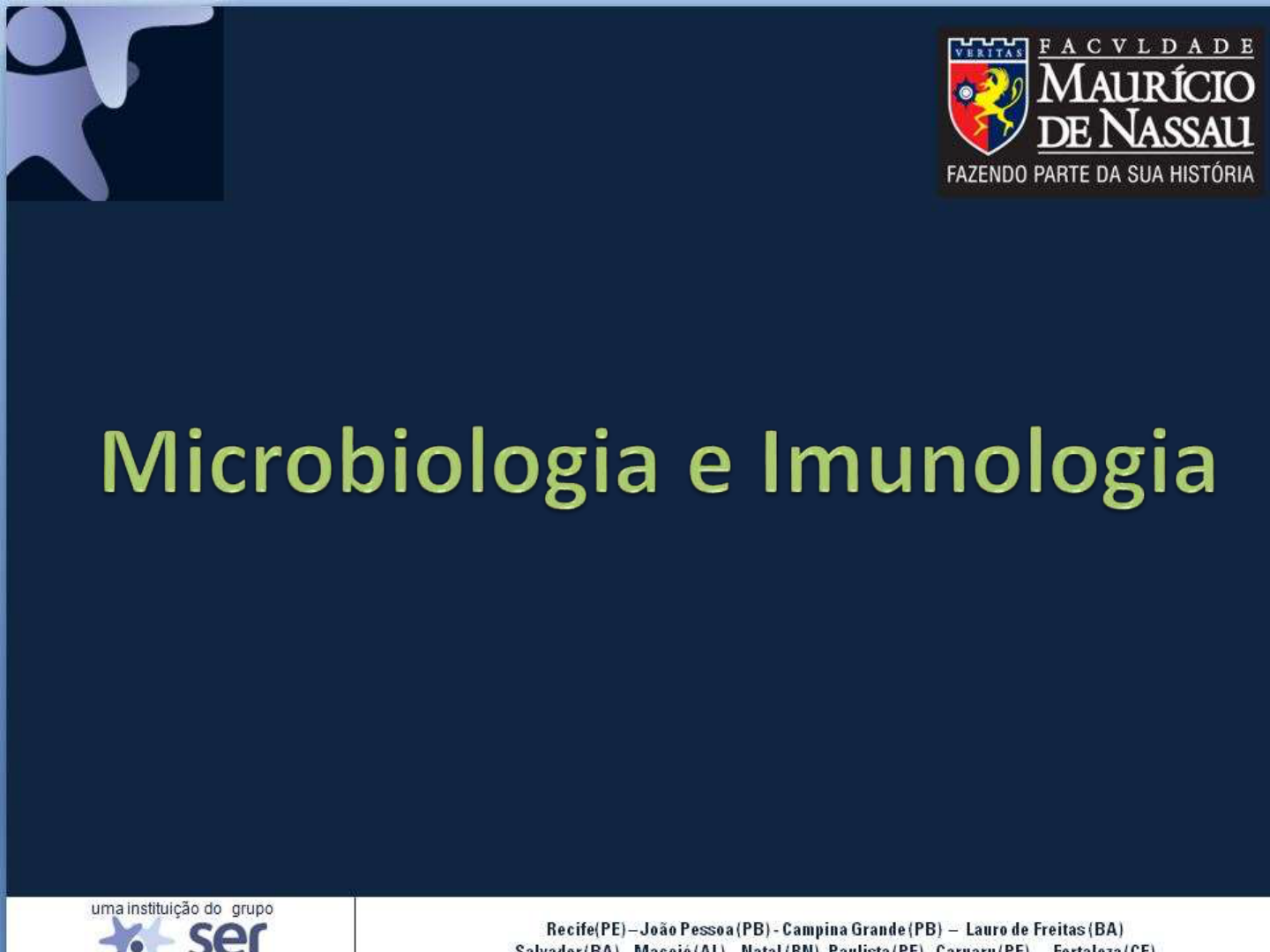 CENTRO UNIVERSITARIO MAURICIO DE NASSAU Professora: Erica Pacheco Caetano MATERIAIS DISPONÍVEIS • APRESENTAÇÕES E VIDEOS • PORTAL DA NASSAU • EMAIL DA TURMA • DISCIPLINA DE 60H (40H AULAS TEÓRICAS + 20H AULAS PRÁTICAS) DISCIPLINA BIBLIOGRAFIA UTILIZADA • TORTORA, G.J.; FUNKE, B.R.; CASE, C.L. Microbiologia, 6 ed., Ed. Artmed, Porto Alegre, 2003. • MURRAY, PATRICK R.; ROSENTHAL, KEN S.; PFALLER, MICHAEL A. Microbiologia Médica. 6 ed., Ed. Elsevier, 2009. • SIDRIM, J. J. C.; ROCHA, M. F. G. Micologia médica à luz de autores contemporâneos, Ed. Guanabara-Koogan, 2004. • SANTOS, N.S.O; ROMANOS, T.V & WIGG, M. Introdução à Virologia Humana, 2 ed., Ed. Guanabara Koogan, 2008. • ABBAS, A.K.; LICHTMAN, A.H.; PILLAI, S. Imunologia celular e molecular, 7 ed., Ed. Elsevier, Rio do Janeiro, 2011. • ROITT, I.M.; DELVES, P.J.; MARTIN, S.J.; BURTON, D.R. Fundamentos de Imunologia, 12 ed., Ed. Guanabara Koogan, Rio de Janeiro, 2014. PLANOS DE AULA APRESENTAÇÃO DA DISCIPLINA Introdução à Microbiologia Normas de Biossegurança Citologia e Morfologia bacteriana Controle de Crescimento bacteriano Meios de cultura Métodos de coloração Metabolismo e crescimento bacteriano AV1 Biologia, coleta, isolamento e identificação fúngica Introdução, morfologia e replicação dos vírus Propriedades gerais das Respostas Imunes Células e tecidos do sistema imune Migração de leucócitos para tecidos Imunidade inata Imunidade adquirida AV2 2ª CHAMADA AVALIAÇÃO FINAL SISTEMA DE AVALIAÇÃO • AV1 Prova Dissertativa 8,0 • AV1 Participação 2,0 • Participações na sala, relatórios de aulas práticas, trabalho escrito. • AV2 Prova colegiada 10,0 • Todo o conteúdo • Seleção de questões pelo sistema (computador) • OBS: Participações na sala, relatório de aula prática ponto extra. SISTEMA DE AVALIAÇÃO • 2ª Chamada 10,0 • Todo o conteúdo SISTEMA DE AVALIAÇÃO • NF Prova Final 10,0 • Todo o conteúdo • (AV1+AV2 ) ÷2 = MÉDIA 1 • MÉDIA ≥ 7,0 = APROVADO • 4,0 ≤ MÉDIA ≤ 6,9 = AVALIAÇÃO FINAL • MÉDIA < 4,0 = REPROVADO SISTEMA DE AVALIAÇÃO • (MÉDIA 1+AVALIAÇÃO FINAL ) ÷2 = MÉDIA FINAL • MÉDIA ≥ 5,0 = APROVADO • MÉDIA ≤ 4,9 = REPROVADO SISTEMA DE AVALIAÇÃO • Prova sem consulta; • Não responder com lápis (grafite), apenas caneta azul ou preta; • Não poderá rasurar a prova, incluindo o uso de corretivo; • Proibido utilização de celular ou qualquer aparelho eletrônico durante a prova AVALIAÇÕES • Proibido se ausentar da sala de aula durante a prova por qualquer motivo e depois retornar; • Uma vez recebida a prova, o aluno não poderá devolvê-la; • A interpretação das questões faz parte da prova. Leia CUIDADOSAMENTE cada uma das questões. Não se precipite! AVALIAÇÕES • Evitar conversas paralelas • Evitar atender e usar celular • Celular no silencioso • Notebook e Tablet desligados • Inadmissível desrespeito aos colegas e ao professor REGRAS DE CONVIVÊNCIA