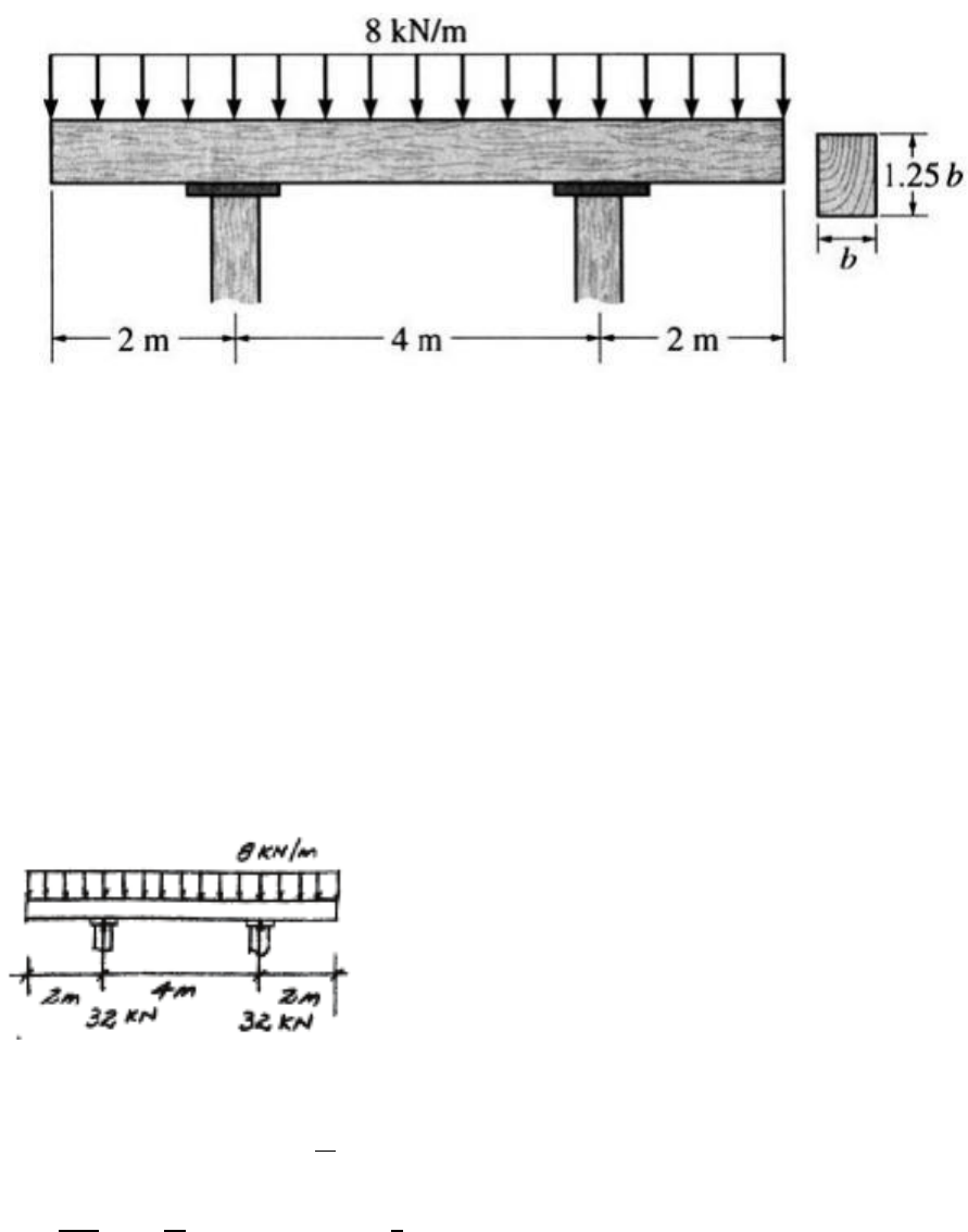 1. A viga simplesmente apoiada, abaixo mostrada, é construída em madeira para a qual valem σadm = 6,5 MPa e τadm = 0,5 MPa. Determine as dimensões transversais mínimas se a seção transversal deve ser retangular com h=1,25b