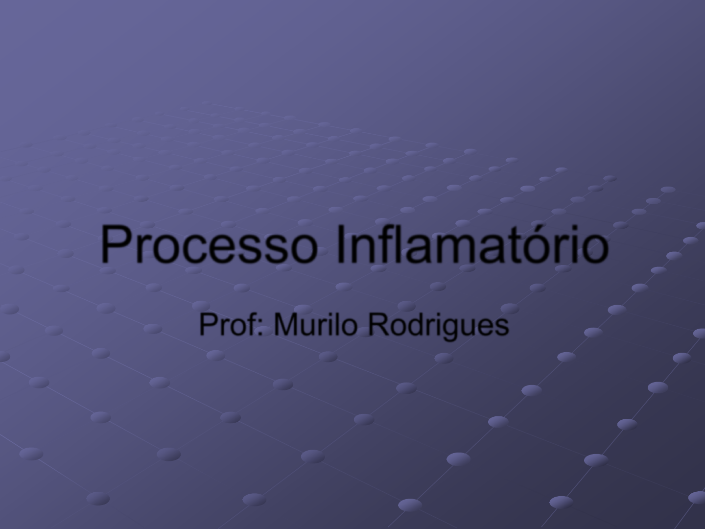 * Processo Inflamatório Prof: Murilo Rodrigues * Introdução Inflamação ou flogose (derivado de "flogístico" que, em grego, significa "queimar") está sempre presente nos locais que sofreram alguma forma de agressão e que, portanto, perderam sua homeostase e morfostase. * MOMENTOS DA INFLAMAÇÃO 1) Fase irritativa: modificações morfológicas e funcionais; liberação de mediadores químicos . 2) Fase vascular: alterações hemodinâmicas da circulação e de permeabilidade vascular. 3) Fase exsudativa: característica do processo inflamatório, esse fenômeno compõe-se de exsudato celular e plasmático oriundo do aumento da permeabilidade vascular. * 4)Fase degenerativa-necrótica: composta por células com alterações degenerativas reversíveis ou não (neste caso, originando um material necrótico). * SINAIS CARDINAIS O tumor é causado principalmente pela fase exsudativa e produtiva-reparativa, representadas pelo aumento de líquido de células. O calor é oriundo da fase vascular, em que se tem hiperemia arterial e, conseqüentemente, aumento da temperatura local. O rubor ou vermelhidão também é decorrente desse mesmo fenômeno. A dor é originada de mecanismos mais complexos que incluem compressão das fibras nervosas locais devido ao acúmulo de líquidos e de células, agressão direta às fibras nervosas e ação farmacológicas sobre as terminações nervosas; portanto, engloba pelo menos três fases da inflamação (irritativa, vascular e exsudativa). A perda de função é decorrente do tumor (principalmente em articulações, impedindo a movimentação) e da própria dor, dificultando as atividades locais. * FENÔMENOS IRRITATIVOS Esta fase tem, como característica fundamental, a mediação química, ou seja, fenômeno em que ocorre a produção e/ou liberação de substâncias químicas diante da ação do agente inflamatório. Essas substâncias atuam principalmente na microcirculação do local inflamado, provocando, dentre outras modificações, o aumento da permeabilidade vascular. * Mediadores Quimicos Mediadores de ação rápida: liberados imediatamente após a ação do estímulo agressor. Têm ação principalmente sobre os vasos e envolvem o grupo das aminas vasoativas Mediadores de ação prolongada: liberados mais tardiamente, diante da persistência do agente flogístico. Atuam nos vasos e, principalmente, nos mecanismos de quimiotaxia celular, contribuindo para a exsudação celular. Compreendem substâncias plasmáticas e lipídios ácidos. * Mediadores Quimicos Aminas vasoativas: originárias do tecido agredido. Atuam sobre a parede vascular, não exercendo quimiotaxia sobre os leucócitos, como alguns mediadores de ação prolongada. Compreendem, dentre outros, a histamina e a serotonina. Substâncias plasmáticas: as substâncias plasmáticas estão divididas em três grandes sistemas: o sistema das cininas (envolvendo principalmente a plasmina e a bradicina), o sistema complemento e o sistema de coagulacao. * Mediadores Quimicos Aminas vasoativas Histamina: sintetizada nos granulócitos basófilos, nas plaquetas e, principalmente, nos mastócitos, que a liberam quando agredidos. Provoca contração das células endoteliais venulares, com conseqüente aumento da permeabilidade vascular, e vasodilatação. Tem destacada participação no mecanismo de formação do edema inflamatório. Serotonina: encontrada nas plaquetas, na mucosa intestinal e no SNC, a serotonina tem uma provável ação vasodilatadora e de aumento da permeabilidade vascular. * Mediadores Quimicos Lipidios Acidos Prostaglandina: participa de fases mais tardias da inflamação; é um composto de cadeias longas formadas por ácidos graxos, tendo sido observado primeiramente no líquido seminal (daí ter o nome de prostaglandina - "prosta"=próstata; "glandina"= provavelmente "glândula"); provocam contração das células endoteliais e vasodilatação e potencializam as respostas vasculares oriundas da ação da bradicinina. * FENÔMENOS EXSUDATIVOS Os fenômenos da exsudação referem-se à migração, para o foco inflamatório, de líquidos e células, provenham eles de vasos ou dos tecidos vizinhos. Distinguem-se dois tipos de exsudação nessa fase: a exsudação plasmática, composta essencialmente por líquidos, e a exsudação celular. * EXSUDAÇÃO PLASMÁTICA Saída de plasma para fora da luz vascular, com quantidades diversas de água, eletrólitos e proteínas A saída do líquido plasmático ocorre principalmente nas vênulas * EXSUDAÇÃO CELULAR Passagem de células pela parede vascular em direção ao interstício, ao local atuante do agente inflamatório. Os movimentos migratórios celulares são devido, principalmente, à abertura de fendas na parede vascular aliada à liberação de mediadores químicos com ação de quimiotaxia, * Tipos Celulares Inflamação aguda: Neutrófilos: granulócitos típicos de fenômenos agudos da inflamação, presentes em maior quantidade nesta fase devido ao seu alto potencial de diapedese e rápida velocidade de migração. Têm ação fagocítica e, se mortos, podem provocar necrose tecidual devido a liberação de suas enzimas lisossômicas para o interstício. Eosinófilos: encontrados nas inflamações subagudas ou relativas a fenômenos alérgicos e em alguns processos neoplásicos. Também possuem capacidade de fagocitose, mas menor que os neutrófilos. * Tipos Celulares 2) Inflamação crônica: Basófilos e mastócitos: granulócitos que aumentam de número em processos crônicos. Os basófilos contêm grânulos de heparina e histamina; os mastócitos, de histamina. Macrófagos: originados dos monócitos, essas células mononucleares são os "fagócitos profissionais", tendo ação sobre ampla variedade de antígenos. Observados mais comumente em estágios de cronicidade e granulomas. Linfócitos e plasmócitos: migram mais lentamente que os neutrófilos para o foco inflamatório, tendo ação coadjuvante nas atividad