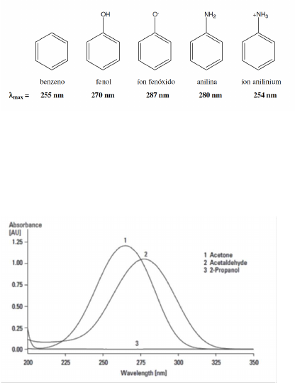 1. Heteroátomos, tais como N, O, S ou halogênio, presentes como substituintes no grupo cromóforo, exercem efeito batocrômico, embora o efeito não seja tão importante quanto o de um par de elétrons p conjugados. No entanto, isso não é observado para o íon anilinium (abaixo), que mesmo com N como substituinte, mostra valor de lmax semelhante ao do benzeno. O que explica a ausência desse efeito para o íon anilinium? 2. O espectro de absorbância de três diferentes compostos (1 – acetona; 2 – acetaldeído; 3 – 2-‐propanol) na faixa de 200 a 350 nm pode ser visualizado abaixo: Explique, com base nas estruturas químicas desses compostos, as diferenças observadas entre seus espectros. Qual dos três compostos é a melhor opção como solvente de um analito a ser detectado na faixa de 200 a 350 nm por espectroscopia no UV? Por quê? 3. Explique porque o eteno tem λmax em 165 nm enquanto que o 1,3-‐butadieno absorve em 217 nm 4. Quais tipos de transições eletrônicas são possíveis para cada um dos seguintes compostos? (a) ciclopenteno (b) acetaldeído (c) dimetil-‐éter (d) metil vinil éter (e) trietilamina (f) cicloexano 5. Clorometano tem λmax em 172 nm, bromoetano mostra lmax em 204 nm e iodometano apresenta lmax em 258 nm. Que tipo de transição é responsável por essas bandas? O que explica as diferenças entre os valores de lmax desses compostos? 6. Antocianinas dissolvidas em meio neutro ou básico resultam em soluções incolores. A adição de ácido ao meio torna as soluções coloridas, conforme descrito na reação abaixo. O que explica esse fenômeno? 7. Suponha que você tem os dois compostos abaixo e um espectrofotômetro UV-‐Vis, mas não tem acesso a tabelas ou regras para calcular os valores de λmax. Como você poderia utilizar essa técnica para diferenciar esses dois compostos?