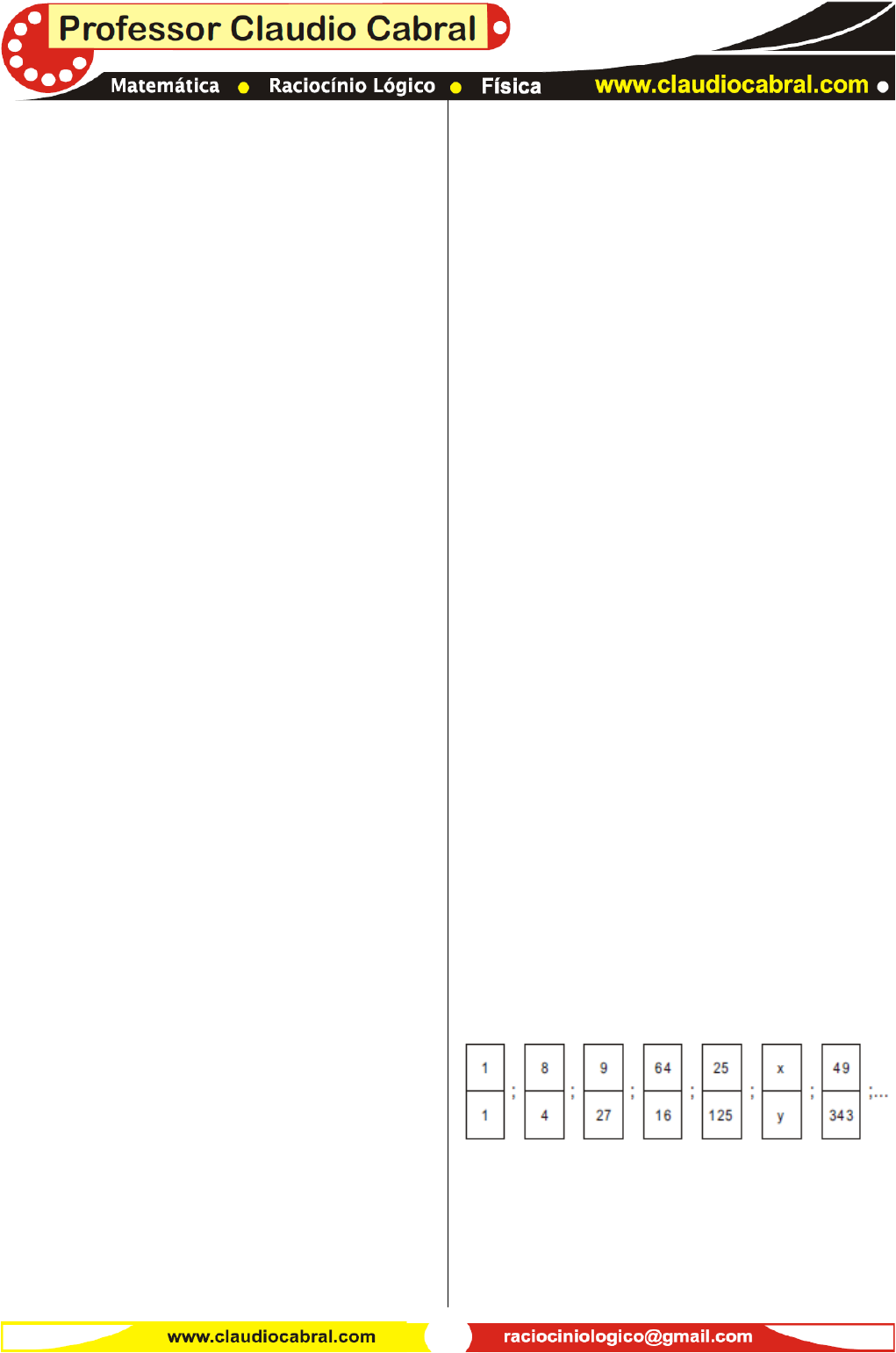 1 Raciocínio Lógico-Matemático: Estrutura lógica de relações arbitrárias entre pessoas, lugares, objetos ou eventos fictícios; deduzir novas informações das relações fornecidas e avaliar as condi- ções usadas para estabelecer a estrutura daquelas rela- ções. Compreensão e elaboração da lógica das situações por meio de: raciocínio verbal, raciocínio matemático, raciocínio sequencial, orientação espacial e temporal, formação de conceitos, discriminação de elementos. Compreensão do processo lógico que, a partir de um conjunto de hipóteses, conduz, de forma válida, a con- clusões determinadas. Raciocínio Sequencial 01. (FCC/2010) Qual é a soma dos valores X, Y e Z na sequência: 2, 5, 4, 10, 8, 20, X, 40, 32, Y, Z? A) 152. B) 158. C) 160. D) 154. E) 165. 02. (FCC/2010) Qual é o valor da expressão: X + Y – Z, na sequência: 1; 2; 4; 3; 9; 5; X; 7; 25; Y; 36; Z? A) 13. B) 14. C) 15. D) 16. E) 17. 03. (FCC/2004) Observe a sequência a seguir: 33; 34; 37; 42; 49; 58; ...? O próximo número é: A) 67. B) 69. C) 71. D) 73. E) 75. 04. (FCC/2006) Assinale a alternativa que completa a série seguinte: 9, 16, 25, 36,... A) 45. B) 49. C) 61. D) 63. E) 72. 05. (FCC/2005) Na seqüência seguinte o número que aparece entre parênteses é obtido segundo uma lei de formação. 63(21)9; 186(18)31; 85( ? )17 O número que está faltando é A) 15. B) 17. C) 19. D) 23. E) 25. 06. (FCC/2004) Considere os seguintes pares de núme- ros: (3,10) (1,8) (5,12) (2,9) (4,10) Observe que quatro desses pares em uma característica comum. O único par que não apresenta tal característica é A) (3,10). B) (1,8). C) (5,12). D) (2,9). E) (4,10). 07. (FCC/2005) Note que, dos pares de números se- guintes, quatro têm uma característica comum. (1;5) (3;7) (4;8) (7;10) (8;12) O único par que não tem tal característica é: A) (1;5). B) (3;7). C) (4;8). D) (8;12). E) (7;10). 08. (FCC/2005) Observando os pares de números abaixo: (2, 5) (6, 10) (9,12) (11, 14) (13, 16) nota-se que quatro deles têm uma propriedade em co- mum. O único par que NÃO tem tal propriedade é A) (2, 5). D) (11, 14). B) (6, 10). E) (13, 16). C) (9, 12). 09. (FCC/2005) Os termos da seqüência (77, 74, 37, 34, 17, 14,...) são obtidos sucessivamente através de uma lei de formação. A soma do sétimo e oitavo termos dessa seqüência, obtidos segundo essa lei é A) 21. B) 19. C) 16. D) 13. E) 11. 10. (FCC/2003) Continuando a seqüência 47, 42, 37, 33, 29, 26, ... , temos A) 23. B) 22. C) 21. D) 24. E) 25. 11. (FCC/2007) Considere que os termos da seqüência (820, 824, 412, 416, 208, 212, 106, ...) são obtidos su- cessivamente segundo determinado padrão. Mantido esse padrão, obtêm-se o décimo e o décimo primeiro termos dessa seqüência, cuja soma é um número com- preendido entre A) 0 e 40. D) 120 e 160. B) 40 e 80. E) 160 e 200. C) 80 e 120. 12. (FCC/2005) Considere que os termos da seqüência (5, 12, 10, 17, 15, 22, 20,...) obedecem a uma lei de formação. Assim, o termo que vem após o número 20 é A) menor que 25. D))o triplo de 9. B) maior que 30. E) par. C) a metade de 52. 13. (FCC/2007) Assinale a alternativa que substitui corretamente a interrogação na seguinte seqüência nu- mérica: 8 12 24 60 ? A) 56. B) 68. C) 91. D) 134. E) 168. 14. (FCC/2005) Observe a seqüência apresentada no esquema seguinte: Nessa seqüência, tanto os números na parte superior como os na inferior, obedecem a duas respectivas leis de formação. Assim, x + y é um número compreendido entre A) 150 e 200. D) 300 e 350. B) 200 e 250. E) 350 e 400. C) 250 e 300. 2 15. (FCC/2005) Os números no interior dos setores do círculo abaixo foram marcados sucessivamente, no sentido horário, obedecendo a uma lei de formação. Segundo essa lei, o número que deve substituir o ponto de interrogação é A) 210. B) 206. C) 200. D) 196. E) 188. 16. (FCC/2008) Observando a seqüência (2, 5, 11, 23, 47, 95, ...) verificasse que, do segundo termo em diante, cada número é obtido a partir do anterior, de acordo com uma certa regra. Nessas condições, o sétimo ele- mento dessa seqüência é A) 197. B) 191. C) 189. D) 187. E) 185. 17. (FCC/2008) Considere que os termos da seqüência seguinte foram obtidos segundo determinado padrão: ...; 28 9 ; 30 10 ; 10 5 ; 12 6 ; 4 3 ; 6 4 ; 2 2 Se, de acordo com o padrão estabelecido, y x é o décimo primeiro termo dessa seqüência, então x + y é um núme- ro compreendido entre A) 100 e 150. D) 250 e 300. B) 150 e 200. E) 350 e 400. C) 200 e 250. 18. (FCC/2008) Considere que todos os números intei- ros ímpares e positivos podem ser sucessivamente dis- postos em linhas e colunas, na forma como é mostrado abaixo. 1ª C 2ª C 3ª C 4ª C 5ª C 6ª C 1ª L 1 3 5 7 9 11 2ª L 13 15 17 19 21 23 Se fosse possível completar essa tabela, então na quarta coluna e na tricentésima vigésima sétima linha aparece- ria o número: A) 4 021. B) 4 015. C) 3 937. D) 3 919. E) 3 847. 19. (FCC/2008) Na sucessão seguinte os números fo- ram colocados obedecendo a um determinado padrão. Segundo esse padrão, os números que substituem corre- tamente X e Y na 8a posição são tais que X + Y é igual a A) 95. B) 135. C) 147. D) 149. E) 157. Sequências lógicas literais 20. (FCC/2005) São dados três grupos de 4 letras cada um: (MNAB) : (MODC) :: (EFRS) : ............ Se a ordem alfabética adotada exclui as letras K,W e Y, então o grupo de quatro letras que deve ser colocado à direita do terceiro grupo e que preserva a relação que o segundo tem com o primeiro é: A) (EHUV). D) (EHUT). B) (EGUT). E) (EHVU). C) (EGVU). 21. (FCC/2006) Considere que a seqüência de pares de letras (A, C), (F, D), (G, I), (M, J), ... obedece a uma lei de formação. Se o alfabeto oficial da Língua Portuguesa exclui as letras K, W e Y, o quinto par de letras da se- qüência é A) (P, N). D) (Q, O). B))(N, P). E) (R, P). C) (O, Q). 22. (FCC/2005) Adotando o alfabeto praticado, são dados três grupos de 