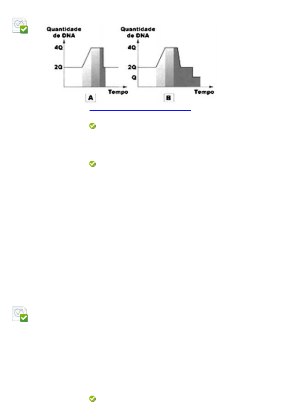 Pergunta 1 0,4 em 0,4 pontos (CEFET-MG) As figuras abaixo se referem aos processos de divisão celular. Fonte: Disponível em: <http://e-porteflio.blogspot.com/2008/11>;.Acesso em: 09 set. 2011. Os gráficos A e B relacionam-se, respectivamente, a: Resposta Selecionada: b. Formação do sangue e variabilidade genética. Respostas: a. Permutação gênica e regeneração da pele. b. Formação do sangue e variabilidade genética. c. Aumento dos pelos e crescimento embrionário. d. Formação de gametas e reposição de células perdidas. e. Redução do número de cromossomos e duplicação do DNA. Feedback da resposta: Resposta: B. Comentário: Em A observa-se o ciclo celular, que culmina na divisão celular por mitose, processo que ocorre na produção de células, tais como na formação de células do sangue, e em B observa-se o ciclo que termina na meiose, a qual aumenta a variabilidade gênica, tanto pela recombinação no processamento, quanto pela produção dos gametas. Pergunta 2 0,4 em 0,4 pontos (FUVEST) Considere os eventos abaixo, que podem ocorrer na mitose ou na meiose: I. Emparelhamento dos cromossomos homólogos duplicados. II. Alinhamento dos cromossomos no plano equatorial da célula. III. Permutação de segmentos entre cromossomos homólogos. IV. Divisão dos centrômeros resultando na separação das cromátides irmãs. No processo de multiplicação celular para reparação de tecidos, os eventos relacionados à distribuição equitativa do material genético entre as células resultantes estão indicados em: Resposta Selecionada: b. II e IV, apenas. Respostas: a. I e III, apenas. b. II e IV, apenas. c. II e III, apenas. d. I e IV, apenas. e. I, II, III e IV. Feedback da resposta: Resposta: B. Comentário: Emparelhamento de homólogos e permutação de segmentos são processos que ocorrem apenas na meiose, e esta divisão está associada à produção de gametas e não à regeneração de tecidos. Pergunta 3 0,4 em 0,4 pontos (PUC-MG) A figura abaixo representa uma analogia entre as chamadas células-tronco e os diferentes tipos celulares que delas derivam em processos de diferenciação celular. Com base na representação acima e em seus conhecimentos sobre o assunto, é correto afirmar, exceto: Resposta Selecionada: c. Na figura, os três ramos A, B e C poderiam representar, respectivamente, endoderme, mesoderme e ectoderme. Respostas: a. As células da mórula são consideradas totipotentes, o que não acontece com as células-tronco dos tecidos de indivíduos adultos. b. Os processos de diferenciação celular dependem de alterações e controle da expressão gênica. c. Na figura, os três ramos A, B e C poderiam representar, respectivamente, endoderme, mesoderme e ectoderme. d. Na figura, a letra D poderia ser substituída por células glandulares exócrinas do tubo digestivo. e. Na figura, a letra B só é valida para o músculo estriado cardíaco. Feedback da resposta: Resposta: C. Comentário: O tecido nervoso tem origem na ectoderme e o muscular na mesoderme. Pergunta 4 0,4 em 0,4 pontos (PUCCAMP) Para responder esta questão, considere o texto abaixo: “Virtualmente, cada aspecto da vida de nossas células é regulada por seu DNA, incluindo sua própria morte. As últimas instruções do DNA, enviadas ao citoplasma, referem-se à morte da célula. Logo que essas instruções sejam recebidas e processadas, a célula começa a destruir todo o DNA de seu núcleo, partindo-o em milhares de pedaços que não mais conseguem enviar instruções úteis à célula. Esta, apesar de poder continuar exercendo determinadas funções durante certo tempo, está fadada a morrer, processo este decididamente irreversível”. (Traduzido e adaptado de William R. Clark. “Sex and the origins of death”. New York: Oxford University Press, 1996. p.32-5.) Considere os seguintes fatos: I. Uma célula do miocárdio morta por falta de oxigênio durante um ataque cardíaco. II. Uma célula morta pelas toxinas produzidas por bactérias invasoras. III. Uma célula da camada germinativa da epiderme que morre e sofre queratinização. A apoptose é verificada somente em: Resposta Selecionada: c. III. Respostas: a. I. b. II. c. III. d. I e II. e. I e III. Feedback da resposta: Resposta: C. Comentário: Em I e II, as células morrem por necrose e, em III, a célula morre para atender a função determinada no código genético. Pergunta 5 0,4 em 0,4 pontos (UFMS) O excesso de exercícios físicos pode até ser prejudicial à saúde, pois, quando as células são colocadas em situação de injuria, podem sofrer danos irreversíveis e morrer por necrose. Outro tipo de morte celular, no qual as próprias células desencadeiam mecanismos que as levam à morte, é conhecido como: Resposta Selecionada: b. Apoptose. Respostas: a. Silicose. b. Apoptose. c. Asbestose. d. Fagocitose. e. Glicosidase. Feedback da resposta: Resposta: B. Comentário: A apoptose, morte celular programada, é uma característica inerente a todas as células, uma vez que o programa está no DNA celular. Pergunta 6 0,4 em 0,4 pontos (UFSCAR-2007) O exame de um epitélio e do tecido nervoso de um mesmo animal revelou que suas células apresentam diferentes características. Isso ocorre porque: Resposta Selecionada: b. Os genes que estão se expressando nas duas células são diferentes. Respostas: a. As moléculas de DNA das duas células carregam informações diferentes. b. Os genes que estão se expressando nas duas células são diferentes. c. O mecanismo de tradução do RNA difere nas duas células. d. O mecanismo de transcrição do DNA nas duas células é diferente. e. Os RNA transportadores das duas células são diferentes. Feedback da resposta: Resposta: B. Comentário: O material genético pode ser expresso de várias formas, pois é o processo da diferenciação celular, em que, num genoma de uma determinada célula, alguns genes estão “ligados” e outros, “desligados”. Pergunta 7 0,4 em 0,4 pont