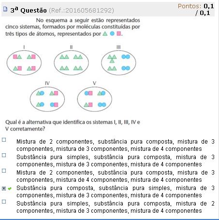 Considere os sistemas abaixo: Os sistemas I, II e III correspondem, respectivamente, a: Questão 8Resposta a. mistura homogênea, substância composta, m