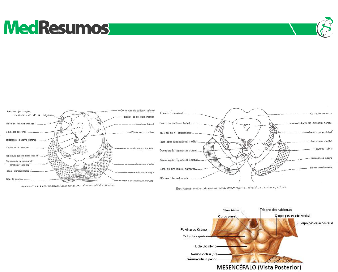 Arlindo Ugulino Netto ● MEDRESUMOS 2016 ● NEUROANATOMIA 1 www.medresumos.com.br ESTRUTURA DO MESENCÉFALO - MICROSCOPIA O mesencéfalo é constituído por uma porção dorsal, o tecto do mesencéfalo, e outra ventral muito maior, o pedúnculo cerebral, separados pelo aqueduto cerebral (aqueduto do mesencéfalo), canal que percorre longitudinalmente o mesencéfalo e que é circundado por uma espessa camada de substância cinzenta central ou periaquedutal. Em cada pedúnculo cerebral distingue-se, a partir da substância negra, uma parte ventral, a base do pedúnculo (formada de fibras longitudinais) e uma parte dorsal, o tegmento do mesencéfalo, cuja estrutura assemelha-se à parte correspondente na ponte. TECTO DO MESENCÉFALO O tecto do mesencéfalo, nos mamíferos, é constituído de quatro eminências, os colículos superiores (relacionados com os órgãos da visão por meio dos corpos geniculados laterais do diencéfalo) e os colículos inferiores (relacionados com a audição por meio dos corpos geniculados mediais). Além deles, existe a chamada área pré-tectal. Colículo superior: é formado por uma série de camadas superpostas constituídas alternadamente por substância branca e cinzenta. Suas conexões são complexas, destacando-se, entre elas: Fibras oriundas da retina, que atingem o corpo geniculado lateral por meio do tracto óptico e por fim, por meio do braço do colículo superior, chegam impulsos ao colículo superior. Fibras oriundas do córtex occipital, que chegam ao colículo pela radiação óptica e braço do colículo superior. Fibras que formam o tracto tecto-espinhal e terminam fazendo sinapse com neurônios motores da medula cervical. OBS 1 : O colículo superior é importante para certos reflexos que regulam o movimento dos olhos no sentido vertical. Para esta função, existem fibras que ligam o colículo superior ao núcleo do nervo oculomotor, situado ventralmente no tegmento do mesencéfalo, bem ao nível do colículo. Tumores do corpo pineal podem comprimir os colículos e causar a perda da capacidade de mover os olhos no sentido vertical voluntária ou reflexamente. Colículo inferior: constituído por uma massa bem delimitada de substância cinzenta, o núcleo do colículo inferior (bilateralmente à substância cinzenta central). Esse núcleo recebe fibras auditivas dos núcleos cocleares que sobem pelo lemnisco lateral e manda fibras ao corpo geniculado medial através do braço do colículo inferior. Algumas fibras cruzam de um colículo para outro, formando a comissura do colículo inferior. Esse colículo é, portanto, um importante relé (interruptor de seleção) das vias auditivas. OBS 2 : Não confundir lemnisco lateral (fibras que levam impulsos de núcleos cocleares da ponte ao colículo inferior) com lemnisco medial (formado a partir das fibras arqueadas internas que derivam dos núcleos grácil e cuneiforme, ainda no bulbo). Devemos perceber também que o braço do colículo superior é responsável por trazer informações do corpo geniculado lateral para o próprio colículo. Enquanto que o braço do colículo inferior leva, do colículo inferior ao corpo geniculado medial, impulsos relacionados com a via auditiva. Área pré-tectal: também chamada de núcleo pré-tectal, é uma área de limites pouco definidos, situada na extremidade rostral dos colículos superiores, no limite do mesencéfalo com o diencéfalo. Relaciona-se com o controle reflexo das pupilas por se comunicar com o núcleo acessório do oculomotor (Edinger-Westphal) dos dois lados, estabelecendo conexões entre eles e fibras oriundas da retina. Arlindo Ugulino Netto. NEUROANATOMIA 2016 Arlindo Ugulino Netto ● MEDRESUMOS 2016 ● NEUROANATOMIA 2 www.medresumos.com.br BASE DO PEDÚNCULO CEREBRAL A base do pedúnculo é formada por fibras descendentes dos tractos córtico-espinhal, córtico-nuclear e córtico-pontino, que formam um conjunto compacto nessa região (diferentemente do que ocorre quando estes passam na base da ponte). Em vista do grande numero de fibras descendentes que percorrem a base dos pedúnculos cerebrais, lesões aí localizadas causam paralisias que se manifestam do lado oposto da lesão. SUBSTÂNCIA CINZENTA SUBSTÂNCIA CINZENTA HOMÓLOGA (NÚCLEOS DOS NERVOS CRANIANOS) No tegmento do mesencéfalo estão os núcleos dos pares cranianos III (oculomotor), IV (troclear) e V (trigêmeo). Desse ultimo, está apenas o núcleo do tracto mesencefálico, que continua da ponte e recebe informações proprioceptivas que entram pelo nervo trigêmeo (informações estas que chegam, por exemplo, pelo nervo oftálmico, trazendo informações proprioceptivas da conjuntiva do olho). Núcleo do Nervo Troclear: situa-se ao nível do colículo inferior, em posição imediatamente ventral à substância cinzenta central e dorsal ao fascículo longitudinal medial. Suas fibras saem de sua face dorsal, contornam lateralmente a substância cinzenta central, cruzam (posteriormente a ela) e emergem na porção caudal do colículo inferior. Este nervo – o N. troclear (IV) – apresenta, pois, duas peculiaridades: suas fibras são as únicas que saem da face dorsal do encéfalo e trata-se do único nervo cujas fibras decussam antes de emergirem do sistema nervoso central. O nervo troclear inerva o músculo oblíquo superior do olho. Núcleo do Nervo Oculomotor (Complexo óculo-motor): localiza-se ao nível do colículo superior e aparece nos cortes transversais em forma de V, estando intimamente relacionado com o fascículo longitudinal medial (com quem faz comunicações com os outros nervos que controlam o bulbo ocular: IV e VI; e com o controle do movimento da cabeça: raiz espinhal do nervo acessório). O complexo oculomotor pode ser funcionalmente dividido em uma parte somática e outra visceral. A parte somática contém neurônios motores responsáveis pela inervação dos músculos reto superior, reto inferior, reto medial do olho e levantador da pálpebra. N