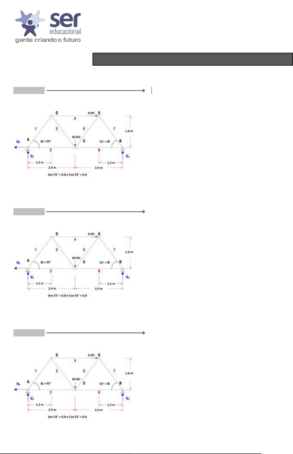 Página 1 de 4 GRADUAÇÃO EAD SEGUNDA CHAMADA 2018.1B 30/06/2018 QUESTÃO 1. A coberta de um galpão industrial feita de estrutura metálica tem como sistema estrutural o uso de treliças, conforme figura a seguir. No seu dimensionamento, o valor da reação VA é: R: 18 KN. QUESTÃO 2. A coberta de um galpão industrial feita de estrutura metálica tem como sistema estrutural o uso de treliças, conforme figura a seguir. No seu dimensionamento, o valor da reação VB é: R: 22 KN. QUESTÃO 3. A coberta de um galpão industrial feita de estrutura metálica tem como sistema estrutural o uso de treliças, conforme figura a seguir. No seu dimensionamento, o valor da reação HA é: ESTRUTURAS Página 2 de 4 R: 6 KN. QUESTÃO 4. A coberta de um galpão industrial feita de estrutura metálica tem como sistema estrutural o uso de treliças, conforme figura a seguir. No seu dimensionamento, o valor do esforço da barra 1 é: R: 22,5 KN. QUESTÃO 5. A coberta de um galpão industrial feita de estrutura metálica tem como sistema estrutural o uso de treliças, conforme figura a seguir. No seu dimensionamento, o valor do esforço da barra 2 é: R: 19,5 KN. QUESTÃO 6. A coberta de um galpão industrial feita de estrutura metálica tem como sistema estrutural o uso de treliças, conforme figura a seguir. No seu dimensionamento, o valor do esforço da barra 3 é: R: 22,5 KN. Página 3 de 4 QUESTÃO 7. A coberta de um galpão industrial feita de estrutura metálica tem como sistema estrutural o uso de treliças, conforme figura a seguir. No seu dimensionamento, o valor do esforço da barra 4 é: R: 27 KN. QUESTÃO 8. A coberta de um galpão industrial feita de estrutura metálica tem como sistema estrutural o uso de treliças, conforme figura a seguir. No seu dimensionamento, o valor do esforço da barra 7 é: R: 27,5 KN. QUESTÃO 9. A coberta de um galpão industrial feita de estrutura metálica tem como sistema estrutural o uso de treliças, conforme figura a seguir. No seu dimensionamento, o valor do esforço da barra 6 é: R: 16,5 KN. Página 4 de 4 QUESTÃO 10. A coberta de um galpão industrial feita de estrutura metálica tem como sistema estrutural o uso de treliças, conforme figura a seguir. No seu dimensionamento, o valor do esforço da barra 5 é: R: 27,5 KN.