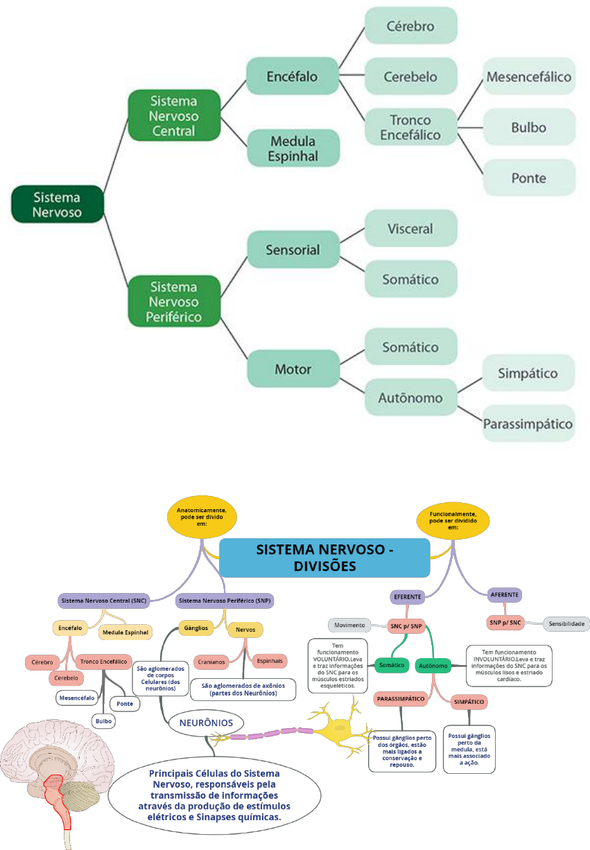Observações sobre o sistema nervoso Anterior- raízes motoras Posterior – raízes sensitivas A medula espinhal é uma massa cilindróide de tecido nervoso situada dentro do canal vertebral sem, entretanto, ocupá-lo completamente. No homem adulto mede aproximadamente 45 centímetros, sendo um pouco menor na mulher. Cranialmente, a medula limita-se com o bulbo, aproximadamente ao nível do forame magno do osso occipital. O limite caudal da medula tem importância clínica e no adulto situa-se geralmente na 2- vertebra lombar (L2). A medula termina afilando- se para formar um cone, o cone medular, que continua com um delgado filamento meníngeo, o filamento terminal Sinapse Na sinapse neurônio musculo há estruturas básicas: Membrana pré sináptica, a pós sináptica e a fenda sináptica. Os neurotransmissores estão presentes nos axônios terminais. A chegada do impulso na terminação, resulta na liberação dos neurotransmissores na fenda sináptica e os neurotransmissores atingem outros neurônios desencadeando impulsos nervosos. Acetilcolina em geral é o mais importante, pois faz transmissão de neurônio para neurônio e neurônio para músculos. Nervos cranianos Motricidade Paralisia Questoes Podemos organizar o sistema nervoso humano dividindo-o em duas partes: o sistema nervoso central (SNC) e o sistema nervoso periférico (SNP). Com base no seu conhecimento sobre o tema, marque a alternativa que indica corretamente as partes do SNC. a) nervos e encéfalo. b) encéfalo e gânglios. c) gânglios e nervos. d) medula espinhal e nervos. e) medula espinhal e encéfalo A respeito do sistema nervoso, marque a alternativa INCORRETA: a) O tecido que forma o sistema nervoso é o tecido nervoso, que possui como célula principal o neurônio. b) Os neurônios são responsáveis pelo recebimento e transmissão do impulso nervoso e possuem como partes principais os dendritos, o corpo celular e o axônio. c) Os neurônios permanecem conectados entre si, formando uma espécie de fio contínuo por onde os impulsos nervosos propagam-se. d) O sistema nervoso e o sistema endócrino possuem uma íntima relação, sendo o sistema nervoso responsável, por exemplo, por estimular algumas glândulas a produzirem hormônios. 3. A respeito dos neurotransmissores, marque a alternativa correta: a) Os neurotransmissores são substâncias químicas que atuam na transmissão do impulso nervoso. b) Os neurotransmissores estão relacionados com a transmissão do impulso nervoso, sendo encontrados por toda a extensão do axônio, permanecendo no interior da célula. c) Os neurotransmissores irão se ligar na membrana da célula vizinha, chamada de membrana pré-sináptica. d) Os neurotransmissores são encontrados livremente no meio extracelular, estando disponíveis para a utilização pelos neurônios a qualquer momento 4. (Cesgranrio-RJ) Os anestésicos, largamente usados pela Medicina, tornam regiões ou todo o organismo insensível à dor porque atuam: a) nos axônios, aumentando a polarização das células. b) nas sinapses, impedindo a transmissão do impulso nervoso. c) nos dendritos, invertendo o sentido do impulso nervoso. d) no corpo celular dos neurônios, bloqueando o metabolismo. e) na membrana das células, aumentando a bomba de sódio. 5. Fuvest-SP) Qual dos seguintes comportamentos envolve maior número de órgãos do sistema nervoso? a) Salivar ao sentir o aroma de comida gostosa. b) Levantar a perna quando o médico toca com martelo no joelho do paciente. c) Piscar com a aproximação brusca de um objeto. d) Retirar bruscamente a mão ao tocar um objeto muito quente. e) Preencher uma ficha de identificação O esquema abaixo representa o reflexo patelar, que é uma resposta involuntária a um estímulo sensorial. Adaptado de LINHARES, S. e GEWANDSZNAJDER, F. Biologia Hoje. São Paulo: Ática, v.1, 2003 Com relação a este reflexo, analise as afirmativas abaixo. I. Neste reflexo, participam apenas dois tipos de neurônios: 1) o sensitivo, que leva o impulso até a medula espinhal; 2) o motor, que traz o impulso medular até o músculo da coxa, fazendo-a contrair-se. II. Em exame de reflexo patelar, ao bater-se com um martelo no joelho, os axônios dos neurônios sensitivos são excitados e, imediatamente, os dendritos conduzem o impulso até à medula espinhal. III. Se a raiz ventral do nervo espinhal for seccionada (veja em A), a pessoa sente a batida no joelho, mas não move a perna. Assinale a alternativa que apresenta somente afirmativas corretas. a) II e III b) I e II c) I e III d) I, II e III UFMG) - Lesão no cerebelo de um animal afetará, principalmente, sua capacidade de A) absorver alimentos. B) coordenar movimentos. C) emitir sons. D) perceber imagens. E) perceber odores 8. Uma pessoa que tem uma lesão no bulbo provavelmente apresenta distúrbio: a) na respiração. b) na audição. c) no sono. d) na visão. e) na temperatura corporal 9. Entre as afirmativas a seguir, a única ERRADA é: A) O centro respiratório está situado na ponte. B) Os sistemas simpático e parassimpático exercem ações antagônicas. C) Uma lesão no cerebelo pode interferir no controle do equilíbrio. D) Participam de um arco reflexo: receptor, via aferente, centro, via eferente e efetuador. E) A substância cinzenta da medula é formada, principalmente, de corpos celulares. 10. O sistema nervoso autônomo é subdividido em sistema nervoso simpático e parassimpático, que funcionam de maneira involuntária. Assinale a alternativa correta com relação à atividade simpática: a) contração da pupila e da bexiga urinária. b) taquicardia e broncoconstrição. c) vasoconstrição das artérias e taquicardia. d) bradicardia e broncodilatação. 11. ) (UNICAP-PE) - O sistema nervoso periférico é constituído: a) da fração simpática, gânglios e nervos b) da fração parassimpática, gânglios e nervos c) do sistema autônomo, gânglios e nervos. d) dos nervos e gânglios espinais e simpáticos. e