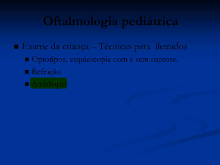 Oftalmologia pediátrica Exame da criança – Técnicas para iletrados Optotipos, esquiascopia com e sem narcose. Refração Ambliopia Jhamyson Cabral Realce acuidade visual diminuida em um dos olhos Estrabismo Tropias - Estrabismo manifesto ( eso , exo ) Forias - Estrabismo latente ( eso , exo ) Catarata congênita Glaucoma congênito Fotofobia ( precoce ) Edema corneano Megalocornea hidroftalmia Doenças externas do olho Epicanto Ptose Chalázio Obstrução de vias lacrimais Conjuntivites, ceratites Uveites Deficiências nutricionais Avitaminose A - Ceratinização do epitélio da cornea e conjuntiva ( xerosis ). Perfuração. Avitaminose B - Nistagmo, oftalmoplegia. Avitaminose C - Hemorragia retiniana , hifema retinoblastoma Oftalmologia pediátrica Slide Number 2 Estrabismo Slide Number 4 Slide Number 5 Slide Number 6 Slide Number 7 Slide Number 8 Slide Number 9 Slide Number 10 Slide Number 11 Slide Number 12 Slide Number 13 Slide Number 14 Slide Number 15 Slide Number 16 Slide Number 17 Doenças externas do olho retinoblastoma Slide Number 21 Slide Number 22