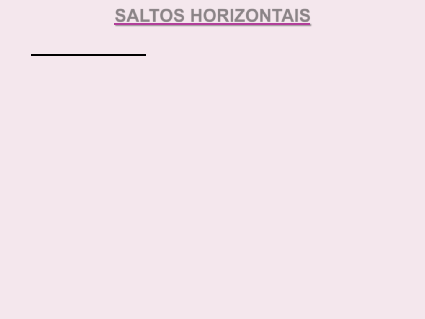 * SALTOS HORIZONTAIS Condições Gerais: Área do Salto: O comprimento mínimo do corredor será de 45m medido a partir da tábua de impulsão até o final do corredor, com 1,22m de largura, marcado com linhas brancas de 5cm de largura; Tábua de impulsão: colocada entre 1 e 3m da caixa de areia, medindo 1,22m x 20cm, pintada de branco; Tábua indicadora de plasticina deverá medir 1,22m x 10cm; A distância entre a tábua de impulsão e fim da caixa de areia deverá ter no mínimo 12m (salto em distância); Linha de medição; Área de queda deverá ter a largura de no mínimo 2,75m e máxima de 3m. Deverá também ser cheia de areia molhada e fofa, com a superfície nivelada. Para essas provas existe a medição de velocidade que não pode exceder a velocidade de 2 m/s. Nome do aparelho anemômetro. * 12m mín Tábua de impulsão 20 cm Plasticina 10 cm Corredor 45 m mín Caixa de areia * Configura entre as provas mais antigas dos Jogos Olímpicos 708 aC. - Pentatlo; halteres de 1 a 4,5 kg * Na versão moderna, é regulamentada pelos Ingleses e Americanos em 1860; Qualidades: velocidade, força, impulsão, habilidade e domínio da técnica; * Saindo da própria marca; Caminhando 3 a 4 passos antes da marca; Trotando ou saltitando antes da marca; Correndo antes da marca; * Os atletas atingem velocidade semelhante aos velocistas; Vai variar de 100 à 150 pés, ou seja de 30 à 40 m 15 à 21 passos; Depende da capacidade de aceleração e atingir a velocidade ideal para saltar; As marcas podem ser verificadas pelos seguintes métodos: Corrida inversa (mais indicado para iniciação), por tentativas e o matemático. * Projetar o centro de gravidade (máx veloc) para cima e para frente; Velocidade da corrida e impulsão; Inclinação lateral do peso do corpo para a perna de impulsão; Pequena flexão da perna De impulsão ao tocar a tábua; Extensão do corpo ao deixar a tábua. * Caracteriza o estilo do salto, que pode ser: Em arco, Grupado, bicicleta (2,5 até 3,5 pedaladas) * Manter os joelhos elevados; Glúteos próximo ao calcanhar; Cair lateralmente (técnica). * * OS MELHORES DE TODOS OS TEMPOS * AS MELHORES DE TODOS OS TEMPOS * * * * * * * *