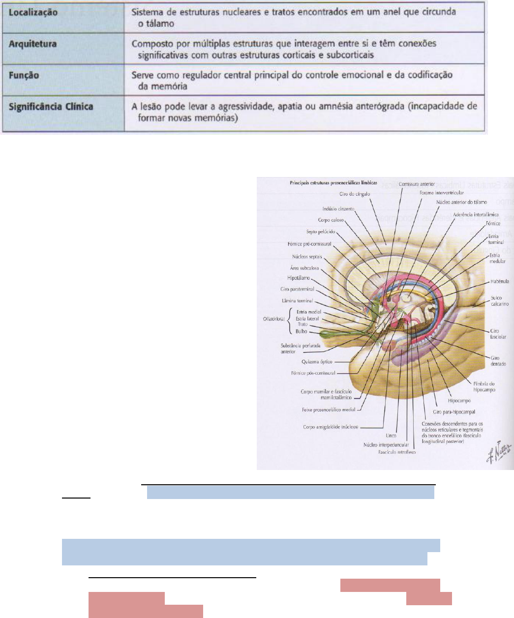 Sistema límbico Complexo que integra estruturalmente e funcionalmente certas áreas do telencéfalo, diencéfalo e mesencéfalo. Relação neuro-anatômica íntima e propriedades neuroquímicas e fisiológicas em comum. Porção mais volumosa e funcionalmente importante da porção anterior do encéfalo. Marcadores de receptores opioides endógenos, dopaminérgicos e colinérgicos --> concentração maior dentro do componente cortical do SL. Lobo límbico - um dos componentes corticais. Formação circular cortical composta por vários tipos de córtex filogeneticamente mais antigos que o restante do córtex cerebral. Cérebro olfativo: Formação hipocampal + área paraolfativa + giro para-hipocampal + úncus --> Forma o rinencéfalo (contém todas a estruturas do SNC ligadas ao olfato). É provável que haja relação entre as percepções olfativas e as estruturas do SL tenham importância para as dimensões olfativas e emocionais do olfato. Córtex piriforme (olfativo) e o córtex entorrinal - dificultam a definição do SL. Ambas fazem parte do SL e do rinencéfalo, ocupam a maior parte do giro para-hipocampal Córtex piriforme (em forma de pera)- parte anterior do giro para-hipocampal e inclui o úncus. Formado pelo paleocórtex (3-5 camadas). Córtex olfatório + área periamigdaloide (região dorsal e anterior ao complexo amigdaloide) → Formam o córtex olfatório primário. O restante do giro para-hipocampal é o córtex entorrinal. Limite posterior → istmo. Limite anterior → córtex piriforme. Áreas anterossuperiores são formadas por paleocórtex. Áreas mais inferiores e posteriores --> neocórtex (próximas ao córtex associativo temporal). Áreas corticais frontais e temporais não são consideradas partes do sistema límbico. Componentes corticais Formação hipocampal - hipocampo + giro denteado + subículo + rudimentos hipocampais. Única estrutura anatômica exclusiva do sistema límbico. Toda superfície ventricular é recoberta por uma camada fibrosa esbranquiçada, o álveo (formado por axônios das células do hipocampo). Essas fibras penetram a fímbria onde formam o início do fórnix. Giro para-hipocampal - contém o córtex entorrinal. Giro denteado - células granulares. Hipocampo - formado por uma camada celular bem definida de células piramidais. A camada mais profunda chama-se camada molecular. Essa camada pode ainda ser dividida em: Estrato molecular Estrato lacunar Estrato radiado A mais superficial - excluindo o álveo - constitui a superfície ventricular, chama-se camada polimórfica. Subículo - formado por uma faixa de córtex de transição entre o hipocampo e a área entorrinal do giro para-hipocampal. Essencial para transmissão de informações da formação hipocampal para o hipotálamo e áreas associativas neocoticais. Dividido em: Pré-subículo Parassubículo Rudimentos hipocampais - dorsalmente ao corpo caloso. Incluem: Indusim griseum Estrias longitudinais medial e lateral Giro fasciolar Um tecido de transição que liga o giro denteado ao indusium griseum. Lobo insular - localizada profundamente no sulco lateral. Região de integração com efeitos neuropsiquiátricos - envolve processos de motivação emotiva, sensação de fadiga e simbolia da dor. Impulsos aferentes → córtex olfatório primário + amígdala + núcleo basal de Meynert. Apresenta um importante papel no processamento de informações sensoriais dirigidas para o corpo amigdaloide → media processos de aprendizagem tátil e reação à dor. Componentes subcorticais Núcleos da área septal - septo ( septo pelúcido + área septal). Estriado ventral - parte ventral do núcleo caudado + putame + globo pálido + núcleo accumbens + núcleo basal de Meynert. Obs. : Na demência de Alzheimer há uma grande perda neuronal do núcleo de Meynert (substância inominada), com redução acentuada do conteúdo de acetilcolina no córtex e diminuição a excitabilidade cortical → base da teoria colinérgica. Amígdala - ou corpo amigdaloide é um complexo de núcleos com formato de amêndoa. Situada na porção dorsomedial do lobo temporal e anterior à cauda do núcleo caudado e corno inferior do ventrículo lateral. Os núcleos do corpo são divididos em dois grandes grupos: núcleo amigdaloide cortical ou lateral e núcleo amigdaloide medial. O núcleo lateral envia projeções para o medial, formando um circuito intrínseco dentro do complexo amigdaloide. Três grandes feixes de fibras conectam a amígdala com outras partes do sistema nervoso: a estria olfatória lateral (traz fibras secundárias olfatórias), a estria terminal (traz impulsos da área septal) e o feixe amigdalofugal ventral (apresenta fibras aferentes e eferentes entre a amígdala e os núcleos hipotalâmicos). A amígdala e o hipocampo são considerados parte de um sistema integrado envolvido no processo da memória remota. Núcleo da estria terminal - massa celular que se estende da porção dorsal da amígdala ao longo das fibras de estria terminal, dorsomedialmente. Estão envolvidos em várias funções junto à amígdala, exercem um importante papel na função sexual masculina. Núcleos habenulares - glândula pineal + habênula → epitálamo. A habênula é constituída pelo núcleo habenular lateral e medial. Função pouco conhecida. Hipotálamo e corpo mamilar Hipo - forma porção mais ventral do diencéfalo. CM - conjunto de 3 ou 4 núcleos que formam elevações sobre a superfície ventral do hipotálamo. A maioria das fibras aferentes para os núcleos mamilares origina-se no hipocampo. Vias principais Cíngulo - forma feixes de fibras associativas que interliga regiões adjacentes do neocórtex dos lobos frontal, parietal e temporal e a área septal, estriado ventral e pálido ventral com o giro para-hipocampal do lobo temporal. Fórnix - mais importante sistema eferente da formação hipocampal para o diencéfalo, hipotálamo e área septal. Divido em pré-comissural e pós-comissural.