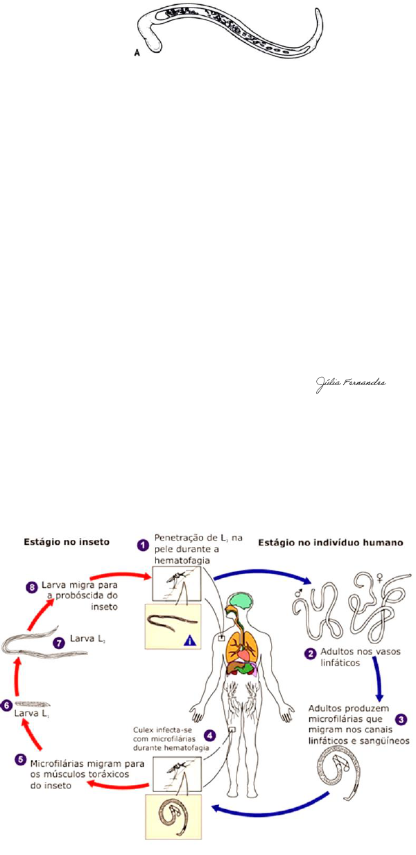 Filariose linfática → Filo Nemathelminthes → Classe Nematoda → Ordem Filarioidea → Espécie Wuchereria bancrofti → Ciclo Heteroxênico → Parasitose de vasos linfáticos A filariose, filaríase ou elefantíase é uma parasitose endêmica das regiões tropicais e subtropicais do planeta atingindo as regiões mais pobres. Nessas regiões, é um problema de saúde pública, com um número estimado de 120 milhões de portadores. O vetor é um mosquito do gênero Culex e o homem é o único reservatório. Existem três agentes etiológicos: Wuchereria bancrofti, Brugia nalayi e B. timori. Nas Américas, a doença é causada somente pela Wuchereria bancrofti, nematódeo que vive nos vasos linfáticos dos indivíduos infectados. É conhecida também como filariose de Bancrofti ou elefantíase, devido a uma das manifestações na fase crônica, que ocasiona o aumento excessivo do órgão afetado, similar a uma pata de elefante. O parasito possui quatro formas diferentes: verme adulto macho, verme adulto fêmea, microfilárias (que circulam no sangue periférico no homem) e larvas (encontradas no inseto vetor). É uma parasitose que não se transmite de pessoa a pessoa. Transmissão: Pela picada dos mosquitos transmissores com larvas infectantes. No Brasil, o Culex quinquefasciatus e o principal transmissor. Em geral, as microfilárias tem periodicidade para circular no sangue periférico, sendo mais detectada a noite, entre as 23h e 1h. Não é uma doença transmitida de pessoa a pessoa. A fêmea do Culex quinquefasciatus quando exerce o hematofagismo em pessoas que estão parasitadas, ingere microfilárias que depois de poucas horas, no estômago do mosquito, perdem as bainhas e atravessam a sua parede, caem na cavidade geral e migram para o tórax, onde se alojam nos músculos torácicos e transforma-se em uma larva salsichóide ou L1. Seis a dez dias após o repasto sanguíneo ocorre à primeira muda originando a L2. De dez a quinze dias depois vai ocorrer um crescimento acentuado e a L2 vai sofrer uma mudança e transformar-se na larva infectante para o hospedeiro intermediário (L3). Esta com aproximadamente 2mm migra para a probóscida do mosquito mais especificamente para lábio. Quando o vetor volta a fazer novo repasto, as larvas L3 escapam do seu lábio e penetram no hospedeiro definitivo (homem) pela solução de continuidade causada pelo mosquito e migram para os vasos linfáticos, onde se tornam vermes adultos. Depois de sete a oito meses as fêmeas grávidas produzem microfilárias, que migram dos ductos linfáticos para a corrente sanguínea ficando alojadas nos capilares profundos de várias regiões e em torno da meia noite têm preferência pela corrente sanguínea periférica. VERMES: São vermes de corpo longo e arredondado e os adultos têm sexos distintos (macho e fêmea). A fêmea engravida e dá origem a milhares de pequenos vermes chamados de microfilárias que migram para a circulação sanguínea, nunca mais voltando ao sistema linfático. Os vermes adultos, entretanto, permanecem a vida toda dentro do sistema linfático até morrerem, seja pelo tratamento antifilarial, seja por morte espontânea. Caso a microfilária não seja sugada pelo mosquito, ela morre sem, aparentemente, causar nenhum dano ao ser humano, em um período de 6 a 24 meses. Wuchereria bancrofti → Se desenvolvem em mosquitos hematófagos, principalmente do gênero Culex, que funcionam como hospedeiro intermediário. No vetor, as microfilárias sofrem 3 mudas e se transformam em larvas infectantes ou L3. Macho: Tem o corpo delgado e branco leitoso. Mede de 3,5 a 4 cm de comprimento e o,1mm de diâmetro. Extremidade anterior afilada e posterior enrolada ventralmente. Fêmea: Possui o corpo delgado e branco leitoso. Mede de 7 a 10cm de comprimento e 0,3mm de diâmetro. Tem órgãos genitais duplos, com exceção do órgão genital feminino, que é única e se exterioriza em vulva localizada próximo a extremidade anterior. Microfilária: São as formas que se movimentam ativamente dentro da corrente sanguínea do hospedeiro intermediário (homem) quando liberadas pelas fêmeas grávidas. São também chamadas de embrião. Apresentam uma bainha flexível, medem de 250 a 300 micrômetros. A bainha cuticular lisa é apoiada sobre numerosas células subreticulares (que vão formar os músculos e a hipoderme do helminto adulto) e células somáticas (que vão formar órgãos e tubo digestivo). Larvas: Encontradas no vetor. No primeiro estádio (L1) mede em torno de 300 micrômetros e é originada da transformação de microfilária. Depois se diferencia em L2, duas a três vezes maior, que sofre nova mudança dando origem a L3 que mede de 1,4 a 2,0mm. PATOGENIA: Fase aguda: linfagite e linfadenite | Fase crônica: linforragia, ascite linfática, hidrocele, quilúria, etc. Há a importância de distinguir-se os casos de infecção (presença de microfilárias e vermes se sintomatologia aparente) dos casos de doença. Os pacientes com manifestações clínicas discretas ou assintomáticos podem apresentar alta microfilaremia, e os pacientes com elefantíase ou outras manifestações crônicas geralmente não apresentam ou a quantidade de microfilárias no sangue periférico está reduzida. Quando ocorre infecções fúngicas ou bacterianas há um agravamento da elefantíase. Manifestações clínicas como as imunoinflamatórias se devem às microfilárias ou aos vermes adultos, sendo que as alterações provocadas por estes últimos são mais conhecidas, tendo um progresso longo que pode causar desde uma estase linfática até um estado crônico de elefantíase. Essas lesões podem ocorrer devido a duas ações desse parasita: Ação Mecânica: A presença de vermes adultos na corrente linfática pode ocasionar obstrução gerando distúrbios como: Estase linfática com linfangiectasia (dilatação dos vasos linfáticos) e derramamento linfático ou linforragia (quando ocorrido nos tecidos causa 
