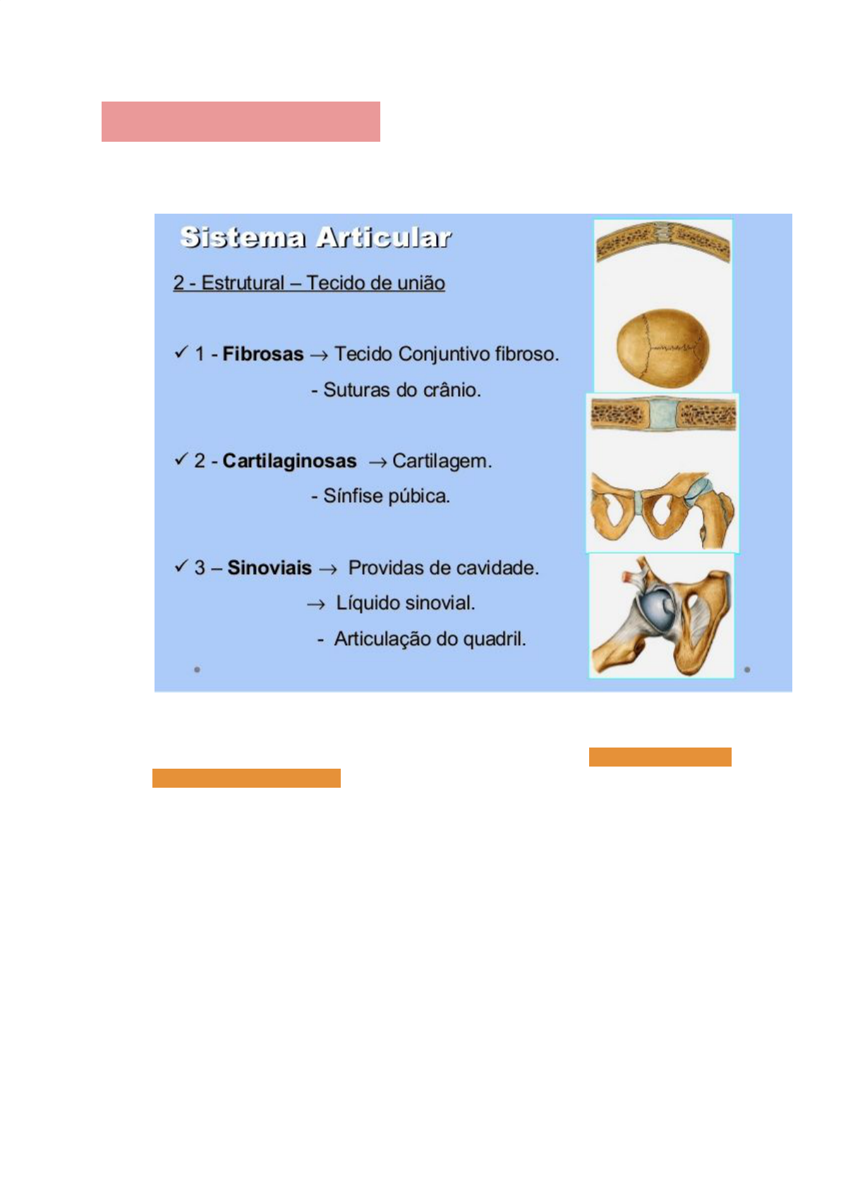 ARTICULAÇÕES Descrever o Sistema Articular quanto a classificação baseada no material interposto aos ossos. a) reconhecer tipos de articulações (fibrosas, cartilaginosas, sinoviais) 1. FIBROSA: Os ossos que se articulam em em articulações fibrosas estão firmemente ligados através de tecido conjuntivo fibroso, possui função de estabilizar e não permitir o movimento (não necessitam de movimento) ● Sutura: (no crânio) São caracterizadas por uma fina camada de tec conjuntivo denso não modelado, se formam em torno dos 18 meses e substituem os fontículos do crânio de uma criança. As margens irregulares de encaixe de suturas conferem-lhes força adicional e diminuem sua chance de fratura. TORTORA, Geral. Corpo Humano: fundamentos de anatomia e fisiologia. 8 ed. cap 7 VAN DE GRAAFF, Kent M. Anatomia Humana. 6ed. Unidade 4 - Articulações ● Sindesmose: É uma articulação em que existe uma distância maior entre as superfícies articulares e mais tecido conjuntivo denso não modelado do que uma sutura. O TCDNM é normalmente disposto em um feixe (ligamento) e a articulação permite movimento limitado tíbia e fíbula, ulna e rádio; TORTORA, Geral. Corpo Humano: fundamentos de anatomia e fisiologia. 8 ed. cap 7 VAN DE GRAAFF, Kent M. Anatomia Humana. 6ed. Unidade 4 - Articulações ● Gonfose: são articulações fibrosas que ocorrem entre os dentes e os ossos de sustentação, maxilas e mandíbula. Mais especificamente, uma gonfose, ou articulação dentoalveolar, é onde a raiz de um dente está fixada ao ligamento periodontal do alvéolo dental (cavidade do dente) do osso Alvéolos dentais 2. CARTILAGINOSA: Permite singelos movimentos, pouco movimento em respota a torções ou compressões . Os ossos articulantes são firmemente conectados por fibrocartilagem ou cartilagem hialina. Os dois tipos de cartilagem fibrosa são: SINCONDROSES E SÍNFISE ● SINCONDROSE: são articulações cartilagíneas que têm cartilagem hialina entre os ossos que se articulam, algumas das quais são temporárias e formam a lâmina epifisial (lâmina de crescimento) entre a diáfise e as epífises nos ossos longos de crianças 3. SINOVIAIS:Possuem cavidade articular (sinovial) entre os ossos articulantes. A cavidade permite a uma articulação ser livremente móvel. Por isso todas as articulações sinoviais são classificadas como DIARTROSES. Os ossos em uma art sinoval são recobertos por uma cartilagem epifisial, que é a cartilagem hialina, essa reduz o atrito entre os ossos na articulação durante o movimento e ajuda a absorver choques. As articulações sinoviais são as mais complexas e variadas dos três tipos principais de articulações. A amplitude do movi- mento de uma articulação sinovial é determinada por três fatores: 1. A estrutura dos ossos envolvidos na articulação (por exem- plo, o olécrano da ulna evita a hiperextensão da articulação do cotovelo); 2. A resistência da cápsula articular e a resistência e a tensão dos ligamentos e tendões associados; 3. O tamanho, a disposição e a ação dos músculos que transpõem a articulação. A amplitude do movimento nas articulações si- noviais caracteriza-se por grande variação individual, a maioria das quais está relacionada às condições do corpo (fig. 8.6). Em- bora algumas pessoas possam executar contorções notáveis e se julguem “duplamente articuladas”, elas não possuem nenhuma articulação extra que as ajude a fazê-las. Mais exatamente, me- diante condicionamento, elas estão aptas em distender os liga- mentos que normalmente inibem os movimentos. -Estrutura de uma Articulação Sinovial Articulações sinoviais são envolvidas por uma cápsula arti- cular composta por tecido conjuntivo denso regular. Cada cápsula articular contém um líquido sinovial lubrificante contido no inte- rior da cavidade articular (fig. 8.7). O termo sinovial é derivado de uma palavra grega que significa “clara do ovo”, com a qual este lí- quido se assemelha. É secretado por uma membrana sinovial fina que reveste a cápsula articular por dentro. O líquido sinovial é rico em ácido hialurônico e albumina, e também contém células fagocí- ticas que limpam os resíduos de tecidos que resultam do desgaste das cartilagens articulares. TORTORA, Geral. Corpo Humano: fundamentos de anatomia e fisiologia. 8 ed. cap 7 VAN DE GRAAFF, Kent M. Anatomia Humana. 6ed. Unidade 4 - Articulações Ligamentos são cordões flexíveis constituídos por tecido conjuntivo denso regular que conectam os ossos que se articulam ajudando a unir as articulações sinoviais. Os ligamentos podem estar localizados dentro da cavidade articular ou no lado de fora da cápsula. Coxins cartilagíneos duros, fibrosos chamados menis- cos, só são encontrados na articulação do joelho onde eles amor- tecem e compatibilizam os ossos que se articulam. Algumas outras articulações sinoviais, como a articulação temporomandi- bular têm um coxim fibrocartilagíneo chamado disco articular que executa funções semelhantes ao menisco. Identificar: Art. temporomandibular (atm): Entre a fossa mandibular temporal e o processo condilar da mandíbula movimentos de protusão e retração e desvio lateral (condilar) Art. Falanges Articulação carpometacarpal do polegar (Selar) Articulação médiocarpal: (plana) TORTORA, Geral. Corpo Humano: fundamentos de anatomia e fisiologia. 8 ed. cap 7 VAN DE GRAAFF, Kent M. Anatomia Humana. 6ed. Unidade 4 - Articulações Articulação metacarpofalângicas: ossos metacarpais e falanges proximais (elipsóidea) Articulação interfalângica: gínglimo Art. Punho rádio-escafóide (rádiocarpal), flexão e extensão, desvio lateral ou medial (ELIPSÓIDE) Intercarpal: são articulações planas Art. Radio Ulnar: Rádio-ulnar proximal: cabeça do rádio articula-se com a incisura radial da ulna. Rádio-ulnar distal: cabeça da ulna articula-se com a incisura ulnar do rádio (trocóide) Art. Cotovelo: Úmero-u