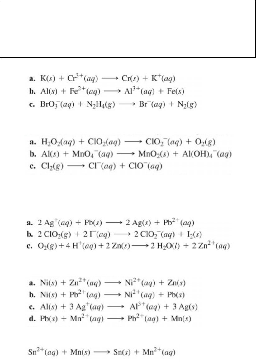 PONTIFÍCIA UNIVERSIDADE CATÓLICA DE MINAS GERAIS DEPARTAMENTO DE FÍSICA E QUÍMICA 1ª Lista de Exercícios – Química Geral Nome:________________________________________________________ Professor: Daniel Alvarenga 1. Balancear as seguintes reações de oxirredução em meio ácido: 2. Balancear as seguintes reações de oxirredução em meio básico: 3. Construa uma célula voltaica para as reações de oxirredução abaixo. Indique o ânodo, o cátodo, com suas respectivas semi-reações. Indique o fluxo de elétrons. Determine o valor de E° em cada caso. 4. Determine a espontaneidade das reações abaixo: 5. Uma célula voltaica apresenta a seguinte reação de oxirredução: Determine o potencial da célula à 25°C, dentro das condições abaixo: a. Condições padrão b. [Sn2+]=0,0100 M; [Mn2+]=2,00 M c. [Sn2+]=2,00 M; [Mn2+]=0,0100 M 6. Uma célula voltaica apresenta as seguintes reações em suas 2 meia-células: Determine o potencial da célula a 25°C 7. Cobre pode ser depositado no cátodo de uma célula eletrolítica conforme a reação abaixo: Quanto tempo é necessário para que 325 mg de cobre sejam depositados com uma corrente de 5,6 A? 8. Sódio metálico pode ser produzido a partir da eletrólise de NaCl fundido. Determine a corrente que seria necessária para produzir 1,0 kg de sódio em 1 hora. 9. Indique as reações que ocorrem no ânodo e no cátodo na eletrolise das seguintes soluções aquosas: