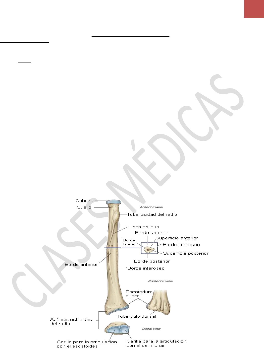 MATERIAL DIDÁCTICO DE MEDICINA ANATOMÍA DEL MIEMBRO SUPERIOR 1 CLASES INDIVIDUALES - CLASES GRUPALES // FINALES - PARCIALES – LIBRES - RECUPERATORIOS CLASES MÉDICAS TODOS LOS DERECHOS RESERVADOS POR LOS AUTORES email: clasesmedicas@hotmail.com Cel: 156-972-8345 WEB: http://classmed.wix.com/clasesmedicas Telf: (011) 3970-3655 ANATOMÍA DEL ANTEBRAZO huesos del Antebrazo El armazón esquelético del antebrazo está formado por el cuerpo y epífisis distales de los huesos cúbito y radio. 1. Radio: Hueso par, asimétrico y largo. Es un hueso largo, ubicado en la parte lateral del antebrazo, entre el capítulo del húmero y los huesos del carpo. Se describen un cuerpo y dos epífisis. El cuerpo (diáfisis) presenta una forma triangular que permite describir tres caras y tres bordes. La cara anterior, plana, presenta el foramen nutricio del hueso; y en su parte superior, se inserta el músculo flexor largo del dedo pulgar; mientras que en su parte inferior lo hace el músculo pronador cuadrado. En la cara lateral, redondeada, se inserta en su parte superior el músculo supinador; y en su parte media, el músculo pronador redondo. La cara posterior en su parte superior está cubierta por el músculo supinador; en su parte media unas crestas marcan la superficie de inserción de los músculos abductor largo y extensor corto del dedo pulgar. Presenta 3 bordes: • El borde anterior • El borde posterior • El borde interóseo, cortante, nace en la tuberosidad del radio y se extiende distalmente hasta bifurcarse; en él se inserta la membrana interósea que une el radio al cúbito. La extremidad (epífisis) superior se articula con el capítulo (cóndilo) del húmero, se compone de la cabeza del radio, el cuello del radio y la tuberosidad del radio, donde se inserta el tendón del músculo bíceps braquial. La extremidad (epífisis) inferior es la porción más voluminosa del hueso y participa en la articulación radiocarpiana, presenta la apófisis estiloides, su cara inferior es la cara articular carpiana, triangular, que se encuentra dividida por una cresta en dos partes: una lateral, triangular, para articularse con el hueso escafoides y otra medial, cuadrilátera, para el hueso semilunar. MATERIAL DIDÁCTICO DE MEDICINA ANATOMÍA DEL MIEMBRO SUPERIOR 2 CLASES INDIVIDUALES - CLASES GRUPALES // FINALES - PARCIALES – LIBRES - RECUPERATORIOS CLASES MÉDICAS TODOS LOS DERECHOS RESERVADOS POR LOS AUTORES email: clasesmedicas@hotmail.com Cel: 156-972-8345 WEB: http://classmed.wix.com/clasesmedicas Telf: (011) 3970-3655 2. Cúbito: Hueso par, asimétrico y largo: Es un hueso largo, ubicado en la parte medial del antebrazo, entre la tróclea del húmero y los huesos del carpo. Se describen un cuerpo y dos epífisis. Su cuerpo (diáfisis), más voluminoso en su parte proximal, es prismático triangular y se describen tres caras y tres bordes: • La cara anterior en su parte proximal se inserta el músculo flexor profundo de los dedos; mientras que su parte distal se inserta la cabeza cubital del músculo pronador redondo. • En la cara posterior se encuentra la superficie de inserción del músculo ancóneo; y por debajo aparecen crestas óseas longitudinales donde se insertan los músculos extensores cubital del carpo, extensor del dedo índice, abductor largo del dedo pulgar extensor corto del dedo pulgar, extensor largo del dedo pulgar y supinador. • En la cara medial se inserta el músculo flexor profundo de los dedos. Además, posee 3 borde: • borde anterior. • borde posterior. • borde interóseo sirve de inserción a la membrana interósea. La extremidad (epísisis) superior forma parte de la articulación del codo y presenta una superficie articular, la escotadura troclear, con forma de semiluna, articula con la tróclea del húmero. En su parte inferior se prolonga hacia delante, por la apófisis coronoides, que en la flexión del codo ocupa la fosa coronoidea del húmero. Por debajo de la apófisis coronoides, se encuentra una superficie rugosa, la tuberosidad del cúbito, donde se inserta el músculo braquial. Lateralmente, encontramos otra superficie articular, la escotadura radial, que se articula con el radio. Hacia atrás, la extremidad superior, se eleva en una saliente voluminosa y cuadrangular, el olécranon, cuya cara anterior contribuye a formar la escotadura troclear. La extremidad (epísisis) inferior presenta un extremo abultado, la cabeza del cúbito, la apófisis estiloides del cúbito. MATERIAL DIDÁCTICO DE MEDICINA ANATOMÍA DEL MIEMBRO SUPERIOR 3 CLASES INDIVIDUALES - CLASES GRUPALES // FINALES - PARCIALES – LIBRES - RECUPERATORIOS CLASES MÉDICAS TODOS LOS DERECHOS RESERVADOS POR LOS AUTORES email: clasesmedicas@hotmail.com Cel: 156-972-8345 WEB: http://classmed.wix.com/clasesmedicas Telf: (011) 3970-3655 Membrana interósea: SINDESMOSIS DEL ANTEBRAZO La membrana interósea es una delgada lamina fibrosa que conecta el borde medial del radio con el borde lateral del cúbito. Tiene un borde libre superior que se sitúa inferior la tuberosidad radial, y una pequeña abertura circular en el tercio distal, para el paso de vasos sanguineos. La membrana interósea conecta cubito y radio, sin restringir movimientos de pronación y supinación Movimientos de pronación y supinación entre cubito y radio. Se producen completamente en el antebrazo e implican la rotación del radio en el codo, y el desplazamiento del extremo distal del radio sobre el cúbito. En el codo, la superficie articular superior de la cabeza del radio, gira sobre el capítulo del húmero, mientras que la superficie articular del lado de la cabeza, se desliza sobre la escotadura radial del cúbito y las zonas adyacentes. Durante estos movimientos los huesos quedan unidos por: • Ligamento anular del radio • Membrana interósea • Disco articular en la articulación radio cubital distal ARTICULACIONES DEL ANTEBRAZO: 1. ARTICULACIÓN DEL CODO: Presenta una estructura compleja de tres arti