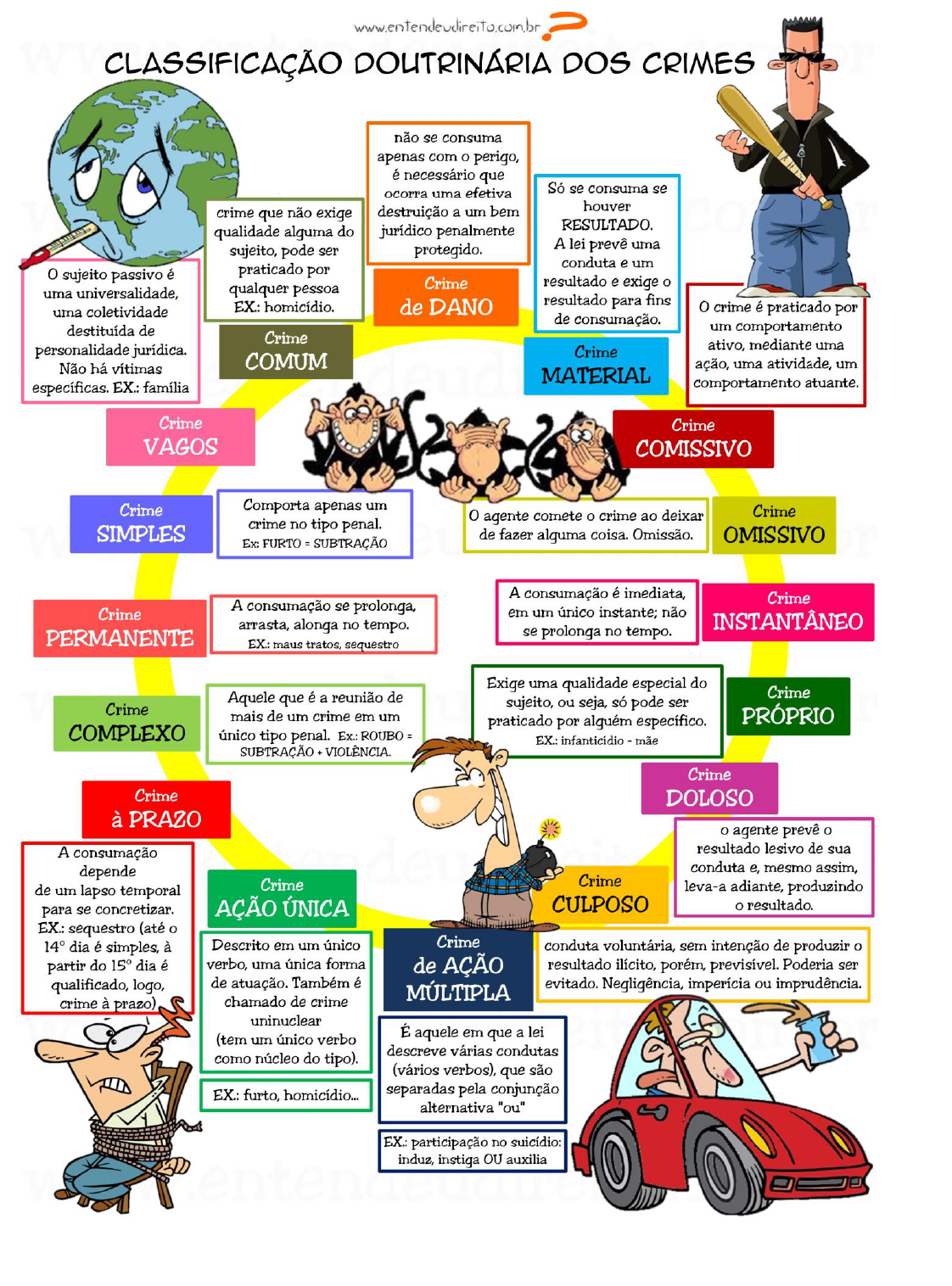 ENTENDEU DIREITO OU QUER QUE DESENHE? A reprodução deste material é condicionada a autorização, sendo terminantemente proibido o seu uso para fins comerciais. A violação do direito autoral é crime, punido com prisão e multa, sem prejuízo da busca e apreensão do material e indenizações patrimoniais e morais cabíveis. Inscrição no INPI: 905146603 para Classe 41 (educação) e 905146573 para Classe 16 (livros didáticos e congêneres) - Biblioteca Nacional: n° 2012/RJ/19521 - 641.675, livro 1.233 folha 417- Website protegido por leis de direitos autorais. Assessoria Jurídica: Tiago Koutchin - OAB/MS 14.707 - contato: tiagok.rosavitoriano@hotmail.com 1 ENTENDEU DIREITO OU QUER QUE DESENHE? A reprodução deste material é condicionada a autorização, sendo terminantemente proibido o seu uso para fins comerciais. A violação do direito autoral é crime, punido com prisão e multa, sem prejuízo da busca e apreensão do material e indenizações patrimoniais e morais cabíveis. Inscrição no INPI: 905146603 para Classe 41 (educação) e 905146573 para Classe 16 (livros didáticos e congêneres) - Biblioteca Nacional: n° 2012/RJ/19521 - 641.675, livro 1.233 folha 417- Website protegido por leis de direitos autorais. Assessoria Jurídica: Tiago Koutchin - OAB/MS 14.707 - contato: tiagok.rosavitoriano@hotmail.com 2 No Código Penal atual não existe uma definição de crime, então a doutrina desenvolveu alguns conceitos. Existem três tipos de forma de conceituar o crime, segundo Mirabete e Fernando Capez, que são o conceito formal, material e analítico, onde veremos agora a definição de cada um deles. O conceito formal é aquele que segue o que a lei diz, sendo assim o legislador define uma conduta como crime, já existira o crime por si só, sem entrar em sua essência, em seu conteúdo, em sua matéria. Já o conceito material procura explicar o que é o crime, sob vários outros aspectos que chegam a envolver outras ciências extrajurídicas, como por exemplo, a Sociologia, a Filosofia, a Psicologia etc. Esse conceito procura uma definição de crime indagando a razão que levou o legislador a prever a punição dos autores de certos fatos e não de outros, fazendo assim uma análise mais profunda para definir o que é crime e não apenas ao aspecto externo do crime. Manzini define o crime, sob o aspecto material, como se delito for à ação ou omissão, imputável a uma pessoa, lesiva ou perigosa a interesse penalmente protegido, constituída de determinados elementos e eventualmente integrada por certas condições, ou acompanhadas de determinadas circunstâncias previstas em lei. Mirabete diz que as referências nessas definições de crime, sob o aspecto material, a “valores ou interesses do corpo social”, “condições de existência, de conservação e de desenvolvimento da sociedade” e “norma de cultura” apresentam problemas. Manoel Pedro Pimentel afirma que resta ainda dificuldade em fixar o critério, segundo o qual o legislador consideraria conduta à norma de cultura. Por esse motivo não foi criado um conceito material inatacável de crime. O conceito analítico diz que o crime é a “ação típica, antijurídica e culpável”. Segundo Battaglini crime é “o fato humano descrito no tipo legal e cometido com culpa, ao qual é aplicável a pena”. Basileu Garcia já define crime como a “ação humana, antijurídica, típica, culpável e punível”. Mesmo a punibilidade sendo a “possibilidade de aplicar-se a pena”, ele não é elemento do crime. Segundo Hungria “um fato pode ser típico, antijurídico, culpado e ameaçado de pena, isto é, criminoso e, no entanto, anormalmente deixar de acarretar a efetiva imposição da pena”. O conceito mais usado é o que diz que crime é a “ação típica, antijurídica e culpável”, sendo utilizada tanto pelos autores que seguem a teoria causalista, como pelos que seguem a teoria finalista da ação. A culpabilidade para a teoria causalista consiste no vínculo subjetivo que liga a ação ao resultado, ou seja, no dolo, ou na culpa em sentido estrito por imprudência, negligência ou imperícia. Na teoria finalista a conduta ou ação é uma atividade que sempre tem uma finalidade. O conceito analítico abrange o dolo e a culpa em sentido estrito, sendo assim, o crime existe em si mesmo, por um fato típico e antijurídico, e a culpabilidade significa reprovabilidade ou censurabilidade de conduta. O crime tem os requisitos genéricos e os requisitos específicos. Os requisitos genéricos são a tipicidade e a antijuricidade, e os específicos são as circunstâncias elementares, que estão descritos no artigo 30 do CP, exemplo é o verbo que descreve a conduta, o objeto material, os sujeitos ativo e passivo, etc. CLASSIFICAÇÃO DOUTRINÁRIA DOS CRIMES · CRIME COMUM – crime que não exige qualidade alguma do sujeito, pode ser praticado por qualquer pessoa – ex.: homicídio. · CRIME PRÓPRIO – crime que exige uma qualidade especial do sujeito, ou seja, só pode ser praticado por alguém específico – ex.: infanticídio (só a mãe pode praticar), peculato (só o funcionário público pode praticar). · CRIME DE MÃO PRÓPRIA – crime que não admite coautoria ou participação – ex.: falso testemunho. · CRIME DE DANO – aquele que se consuma ou exige efetiva lesão ao bem jurídico tutelado – ex.: expor alguém a doença venérea. (Artigos 130 q 136, crimes de perigo). · CRIME DE PERIGO – se consuma com a simples exposição do bem ao perigo. ABSTRATO – descreve uma conduta e presume que o agente, ao realizá-la, expõe. · CRIME MATERIAL – Só se consuma se houver RESULTADO. A lei prevê uma conduta e um resultado e exige o resultado para fins de consumação. · CRIME FORMAL – Também chamado de consumação antecipada, ou seja, basta conduta para que haja consumação. Conduta e resultado, mas dispensa o resultado. Ex.: Art.140 - Injuriar alguém, ofendendo l