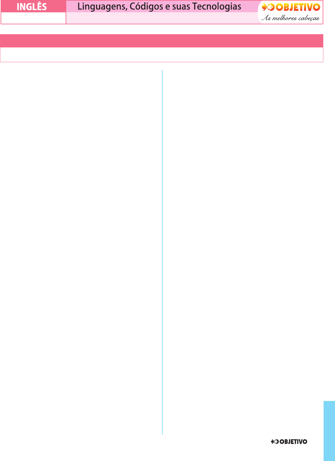 – 33 IN G LÊ S D MÓDULO 13 VOCABULARY I. Verbs 1. order 2. keep 3. let 4. meet 5. thank 6. dream 7. do 8. knock 9. put 10.read 11.kiss 12.start 13. tell 14.talk 15.end 16.take Fill in the sentences, using the verbs above. kiss1. Can you come and _______________ good night? put2. Could you _____________ the luggage on the floor? take3. Does he want me to ___________________ his book back to the bookcase? tell4. Can you _____________ me the way to the restaurant? order5. Would you like to _________________ your dinner now? read6. It’s very easy to _________________ your writing. end7. At what time does the movie _____________? do8. I have a lot of homework to _________ tonight. keep9. You can _____________ the book. I don’t need it. meet10. Can you _____________ him outside the bar? let11. Will the teacher _____________ him come in if he’s late? knock12. Please _________________ on the door before you go in. talk13. She has to _______________ to her father about it. dream14. I ___________________ about him every day. start15. Let’s ____________________ ! Let’s do the first one! thank16. I’d like to ____________________ you for all your help. II. Complete each sentence with the opposite of the word in parentheses. 1. wet 2.light 3.clean 4.slow 5. thin 6.low 7.cold 8.right 9. tall 10.loud 11.easy 12.poor 13. good 14.old 15.small 16.open old1. She’s going to wear her ___________ clothes. (new) low2. There is a __________ wall around the house. (high) thin3. The ice was very ____________ in some places. (thick) slow4. The traffic is very _____________ at 5:00. (fast) C2_Ingles_D_Prof_Lu 2012 24/11/11 14:21 Página 33 34 – IN G LÊS D right5. This is the ______________ answer to the question. (wrong) wet6. You’d better clean it with a _________ cloth. (dry) small7. We live in a _____________ house in the country. (big) easy8. It’s ____________ to get a job in this city. (difficult) clean9. The kitchen is very _______________. (dirty) cold10. Can I have some more ____________ water, please? (hot) open11. The store is still _____________. (closed) loud12. She often speaks in a very ____________ voice. (quiet) poor13. They come from a very ______________ family. (rich) light14. She had _________________ brown hair. (dark) tall15. John is really _____________ and has white hair. (short) good16. Paul is very _____________ at his job. (bad) III. Complete the sentences with the correct words. 1. She’ll wait for me ________ the corner of the street. a) inside b) in c) at d) to RESOLUÇÃO: Resposta: C 2. Don’t walk in the street, kids! Stay on the _______! a) sidewalk b) way c) route d) street RESOLUÇÃO: Resposta: A 3. We’re going __________ a guided tour of the town. a) by b) on c) at d) in RESOLUÇÃO: Resposta: B 4. This is a _________ zone. No vehicles are allowed. a) traffic b) car c) pedestrian d) truck RESOLUÇÃO: Resposta: C 5. We can see all the tourists slowly _______________ around the souvenir shops. a) rushing b) wandering c) running d) marching RESOLUÇÃO: Resposta: B 6. Do you know where we can _____________ a bus to the movie theater? a) meet b) catch c) fetch d) become RESOLUÇÃO: Resposta: B 7. They’re pulling down all those buildings to make room for a ______________. a) parking lot b) mail box c) streetcar d) well RESOLUÇÃO: Resposta: A 8. My train leaves from _________ 7. a) park b) track c) stop d) quay. RESOLUÇÃO: Resposta: B 9. There’s a bus ___________ just outside my house. a) start b) stop c) quay d) station RESOLUÇÃO: Resposta: B 10. He’s just going to ________ a picture of that square. a) take b) do c) make d) have RESOLUÇÃO: Resposta: A C2_Ingles_D_Prof_Lu 2012 24/11/11 14:21 Página 34 – 35 IN G LÊ S D WHO SAYS ONE BILLION PEOPLE DISABLED A new report from the World Health Organization (WHO) says the proportion of disabled people in the world is rising. It estimates around 15 per cent of the global population has some form of disability – that’s one billion people. This figure has increased from 10 per cent in the 1970s. The World Report on Disability says about one in five of the 15 per cent, nearly 200 million, suffer from a severe disability. WHO director-general Dr Margaret Chan warned: “In the years ahead, disability will be an even greater concern due to ageing populations and the higher risk of disability in older people as well as the global increase in chronic health conditions such as diabetes, cardiovascular disease, cancer and mental health disorders.” One of the most worrying conclusions of the report is that the disabled are more likely to face discrimination in the future. The WHO says the disabled will have greater problems finding work and accessing healthcare. The report authors say disabled people are three times more likely to be denied healthcare than other people in developed countries. The WHO’s Tom Shakespeare said: “The clear message from the report is that there is no country that has got it right.” Dr Chan said: “Almost every one of us will be permanently or temporarily disabled at some point in life. We must do more to break the barriers which segregate people with disabilities, in many cases forcing them to the margins of society.” (breakingnewsenglish) MÓDULO 14 TEXT VOCABULARY I. a) WHO stands for World Health Organization = Organização Mundial de Saúde (OMS) b) Someone who is disabled is unable to use part of their body or brain properly because of injury or disease. incapacitado, deficiente* disabled = __________________________________________ Translate the title of the passage. A Organização Mundial de Saúde diz que um bilhão de pesssoas são incapacitadas. II. Match the columns. 1. report 1 c a) ainda 2. around = nearly = almost 2 f b) risco 3.1970 s 3 h c) relatório 4.ahead 4 j d) que está (estão) envelhecendo 5.even 5 a e) prováveis 6.ageing 6 d f) aproximadamente 7.risk 7 b g) margens 8.as well as 8 i h) década de 70 9.likely 9 e i) bem como 10.margins