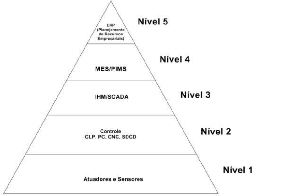 ATIVIDADE DISCURSIVA – PIRÂMIDE DE AUTOMAÇÃO A automação envolve processos variados que estão interligados entre si para o funcionamento de um sistema produtivo, tais processos podem ser organizados com componentes e suas respectivas funções, que vão desde os equipamentos e dispositivos em campo até o gerenciamento corporativo da empresa, em forma de pirâmide, conforme a arquitetura definida pela norma ANSI/ISA 95 (ANSI, 2000). No diagrama da pirâmide de automação vemos uma hierarquia em 5 níveis que se comunicam entre si através da integração de suas redes. Para exemplificar o funcionamento da estrutura, podemos dividir a pirâmide em duas, sendo que a primeira vemos a visão orientada a componentes e a outra focada na visão das funções de cada nível da hierarquia. Para a visão orientada a componentes temos: Figura 1 – Pirâmide de Automação visão de componentes Cada nível representa uma hierarquia no processo de automação, de forma que o Nível 5, na figura 1, é o mais alto. Nesse entendimento se faz necessário a visão da pirâmide em relação às funções de cada Nível: Figura 2 – Pirâmide de Automação visão de funções Tendo em vista a pirâmide dívida em 2 partes, podemos juntar as visões de componentes e funções em cada nível para entendermos o funcionamento dessa arquitetura: Nível 1 – Nesse nível hierárquico ficam os maquinários e componentes da linha de montagem ou manufatura; Nível 2 – Aqui ficam os controladores digitais automáticos, que supervisionam o nível 1. São os Controladores Lógicos Programáveis (CLPs), a técnica de Controle Numérico Computadorizado (CNC), Processadores Centrais (PCs) e o Sistema Digital de Controle Distribuído (SDCD); Nível 3 – Nesse estágio de hierarquia, o processo produtivo é controlado por banco de dados SCADA (Sistema de Supervisão e Aquisição de Dados) através de IHM (Interface Homem-Maquina). O objetivo desse nível é avaliar e supervisionar o controle de qualidade do processo produtivo. Nível 4 – Programação e planejamento da produção através do Sistema de Execução de Produção (MES) e do Sistema de Gerenciamento de Informação da Produção (PIMS). Nível 5 – Nível onde fica o Sistema de Gestão Empresarial (ERP), neste topo da pirâmide são tomadas todas as decisões para o gerenciamento do sistema produtivo, isso se dá com a integração das informações do Financeiro, Recursos Humanos, Vendas, Compra de Materiais. A Pirâmide de Automação visa organizar os níveis de controle com a distribuição em etapas hierárquicas. Observando analiticamente sua estrutura, pode- se observar que no topo está o gerenciamento executivo e planejamento, conforme o nível desce as estratégias vão sendo aplicadas e informações do processo são coletadas e transformadas em estatísticas, até chegar no nível mais baixo, também chamado de chão de fábrica, onde os equipamentos recebem comandos para a produção. REFERÊNCIAS RIBEIRO, Marco Antônio. Automação Industrial. Tek Treinamento & Consultoria Ltda. 4ª Ed. Salvador, 1999. Disponível em: https://www.passeidireto.com/arquivo/5232343/automacao-industrial, Acesso em 18/11/2017. SOARES, Franciele S, CAMARGO, Nayara de O. História e Pirâmide da Automação Industrial. Faculdade do Sul da Bahia. Teixeira de Freitas, 2010. Disponível em: http://www.ebah.com.br/content/ABAAABa0gAF/automacao, Acesso em 18/11/2017.