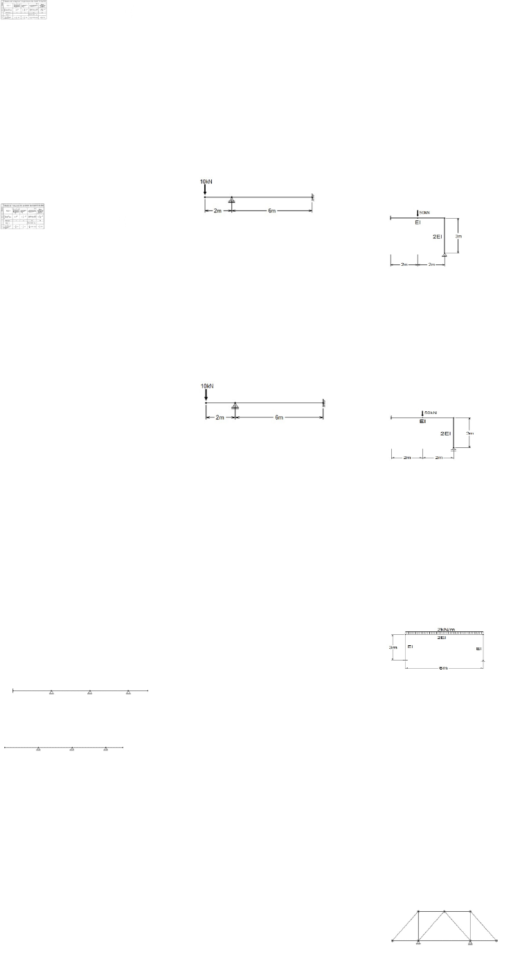 ►O processo da carga unitária para o cálculo de deslocamento consiste em: A-adotar no estado de carregamento uma “força” unitária que age sozinha na estrutura, que corresponde ao deslocamento procurado; ►Um procedimento prático na aplicação do PTV para cálculo de deslocamento é conhecido como: C -Processo da carga unitária; ►Para o estado de deslocamento causado por carregamento externo pode-se obter as deformações através das expressões da resistência dos materiais. Qual das expressões abaixo representa a deformação angular de flexão: C -(Mb/EI)dx; ►Para o estado de deslocamento causado por carregamento externo pode-se obter as deformações através das expressões da resistência dos materiais. Qual das expressões abaixo representa a deformação axial: A -(Nb/EA)dx; ►Para o estado de deslocamento causado por carregamento externo pode-se obter as deformações através das expressões da resistência dos materiais. Qual das expressões abaixo representa a deformação transversal: B -(cVb/GA)dx; ►Analise as assertivas abaixo: I - Quando a deformação angular de flexão existir ela será maior que a deformação axial e transversal; II - Quando a deformação angular de flexão existir ela não será maior que a deformação axial e transversal; III – Para as treliças a deformação axial será maior que a deformação angular de flexão e transversal; IV - A deformação axial e transversal sempre poderão ser desprezadas para efeito de simplificação do cálculo no caso do cálculo manual; A -Apenas I e III estão corretas; ►Seja a tabela abaixo: Para uma viga em balanço de comprimento L com uma carga concentrada P na extremidade livre qual dos produtos de funções abaixo representa o que resultaria na flecha máxima desta viga: B -Triângulox Triângulo; ►Seja a tabela abaixo: Para uma viga em balanço de comprimento L com uma carga concentrada P na extremidade livre qual o produto de funções abaixo que representa a flecha máxima desta viga: B-LFG/3EI ►Para resolução de uma estrutura hiperestática é necessário um processo de cálculo para obter-se os esforços solicitantes. Qual dos processos de cálculo descrito abaixo se refere ao cálculo de estruturas hiperestáticas: E-Todas as alternativas anteriores estão corretas; ►O processo dos esforços utilizado para obter os esforços solicitantes de estruturas hiperestáticas tem por base: D -Uma superposição de efeitos e estabelecimento de um sistema de equações de compatibilidade de deslocamentos; ►Seja a viga hiperestática abaixo: Qual das estruturas abaixo não representa uma possível estrutura isostática fundamental: C ►Para a superposição dos efeitos no processo dos esforços o problema real pode ser equivalente a um problema fictício o qual representa: B-A estrutura isostática fundamental com todas as incógnitas hiperestáticas e com o carregamento externo; ►No processo dos esforços devem ser obtidos: D -os deslocamentos calculados através do PTV pelo processo da carga unitária; ►No processo dos esforços qual das equações abaixo representa a equação de compatibilidade de deslocamento para uma estrutura uma vez hiperestática: B /X1 = - (D10/d11) ►Adotando como incógnita hiperestática o momento fletor no engaste no sentido antihorário para EI constante, qual o valor de D10 e d11, respectivamente C /- 20/EI e 2/EI ►Seja viga abaixo: Adotando como incógnita hiperestática o momento fletor no engaste no sentido antihorário para EI constante, qual o valor da incógnita hiperestática: C /+10kN.m; ►No processo dos esforços para se obter as estruturas isostáticas fundamentais possíveis quantos vínculos devem ser retirados da estrutura hiperestática: D-Equivalente ao grau de hiperestaticidade da estrutura; ►Os vínculos retirados da estrutura hiperestática para transformá-la numa estrutura isostática fundamental no processo dos esforços passa a chamar-se: C -Incógnitas hiperestáticas; ►Para a superposição dos efeitos no processo dos esforços é feito a divisão de um problema zero e os demais problemas equivalente ao grau de hiperestaticidade da estrutura. O problema zero representa: A-A estrutura isostática fundamental sem as incógnitas hiperestáticas, mas com o carregamento externo; ►No processo dos esforços após encontrado as incógnitas hiperestáticas através das equação de compatibilidade de deslocamento como deve se proceder para obter os esforços finais das estruturas hiperestáticas: B -Apenas a I e II estão corretas; ►No processo dos esforços os deslocamento devido aos vínculos incógnito é designado por dij. Esses deslocamentos podem ser representado através de uma matriz [dij]. Como se chama essa matriz: D -Matriz de flexibilidade; ►Seja o pórtico abaixo: Adotando como incógnita hiperestática o momento fletor no engaste no sentido horário, qual o valor de D10 e d11, respectivamente: D /+50/EI e +4/3EI; ►Seja o pórtico abaixo: Adotando como incógnita hiperestática o momento fletor no engaste no sentido horário, qual o valor da incógnita hiperestática: B /-37,5kN.m; ►Seja o pórtico abaixo: Adotando como incógnita hiperestática o momento fletor no engaste no sentido antihorário e o reação horizontal para direita no apoio fixo, qual o valor de D20 e d21, respectivamente: A /+54/EI e -9/EI; ►Para treliças hiperestáticas pode ser aplicado o processo dos esforços. Neste caso solução das treliças hiperestáticas é feita: D -através de uma superposição de efeitos e estabelecimento de um sistema de equações de compatibilidade de deslocamentos; ►Pode-se classificar a treliça abaixo como: A -Isostática; ►Chama-se treliça ideal: A -Ao sistema reticulado cujas barras tem todas as extremidades rotuladas e cujas cargas estejam aplicadas apenas em seus nós; ►Para a treliça hiperestática abaixo qual(is) alternativa(s) representa(m) uma possível treliça isostát