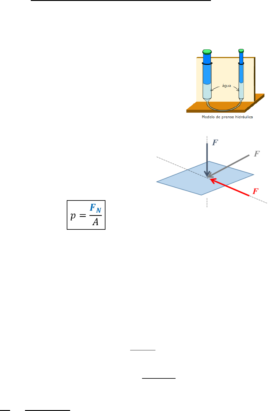FENÔMENOS DE TRANSPORTE I Aula 02 – Estática dos Fluidos e Manômetria 1. O que é a Estática dos Fluidos? A ESTÁTICA DOS FLUIDOS, é o ramo da Física que estuda as propriedades dos fluidos sob a ação de um campo gravitacional constante e em EQUILÍBRIO ESTÁTICO, ou seja, quando a soma de todas as forças atuando no gás ou líquido é igual a zero. A HIDROSTÁTICA tem o mesmo significado, só que é aplicada somente para os líquidos. Exemplo de aplicações: prensa e elevador hidráulico, freio a disco, encanamentos e tubulações em geral, etc. 2. Pressão Como foi visto na aula anterior, uma força F aplicada sobre uma superfície plana em contato com um fluido, resultará em dois efeitos: um tangencial que origina às TENSÕES DE CISALHAMENTO e outro normal que origina às PRESSÕES. Define-se PRESSÃO como sendo: PRESSÃO nunca deve ser confundida com FORÇA. Veja o exemplo abaixo: Exemplo 01 (Exercício 34, pág. 459, Tipler, 6ª Ed.) Quando uma mulher, em sapatos de salto alto, dá um passo, ela momentaneamente aplica todo seu peso no salto do sapato. Se a sua massa for 56 kg e se a área da base do salto for 1 cm2, qual é a pressão exercida no chão pelo salto em Pa? Compare sua resposta com a pressão exercida por um pé de elefante sobre um piso horizontal. Suponha que a massa do elefante seja igual a 5000 kg, com as patas igualmente distribuídas sobre o piso e cada pata com uma área de 400 cm2. Dado: g = 9,81 m/s2. Mulher m = 56 kg - 28 kg 𝒑𝒎 = 28 𝑥 9,81 10−4 = 2,746 𝑥 106 𝑃𝑎 A = 1 cm2 – 1.10-4 m2 Elefante m = 5.000 kg A = 400 cm2 𝒑𝒆 = 1.250 𝑥 9,81 400 . 10−4 = 306,562 x 103 Pa 𝑝𝑚 𝑝𝑒 = 2,746 𝑥 106 306,562 𝑥 103 pm = 8,96 pe 2.1 Pressão Hidrostática ou Efetiva (pef) A PRESSÃO HIDROSTÁTICA ou PRESSÃO EFETIVA em um ponto de um fluido em equilíbrio é a pressão que a coluna exerce naquele ponto. Considere um recipiente cilíndrico de área A com um fluido até a altura h. A pressão efetiva pef no ponto B será: Podemos expressar pef dada pela Eq. (4) como função do peso específico , ou seja: 2.2 Pressão Total ou Absoluta (pabs) Levando em conta a pressão atmosférica patm no problema anterior, a pressão total ou absoluta pabs no ponto B é: Exemplo 02 A água de um lago localizada numa região montanhosa apresenta temperatura média igual a 100C e profundidade máxima do lago de 40 m. Se a pressão barométrica local é igual a 598 mmHg, determine a pressão efetiva e absoluta no fundo do lago. Considere a massa relativa do mercúrio igual a 13,54. 2.3 Teorema de Stevin “A diferença de pressão Δp entre dois pontos de um fluido homogêneo e incompressível em repouso com massa específica e peso específico é proporcional a diferença de altura Δh (cota) entre esses dois pontos.” 2.3.1 Consequências do Teorema de Stevin Do Teorema de Stevin conclui-se que: Não importa a distância entre os pontos, a diferença de pressão só dependerá da diferença entre as cotas Δh. Pontos à mesma profundidade, terão a mesma pressão. O formato do recipiente (vasos comunicantes) não importa para o cálculo da pressão. No caso dos gases, onde o peso específico é pequeno, se a diferença de altura entre dois pontos não é muito grande, pode-se desprezar a diferença de pressão entre eles. A pressão em um ponto de um fluido homogêneo em equilíbrio estático (repouso) é a mesma em qualquer direção. 2.4 Lei ou Princípio de Pascal Blaise Pascal (francês: [blɛz paskal]; 1623 - 1662) foi um matemático, físico, inventor, escritor e filósofo. Era um menino prodígio que foi educado por seu pai, um coletor de impostos em Rouen. Pascal fez importantes contribuições para o estudo de fluidos, e estabeleceu os conceitos de pressão e vácuo baseando-se no trabalho de Evangelista Torricelli. Pascal também foi um defensor do método científico criado por Newton. Suas invenções incluem a prensa hidráulica (usada para multiplicar a força), a calculadora e a seringa. Ele mostrou que a pressão hidrostática não depende do peso do fluido, e sim da elevação. Ele demonstra este princípio, conectando um tubo fino a um barril e o preenchendo com água até o terceiro andar de um edifício. Isso fez com que o barril arrebentasse, o que ficou conhecido como o experimento de Pascal. Em sua homenagem, a unidade de pressão no S.I. leva o seu nome. “Quando um ponto em um líquido em equilíbrio estático (em repouso) sofre variação de pressão, todos os outros pontos também sofrem a mesma variação. ” Uma aplicação do Princípio de Pascal é a PRENSA HIDRÁULICA, que consiste em dois vasos comunicantes, com êmbolos de áreas diferentes A1 e A2, que se movem livremente sobre a superfície dos fluidos. Aplicando-se uma força F1 sobre o êmbolo de área A1, a pressão exercida é propagada pelo líquido até o êmbolo de área A2, portanto: Como A2 > A1 F2 > F1. A prensa hidráulica é um dispositivo que multiplica a intensidade da força. Exemplo 03 Dois êmbolos têm, respectivamente, áreas 𝐴1 = 10 cm 2 e 𝐴2 = 100 cm 2. Se for aplicada uma força de 200 N no êmbolo 1, qual será a força transmitida no êmbolo 2? p1 = p2 𝐹1 𝐴1 = 𝐹2 𝐴2 200 10 = 𝐹2 100 F2 = 2.000 N 2.5 Carga de Pressão (h) Como visto no Teorema de Stevin, a pressão e a altura da coluna de fluido matem uma relação constante. É possível então expressar a pressão em um certo fluido em unidade de comprimento. Lembrando-se que a Equação é: Onde h é a carga de pressão. Podemos verificar a natureza de h em um exemplo prático: Outro exemplo é um tubo por onde escoa um fluido de peso específico à pressão p. Como calcular a pressão? Exemplo 04 A queda de pressão no escoamento de água em um tubo de diâmetro constante (Fig.a) e em um tubo cujo diâmetro diminui (Fig.b) pode ser facilmente observada. 2.6 Escalas de Pressão Se p é medida em relação ao vácuo, é chamada PRESSÃO ABSOLUTA; quan