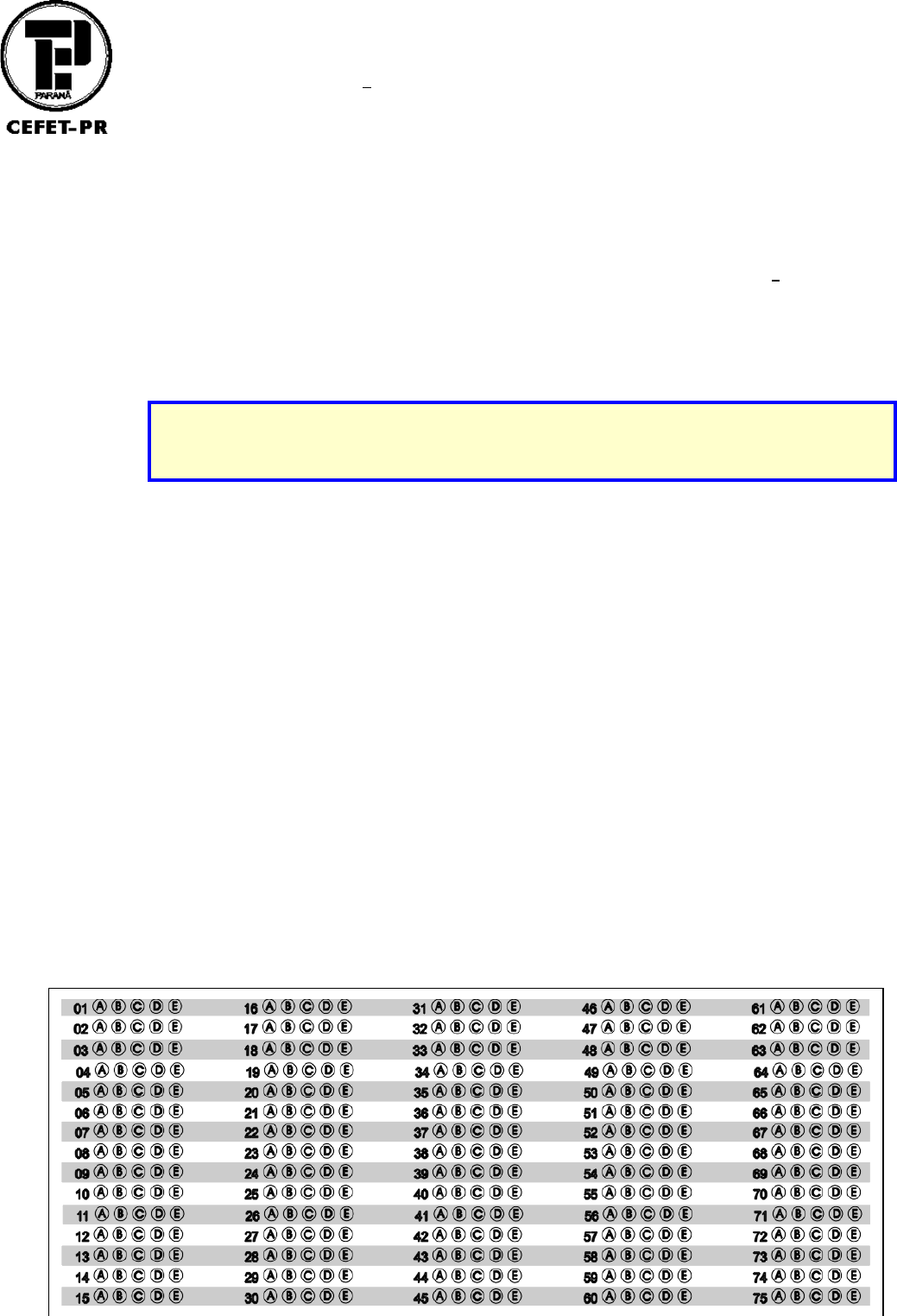 � PAGE �2� • Cefet 1A / Inverno 2002 Cefet 1A / Inverno 2002 • � PAGE �1� CENTRO FEDERAL DE EDUCAÇÃO TECNOLÓGICA DO PARANÁ CONCURSO VESTIBULAR INVERNO / 2002 1a PROVA: Redação / Língua Portuguesa / Lingua Estrangeira Moderna / Biologia 07 / JULHO / 2002 Nome do candidato: No de inscrição (USE LETRA DE FORMA) Assinatura: Instruções 01) Confira se os dados impressos acima, que identificam esta prova, estão corretos. Preencha com seu nome e número de inscrição. Assine em seguida. 02) O caderno de prova deverá conter 42 (quarenta e duas) questões, sendo 02 (duas) de Redação, numeradas de 01 a 02; e 40 (quarenta) questões de múltipla escolha, com 5 (cinco) alternativas, das quais 1 (uma) só é correta, assim distribuídas: 15 (quinze) questões de Língua Portuguesa e Literatura Brasileira, numeradas de 01 a 15; 10 (dez) questões de Língua Estrangeira Moderna, numeradas de 16 a 25, e 15 (quinze) questões de Biologia, numeradas de 26 a 40. 03) A duração da prova será de 3h30min (três horas e trinta minutos). Ao final, haverá mais 15 (quinze) minutos para a marcação no cartão-resposta. 04) Inicie a resolução desta prova pelas questões de Redação. Transcreva o texto para a Folha de Redação. Ao final do prazo de 1h30min (uma hora e trinta minutos) o Fiscal recolherá compulsoriamente estas folhas. Terminadas as Redações, entregue-as ao Fiscal e inicie a resolução das demais questões deste caderno. 05) A interpretação das questões é parte integrante da prova, não sendo, portanto, permitidas perguntas aos Fiscais. 06) A prova é INDIVIDUAL, sendo vetada a comunicação entre os candidatos durante sua realização. 07) Será eliminado o candidato que utilizar material de consulta ou qualquer sistema de comunicação. 08) Em cada questão, há somente uma resposta correta. Para facilitar, posteriormente, o preenchimento do cartão-resposta, você poderá marcar, no modelo abaixo, a letra da alternativa que considera correta, antes de transcrevê-la para o cartão-resposta. Nesse quadro, poderá haver rasuras. 09) Não copie as respostas para comparar com o resultado, pois a ordem das alternativas publicadas será diferente da do candidato. 10) O caderno de prova deve ser entregue para o Fiscal, juntamente com o Cartão-Resposta. 11) Ao receber seu cartão-resposta, aja da seguinte forma: a) verifique se os dados pré-impressos estão corretos; b) assine no local indicado; c) pinte, preenchendo por inteiro, com caneta esferográfica ponta média, tinta azul-escura, o campo correspondente à alternativa que considera correta em cada questão; d) não o amasse, nem dobre. Modelo do Cartão-Resposta redação Redação 01 Leia o seguinte fragmento de uma narrativa e produza um texto entre 06 e 10 linhas que lhe dê continuidade, criando um desfecho para ele. Transcreva o texto para a Folha de Redação. Foi tropeçando nos móveis, arrastou com esforço o pesado armário da janela, desembaraçou a cortina, e a luz invadiu o depósito onde a mulher morria. Com o ar fino veio uma decisão. Não deixaria a mulher para chamar ninguém. Sabia que não poderia fazer nada para ajudá-la, a não ser sentar-se à beira da cama, pegar-lhe nas mãos e esperar o que ia acontecer. (Carlos Drummond de Andrade, “A doida”. In: Contos de Aprendiz. Rio de Janeiro, Record, 1997.) (ESPAÇO PARA RASCUNHO) Redação 02 Analise os dados apresentados abaixo e produza um texto argumentativo a respeito do assunto. Utilize de 06 a 10 linhas. Transcreva o texto para a Folha de Redação. Alguns números: • Uma criança nascida hoje em Nova York, Londres ou Paris, por sua capacidade de consumo, terá um impacto sobre os recursos naturais, ao longo de sua vida, 50 vezes mais forte que o de uma criança nascida nos países mais pobres, diz o Programa das Nações Unidas para o Desenvolvimento (PNUD). • Há 2000 anos, a população mundial correspondia a 3% da população atual, mas como os recursos hídricos ainda não se reproduzem, por enquanto, a disponibilidade de água permanece a mesma de então. • A partir de 1950, o consumo de água, em todo o mundo, triplicou. • Para cada 1000 litros de água utilizada pelo homem urbano moderno resultam 10.000 litros de água poluída. • No Brasil, mais de 90% dos esgotos domésticos e cerca de 70% dos efluentes industriais são lançados diretamente nos rios e demais corpos d’água sem tratamento algum. • As inundações na América Central, em 1998, custaram US$ 8,5 bilhões em perdas de alimentos. (O Pasquim – no 02 – 26/02/2002) (ESPAÇO PARA RASCUNHO) português � TEXTO DE REFERÊNCIA PARA AS QUESTÕES 01 A 08. “O alerta do papa João Paulo II, suscitado pelos bispos argentinos, sobre o risco para a democracia decorrente do clima de revolta social que incendeia o país toca num ponto delicado da conjuntura de muitas nações latino-americanas. Há graus variados de risco democrático. No caso da Venezuela, por exemplo, o plebiscitarismo e o voluntarismo de Hugo Chávez – admirado por muitas cabeças coroadas do PT – atropelam as instituições em nome de mudanças para atender aos “verdadeiros interesses” do povo, que ele julga conhecer, expressar, ser capaz de realizar a contento. Alberto Fujimori, no Peru, dizia coisa semelhante, do outro lado do espectro ideológico, e em nome da mudança atropelou as instituições, com apoio popular, que conseguiu mobilizar durante um período. Ao contrário dessas situações, quando se pensa no colapso democrático em países como Argentina ou Brasil não se imagina que ele venha desse aventureirismo personalista, de esquerda ou de direita. A pergunta imediata é: haverá um golpe militar? E a resposta, para esses dois, é negativa. Os militares não têm condições de voltar ao poder. A experiência com o autoritarismo militar estigmatizou as corporações. Elas saíram desgastadas demais. Foram despolitizadas. Os alertas sobre os riscos para a de