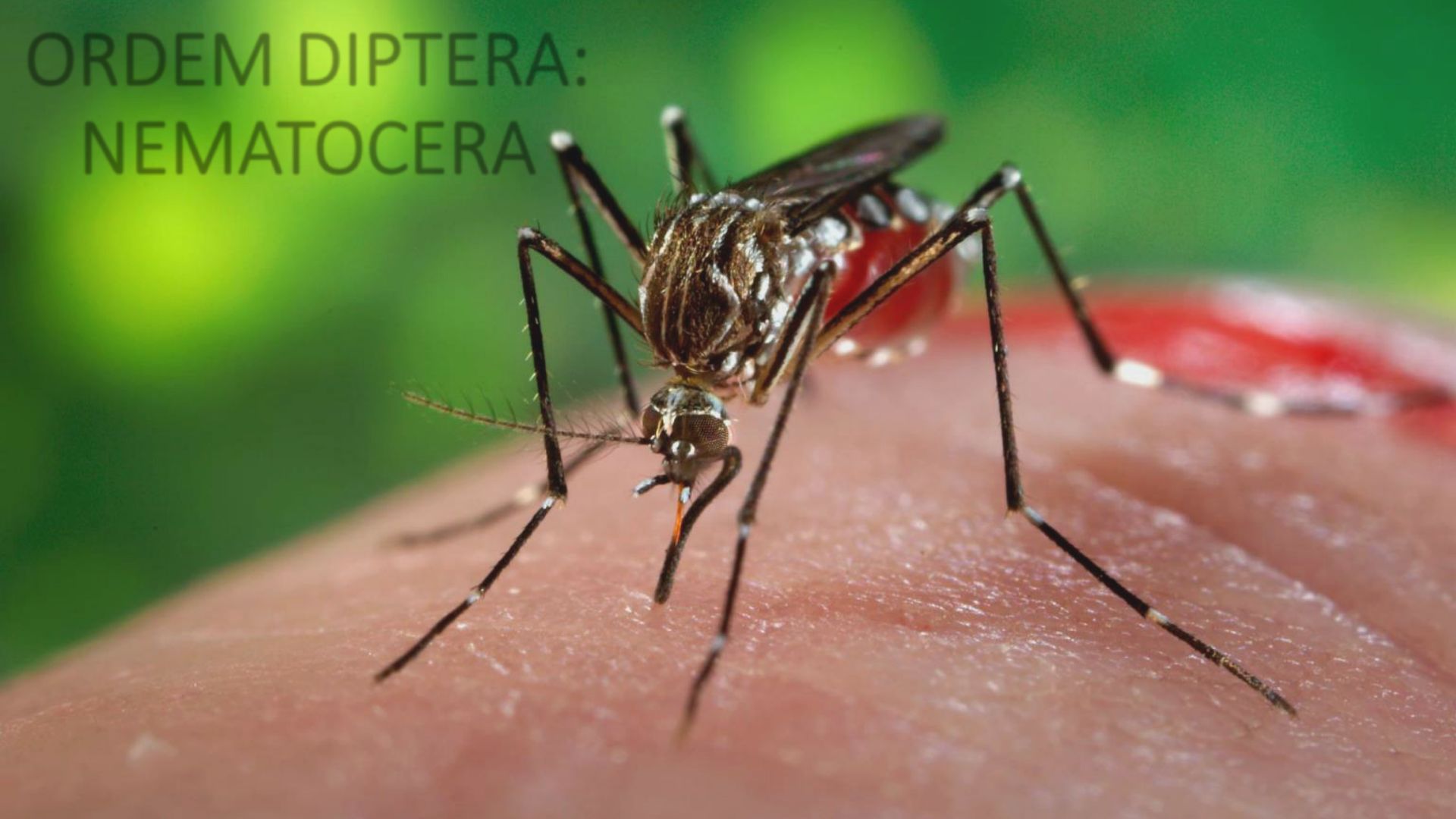 ORDEM DIPTERA: NEMATOCERA PROFª Luciana Guerim ORDEM DIPTERA • INSETOS ALADOS Ordem Diptera • Comportamento metabólico: • HOLOMETABOLIA SUBORDEM NEMATOCERA COMPORTAMENTO ALIMENTAR • HEMATÓFAGOS • FITÓFAGOS • HEMATÓFAGOS E FITÓFAGOS COMPORTAMENTO PARASITÁRIO • ANTROPOFILIA • ZOOFILIA • ZOOANTROPOFILIA COMPORTAMENTO REPRODUTIVO • AUTOGENIA OU ANAUTOGENIA • CONCORDÂNCIA OU DISCORDÂNCIA GONOTRÓFICA FAMÍLIA SIMULIIDAE Simuliidae • Conhecido vulgarmente como Borrachudo, pium, jején, simúlido, black-fly e buffalo- gnat. Ciclo Biológico Ovipostura em ambiente aquático (lótico) ou em plantas aquáticas; Ciclo Biológico Larvas passam por 4 a 9 estágios; Fixam-se a substratos através de ventosas; São consideradas filtradoras Ciclo Biológico Fixam-se a substratos através de ventosas; São consideradas filtradoras Ciclo Biológico Pupas desenvolvem em ambiente aquático, fixas ao substrato; Ciclo Biológico Pupas desenvolvem em ambiente aquático, fixas ao substrato; Ciclo Biológico Adultos emergem do pupário; HABITAT IMPORTÂNCIA MÉDICA VETERINÁRIA • Ação direta: Picada dolorosa; Síndrome de Altamira; • Transmissão de Patógenos: Onchocerca volvulus, Mansonella ozzardi; Leucocytozoon sp FAMÍLIA CERATOPOGONIDAE CERATOPOGONIDAE • Conhecido como maruins, mosquito pólvora, mosquito de mangue. Ciclo Biológico • Ovos: cilíndricos Ciclo Biológico • Larvas: Passam por Três estágios e movimentam-se sinuosamente Ciclo Biológico • Pupas; Ciclo Biológico • Adultos: ativos na lua cheia. Habitat IMPORTÂNCIA MÉDICA E VETERINÁRIA Danos diretos: Irritação e problemas cutâneos aos humanos; Transmissão de patógenos: Onchocerca, Arbovírus; FAMÍLIA PSYCHODIDAE SUBFAMÍLIA Psychodinae SUBFAMÍLIA Plebotominae SUBFAMÍLIA PHLEBOTOMINAE • Conhecidos vulgarmente como: birigui, cangalhinha, mosquito-palha, tatuquira, frebóti, flebótomo. CICLO BIOLÓGICO • Ovos: presentes em ambiente úmido e escuro; CICLO BIOLÓGICO • Larvas: alimentam-se de detritos orgânicos, passando por três estágios; CICLO BIOLÓGICO • Pupas: período de 30 a 40 dias; CICLO BIOLÓGICO • Adultos: atividade crepuscular e noturna. HABITAT HABITAT IMPORTÂNCIA MÉDICA VETERINÁRIA • Danos Diretos: Picada dolorosa; • Transmissão de patógenos como: Leishmania sp Sauroleishmania; Endotrypanum; Bartonella baciliformis Leishmaniose FAMÍLIA CULICIDAE CULICIDAE • Conhecidos vulgarmente como pernilongos, muriçoca, carapanã, sovelas, mosquito-prego e zancudos. Outros Gêneros Mansonia spSabethes sp Outros Gêneros Toxorhynchites spHaemagogus sp Subfamília Anophelinae • Ovos: com flutuadores, depositados em ambiente aquático. Subfamília Anophelinae • Larvas: sem sifão respiratório, passam por quatro estágios. Subfamília Anophelinae • Pupas: não se alimentam e aquáticas, ambiente salobro. Subfamília Anophelinae • Adultos: Hábito crepuscular e noturno HABITAT: Anophelinae Importância Médica Veterinária: Anophelinae • Danos diretos: Incômodo pela picada; Transmissão de Patógenos: Plasmodium spp Dirofilaria immitis Arbovírus Subfamília Culicinae: Culex • Ovos: depositados em ambiente aquático e sob aspecto de jangada; Subfamília Culicinae: Culex • Larvas: Ambiente aquático (lêntico), com riqueza de matéria orgânica; presença de sifão respiratório. Subfamília Culicinae: Culex • Pupas: Ambiente aquático (lêntico), com riqueza de matéria orgânica; Subfamília Culicinae: Culex • Adultos: Hábito noturno Culicinae: Culex spp HABITAT: Subfamília Culicinae (Culex sp) IMPORTÂNCIA MÉDICA VETERINÁRIA: Culex spp • Danos diretos: Incômodo • Transmissão de patógenos: Plasmodium spp Wuchereria bancrofti Dirofilaria immitis Arbovírus Subfamília Culicinae: Aedes spp • Ovos: Depositados isoladamente em ambiente úmido e aquático, Subfamília Culicinae: Aedes spp • Larvas: Aquáticas e com sifão respiratório. Subfamília Culicinae: Aedes spp • Pupas: Aquáticas Subfamília Culicinae: Aedes spp • Adultos: Hábito diurno HABITAT: Subfamília Culicinae (Aedes sp) Importância Médica Veterinária: Aedes spp • Transmissão de patógenos: • Vírus da Dengue • Vírus Zika • Vírus Chikunguyia • Vírus da Febre Amarela CULICINAE: Mansonia spp Habitat: Mansonia spp