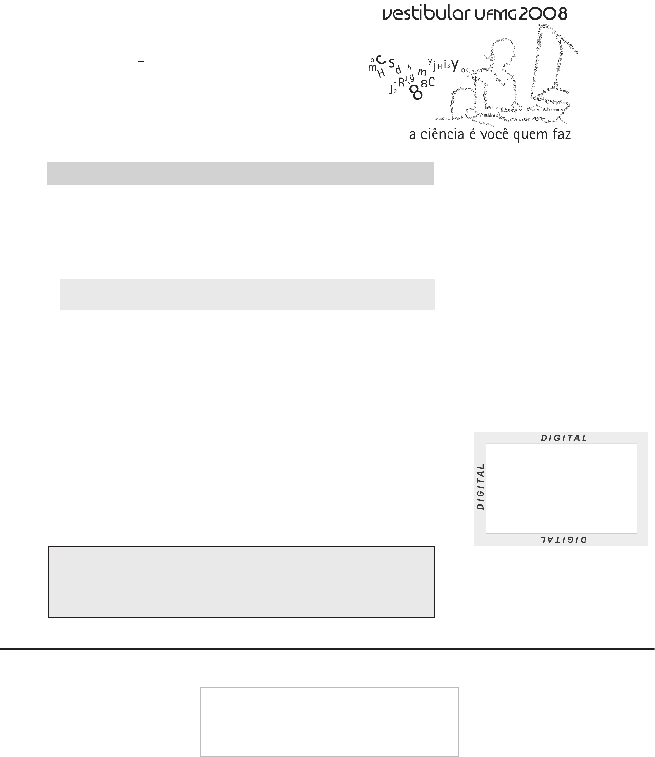 Leia atentamente as instruções que se seguem. 1 - Este Caderno de Prova contém seis questões, constituídas de itens e subitens, e é composto de dezesseis páginas, numeradas de 3 a 15. Antes de começar a resolver as questões, verifique se seu Caderno está completo. Caso haja algum problema, solicite a substituição deste Caderno. ATENÇÃO: Os Aplicadores NÃO estão autorizados a dar quaisquer explicações sobre questões das provas. NÃO INSISTA em pedir-lhes ajuda. 2 - Esta prova vale 100 pontos, assim distribuídos: • Questões 01, e 05: 18 pontos cada uma. • Questões 02, 03, 04 e 06: 16 pontos cada uma. 3 - NÃO escreva seu nome nem assine nas folhas desta prova. 4 - Leia cuidadosamente cada questão da prova e escreva a resposta, A LÁPIS, nos espaços correspondentes. Só será corrigido o que estiver dentro desses espaços. NÃO há, porém, obrigatoriedade de preenchimento total desses espaços. 5 - Não escreva nos espaços reservados à correção. 6 - Ao terminar a prova, entregue este Caderno ao Aplicador. COLE AQUI A ETIQUETA SÓ ABRA QUANDO AUTORIZADO. BIOLOGIA Duração desta prova: TRÊS HORAS. UNIVERSIDADE FEDERAL DE MINAS GERAIS ATENÇÃO: Terminada a prova, recolha seus objetos, deixe a sala e, em seguida, o prédio. A partir do momento em que sair da sala e até estar fora do prédio, continuam válidas as proibições ao uso de aparelhos eletrônicos e celulares, bem como não lhe é mais permitido o uso dos sanitários. Prova de 2a Etapa FAÇA LETRA LEGÍVEL. Im pr es sã o di gi ta l d o po le ga r d ire ito � PROVA DE BIOLOGIA - 2a Etapa QUESTÃO 01 Há algum tempo, a resistência a antibióticos vem-se tornando um problema mundial de Saúde Pública, porque dificulta o tratamento de infecções bacterianas. 1. Analise esta figura, em que está representada uma população de bactérias: A partir dessa análise e considerando outros conhecimentos sobre o assunto, A) CITE dois fatores evolutivos que atuaram nessa população. Fator evolutivo 1: ____________________________________________________________________ Fator evolutivo 2: ____________________________________________________________________ B) EXPLIQUE, de acordo com a teoria neodarwinista, a atuação desses dois fatores evolutivos na população de bactérias representada. ____________________________________________________________________________________ ____________________________________________________________________________________ ____________________________________________________________________________________ � PROVA DE BIOLOGIA - 2a Etapa 2. Analise esta figura, em que está representada uma população de bactérias que, logo após a introdução de antibiótico, se tornou resistente: A partir dessa análise e considerando outros conhecimentos sobre o assunto, IDENTIFIQUE a teoria evolutiva que permite explicar as mudanças observadas nessa população. JUSTIFIQUE sua resposta. Teoria evolutiva: _____________________________________________________________________ Justificativa: ________________________________________________________________________ __________________________________________________________________________________ 3. Atualmente, os antibióticos são utilizados em larga escala tanto em países desenvolvidos quanto naqueles em desenvolvimento. Analise esta tabela, em que está indicada a quantidade de antibióticos utilizada nos Estados Unidos, em diferentes situações: Uso de antibiótico Quantidade de antibiótico/ano No tratamento de doenças infecciosas em seres humanos 11,5 x 10 6 kg Em rações para animais 7,0 x 106 kg Na agricultura 4,5 x 106 kg A partir dessa análise e considerando outros conhecimentos sobre o assunto, INDIQUE uma medida no âmbito da Saúde Pública e uma medida no âmbito pessoal que podem contribuir para minimizar esse grave problema da resistência bacteriana a antibióticos. Medida de Saúde Pública: _____________________________________________________________ Medida pessoal: _____________________________________________________________________ � PROVA DE BIOLOGIA - 2a Etapa 4. Um dos problemas da resistência a antibióticos consiste na disseminação de genes de resistência entre as bactérias. Analise esta figura, em que estão indicados os mecanismos I, II e III de transmissão de genes entre bactérias: A partir dessa análise e considerando outros conhecimentos sobre o assunto, IDENTIFIQUE esses três mecanismos. Mecanismo I: _______________________________________________________________________ Mecanismo II: _____________________________________________________________________ Mecanismo III: _____________________________________________________________________ QUESTÃO 01 6 PROVA DE BIOLOGIA - 2a Etapa QUESTÃO 02 1. Observe esta figura, em que está representado o cromossoma X: A enzima G–6–PD (glicose seis fosfato desidrogenase), presente nas hemácias, está envolvida no metabolismo da glicose. Sabe-se que a deficiência dessa enzima torna a hemácia sensível a certas drogas por exemplo, alguns tipos de analgésicos. Considerando essas informações e outros conhecimentos sobre o assunto, ARGUMENTE a favor de ou contra cada uma das afirmativas que se seguem. A) O número de mulheres e de homens que podem desenvolver crises hemolíticas é igual. __________________________________________________________________________________ __________________________________________________________________________________ __________________________________________________________________________________ B) Indivíduos com o mesmo genótipo mutante para a síntese da enzima G–6–PD podem apresentar fenótipos diferentes. __________________________________________________________________________________ __________________________________________________________________________________ __________________________________________________________________________________ C) Os genes para o daltonismo e para a síntes
