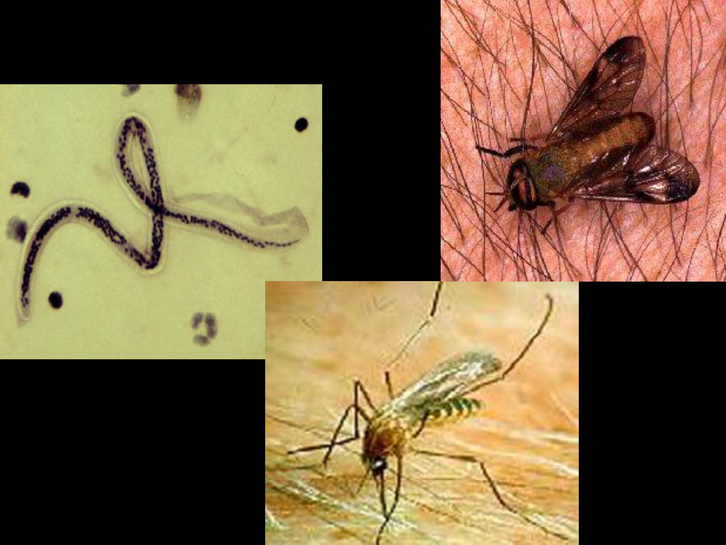 * Filárias * Filárias habitam sistema linfático e tecidos subcutâneos 8 espécies infectam o homem * Principais filárias no Brasil Wuchereria bancrofti – filariose linfática ou elefantíase Onchocerca volvulus – oncocercose ou cegueira dos rios Mansonella ozzardi - não patogênica, comum na Amazônia Dirofilaria immitis – filárias de cães – casos humanos [zoonose] * * Distribuição mundial de filariose causada por Wuchereria bancrofti 115 milhões estão infectados * Ciclo de vida de Wuchereria bancrofti Lesão na virilha Desenvolvimento no mosquito Mosquitos da família Culicidae (Culex quinquefasciatus = pernilongo) * Adultos de W. bancrofti em humanos Macho e fêmea adultos removidos de um vaso linfático Cauda do macho Secção de adultos parasitas num vaso linfático - 2 – 50 cm de comprimento fêmeas dobro do tamanho dos machos vivíparas – dão origem a formas pré-larvárias alongadas - microfilárias * Estrutura dos adultos de W. bancrofti Cabeça Cauda do macho Interior da Cauda do macho Parte anterior da fêmea Parte posterior da fêmea P = papilas; E = Esôfago; S = espícula; G = gubernáculo; U = vagina uterina; V = vulva; A= ânus; O = par de ovários * Desenvolvimento das microfilárias no útero E = membrana do ovo * Morfologia de uma microfilária de W. bancrofti Cabeça Bainha Anel nervoso Poro excretor Célula excretora Célula excretora Célula excretora Célula excretora Célula excretora Ânus Envoltório * Caudas de microfilárias desembainhadas M. perstans M. ozzardi O. volvulus * Elefantíase dos membros superiores (homem de Kagoshima) Quiluria. Frasco com urina fresca Patogenia da filariose por W. bancrofti * Tres pacientes com elefantíase Mulher de 33 anos (Kyushu, Japão) Mulher de 43 anos (Kyushu, Japão) perna esquerda começou a inchar com 20 anos Mulher Africana (Monrovia, Liberia) * Dois casos de elefantíase de Kagoshima (Kyushu, Japão) Homem de 40 anos com osquehidrocele Homem de 44 anos com elefantíase penescrotal. A lesão pesava 18,5 kg. Dos 14 aos 30 anos tinha febre uma ou duas vezes por semana. A partir dos 17 anos o foco começou a inchar * * Culex Aedes Anopheles Mansonia Vetores da filariose linfática Culex quinquefasciatus * larva pupa adultos macho fêmea ovos * Larva infectante de W. bancrofti (L3) Larva saindo da probóscide de Culex pipiens pallens Larva emergida do mosquito * Onchocerca volvulus Cegueira dos rios * Distribuição mundial de Onchocerca volvulus 217 mil indivíduos com cegueira * Ciclo de vida de Onchocerca volvulus e seu vetor Simulium sp. Fêmea de Simulium sp. - homem – hospedeiro definitivo vermes adultos habitam nódulos subcutâneos – encapsulados oncocercomas ficam enovelados e vivem por até 14 anos fêmeas adultas produzem cerca de 700 microfilárias por dia microfilárias vivem de 6-24 meses migração das microfilárias - olho * Oncocercomas Na cabeça de um menino guatemalteco Tumores removidos Oncocercose * Adultos de O. volvulus Corte de um oncocercoma mostrando secções de vermes adultos Adultos removidos de um tumor * Microfilárias e hospedeiro intermediário de O. volvulus Corte de larvas encontradas pele (flecha) Simulium metallicum * Simulideo - borrachudos Vetores no norte do Brasil Simulium guianense Simulium incrustatum S. oyapockense S. roraimense * Vetores de O. volvulus na Guatemala Simulium ochraceum Simulium metallicum * Distribuição geográfica de Mansonella perstans * Transmissor de Mansonella sp. = Cullicoides sp. * Simulídeo * * Tabanidae (mutuca) Loa loa * Dirofilaria immitis * Dirofilaria immitis * Dirofilaria immitis adultos 30 cm 23 cm * Dirofilaria immitis - Ocasionais em humanos mais de 60 espécies de mosquitos são vetores * Radiografia de tórax mostrando lesão pulmonar secundária em forma de moeda ocasionada por Dirofilaria immitis em homem adulto. * Microfilárias Dirofilaria immitis. Autofluorescência difusa. Periodicidade noturna. Loa loa. Sem fluorescência em grânulos ou difusa. Periodicidade diurna W. bancrofti. Autofluorescência difusa e numerosos grânulos. Periodicidade noturna * 50 mm Mosca Mosquito Culicoide Flebotomo * Prevenção e Controle das Filarioses Potencialmente erradiacáveis Sem reservatórios animais Controle de vetores Drogas eficientes DEC Ivermectina Albendazol * * 1 Prevents roundworms & hookworms. 2 Prevents roundworms, hookworms, & whipworms. 3 Does not kill fleas, but makes them sterile and unable to reproduce. 4 Does prevent roundworms and hookworms in cats only. 5 Product given by injection by your veterinarian.