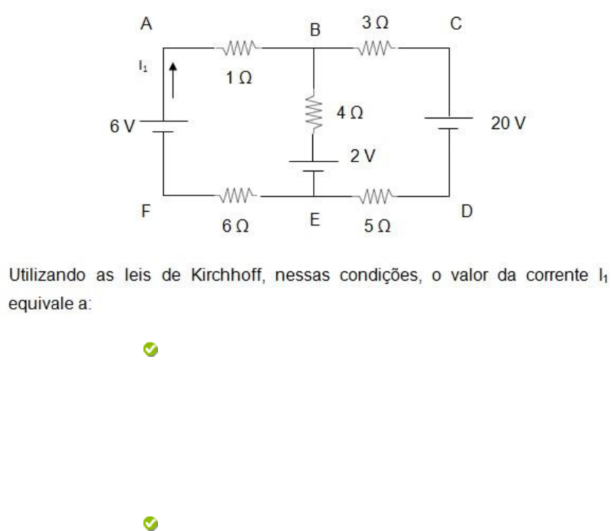 Eletrotécnica atividade III Pergunta 1 0,25 em 0,25 pontos Observe o circuito a seguir: Resposta Selecionada: d. I1 = 0,207 A. Respostas: a. I1 = 6,84x10-3 A. b. I1 = 35,7 mA. c. I1 = 7,49 A. d. I1 = 0,207 A. Feedback da resposta: Ao substituirmos o valor de I3 em qualquer uma das equações, encontraremos o valor de I2 e de I1. Então, teremos I2 = 1,362 A e, finalmente, i1 = -0,207 A. Pergunta 2 0,25 em 0,25 pontos Na análise pelo método da Superposição, o procedimento de eliminar as entradas de energia ocorre porque Resposta Selecionada: b. dessa forma determina-se a contribuição de uma fonte em detrimento da outra. Respostas: a. evita a sobrecarga do circuito, como um todo. b. dessa forma determina-se a contribuição de uma fonte em detrimento da outra. c. as resistências compensam a ausência dos bipolos geradores. d. assim, garante-se o balanço energético do circuito que está sendo analisado. Feedback da resposta: Na análise de um circuito pelo método da Superposição, tem-se como referência o fato de que o comportamento do circuito, como um todo, é resultado da influência de cada fonte geradora de energia, individualmente. Logo, no procedimento de análise, quando se analisa a contribuição de uma dessas fontes, deve-se, obrigatoriamente, eliminar o efeito da outra. Nesse caso, se curto-circuitam fontes de tensão e se abrem fontes de corrente no circuito. Assim sendo, a resposta da alternativa D é a correta. Pergunta 3 0,25 em 0,25 pontos Quando representamos um circuito elétrico por meio da utilização de símbolos interligados por linhas, estamos utilizando a representação Resposta Selecionada: a. esquemática. Respostas: a. esquemática. b. pictorial. c. seção transversal. d. em blocos. Feedback da resposta: A representação de circuitos elétricos por meio de diagramas que utilizam símbolos padronizados, interligados por linhas, é a esquemática. Nesse tipo de diagrama, os símbolos se associam aos diferentes componentes e suas funções no circuito. Pergunta 4 0,25 em 0,25 pontos Um circuito elétrico é um Resposta Selecionada: c. caminho fechado. Respostas: a. ponto específico dentro de um aparelho elétrico. b. conceito da eletrotécnica. c. caminho fechado. d. caminho aberto. Feedback da resposta: Por definição, um circuito elétrico é um caminho fechado, constituído por materiais condutores (pelos quais passam as cargas elétricas) e por dispositivos ou componentes (com funções específicas) interligados.