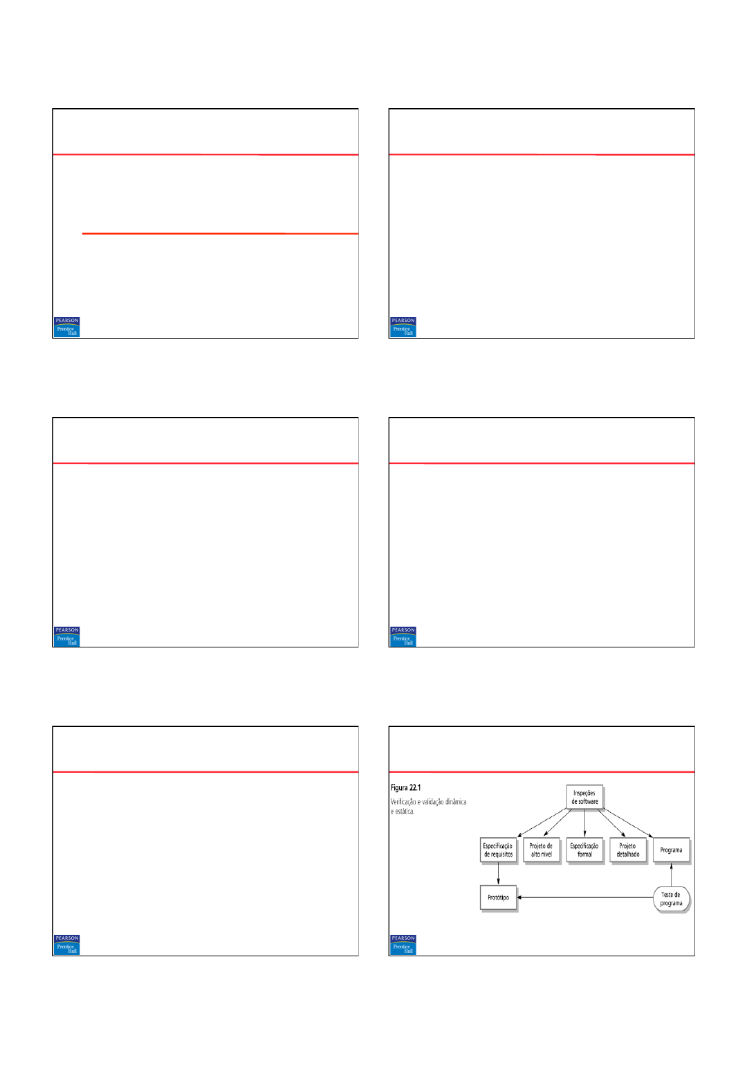 5/17/11 1 ©Ian Sommerville 2006 Engenharia de Software, 8ª. edição. Capítulo 22 Slide 1 Verificação e Validação ©Ian Sommerville 2006 Engenharia de Software, 8ª. edição. Capítulo 22 Slide 2 ● Verificação: “Estamos construindo o produto corretamente?” ● O software deve estar de acordo com sua especificação. ● Validação: “Estamos construindo o produto certo?”. ● O software deve fazer o que o usuário realmente deseja. Verificação vs Validação ©Ian Sommerville 2006 Engenharia de Software, 8ª. edição. Capítulo 22 Slide 3 ● Deve ser aplicado a cada estágio do desenvolvimento de software • Vale tanto para verificação quanto validação ● Tem dois objetivos principais: • Descobrir problemas em um sistema; • Problema = sistema que não satisfaz sua especificação • Avaliar se o sistema é útil e usável ou não em uma situação operacional. O processo V & V ©Ian Sommerville 2006 Engenharia de Software, 8ª. edição. Capítulo 22 Slide 4 Objetivos de V& V ● Verificação e validação devem estabelecer confiança de que o software é adequado ao seu propósito. ● Isto NÃO significa completamente livre de defeitos. ● Ao invés disso, deve ser bom o suficiente para seu uso pretendido • Tipo de uso determinará o grau de confiança necessário. ©Ian Sommerville 2006 Engenharia de Software, 8ª. edição. Capítulo 22 Slide 5 ● Inspeções de software. Análise de representações estáticas do sistema com o objetivo de descobrir problemas (verificação estática) • Pode ser suplementado por um documento baseado em ferramenta e análise de código. ● Teste de software. Relacionado ao exercício e à observação do comportamento do produto (verificação dinâmica) • O sistema é executado com dados de teste e seu comportamento operacional é observado. ● Outras técnicas: análise dinâmica, prototipação, entrevistas, cenários V & V estática e dinâmica ©Ian Sommerville 2006 Engenharia de Software, 8ª. edição. Capítulo 22 Slide 6 V & V estática e dinâmica 5/17/11 2 ©Ian Sommerville 2006 Engenharia de Software, 8ª. edição. Capítulo 22 Slide 7 ● Podem revelar a presença de defeitos, NÃO a ausência. ● Principal técnica de validação para requisitos não-funcionais • O software é executado para ver como se comporta. ● Devem ser usados em conjunto com a verificação estática para fornecer uma cobertura mais completa de V&V. Testes de Programas ©Ian Sommerville 2006 Engenharia de Software, 8ª. edição. Capítulo 22 Slide 8 ● Teste de validação • Pretende mostrar que o software atende as necessidades dos usuários; • Um teste bem sucedido é aquele que mostra que um requisito foi adequadamente implementado. ● Teste de defeitos • Testes projetados para descobrir defeitos de sistema; • Um teste de defeitos bem sucedido é aquele que revela a presença de falha em um sistema; • Abordado no Capítulo 23. Tipos de teste ©Ian Sommerville 2006 Engenharia de Software, 8ª. edição. Capítulo 22 Slide 9 ● Testes e depuração e de defeitos são processos distintos ● Verificação e validação estão relacionados ao estabelecimento da existência de falhas em um programa ● Depuração está relacionado à localização e repararação dessas falhas Teste e Depuração ©Ian Sommerville 2006 Engenharia de Software, 8ª. edição. Capítulo 22 Slide 10 O Modelo V de Desenvolvimento ©Ian Sommerville 2006 Engenharia de Software, 8ª. edição. Capítulo 22 Slide 11 O Modelo V de Desenvolvimento ©Ian Sommerville 2006 Engenharia de Software, 8ª. edição. Capítulo 22 Slide 12 A Estrutura de um Plano de Testes ● Processo de teste ● Rastreabilidade de requisitos ● Itens testados ● Cronograma de testes ● Procedimentos de registro de testes ● Requisitos de hardware e de software ● Restrições 5/17/11 3 ©Ian Sommerville 2006 Engenharia de Software, 8ª. edição. Capítulo 22 Slide 13 Inspeções de software ● Exame de um artefato de desenvolvimento para descobrir anomalias e defeitos • Técnica de verificação • Feitas por uma equipe, em uma reunião formal ● Não requerem a execução de um sistema, • Podem e devem ser usadas antes da implementação ● Podem ser aplicadas a qualquer artefato ● Têm se mostrado uma técnica efetiva para descobrir erros de programa • “...according to statistics it will find up to 90% of the contained errors, if done properly.” • (http://www.the-software-experts.de/e_dta-sw-test-inspection.htm) ©Ian Sommerville 2006 Engenharia de Software, 8ª. edição. Capítulo 22 Slide 14 Sucesso das inspeções ● Muitos defeitos diferentes podem ser descobertos em uma única inspeção. • Em teste, um defeito pode mascarar um outro, por isso, várias execuções são necessárias. ● Conhecimento sobre o domínio e sobre programação aumentam a eficácia • Revisores têm alta probabilidade de já ter visto os tipos de erros que normalmente surgem ©Ian Sommerville 2006 Engenharia de Software, 8ª. edição. Capítulo 22 Slide 15 Inspeções e testes ● Inspeções e testes são complementares • Inspeções => verificação • Testes => verificação e validação ● Ambos devem ser usados durante o processo de V & V. ● As inspeções podem verificar a conformidade com uma especificação • Não verificam a conformidade com os requisitos reais do cliente! ● As inspeções não podem verificar características de qualidade, tais como desempenho, usabilidade, etc. ©Ian Sommerville 2006 Engenharia de Software, 8ª. edição. Capítulo 22 Slide 16 Inspeções de Programas ● Abordagem formalizada para revisões de artefatos ● Voltadas explicitamente para detecção de falhas (não correção). ● Falhas podem ser erros lógicos (por exemplo, uma variável não iniciada) ou não-conformidade com padrões. ©Ian Sommerville 2006 Engenharia de Software, 8ª. edição. Capítulo 22 Slide 17 Pré-condiçõ