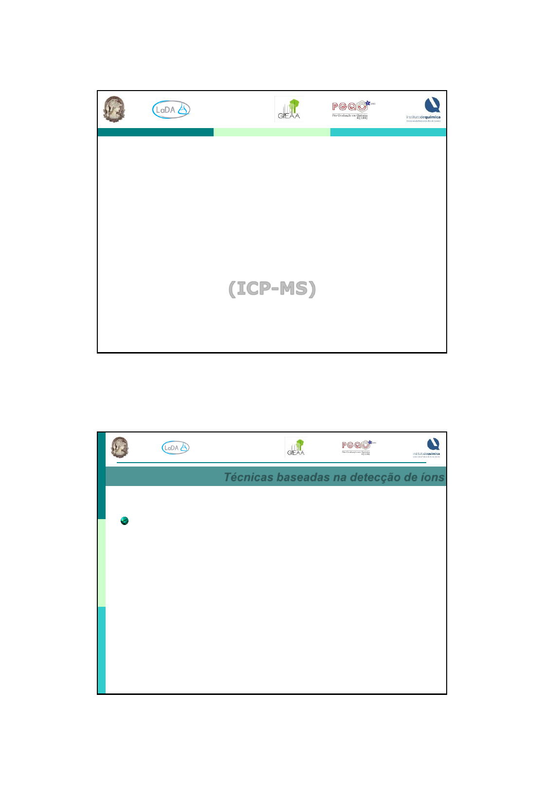 17/01/2018 1 DQA ESPECTROMETRIA DE MASSA COM FONTE DE PLASMA INDUTIVAMENTE ACOPLADO (ICP-MS) IQA364 – Análise Instrumental Unidade 3a 2017/3º Profª. Aline Soares Freire Professor Assistente A Departamento de Química Analítica - UFRJ DQA Espectrometria de Massa Inorgânica - MS Espectrometria de Massa com Fonte de Plasma Indutivamente Acoplado – ICP-MS. 2 Técnicas baseadas na detecção de íons 17/01/2018 2 DQA nebulização desolvatação partículas + íons fótons vaporização dissociação sólido ionização excitação líquido moléculas átomos 3 Técnicas baseadas na detecção de íons DQA 1A 2A 3B 4B 5B 6B 7B 8B 8B 8B 1B 2B 3A 4A 5A 6A 7A 8A H He Li Be B C N O F Ne Na Mg Al Si P S Cl Ar K Ca Sc Ti V Cr Mn Fe Co Ni Cu Zn Ga Ge As Se Br Kr Rb Sr Y Zr Nb Mo Tc Ru Rh Pd Ag Cd In Sn Sb Te I Xe Cs Ba La Hf Ta W Re Os Ir Pt Au Hg Tl Pb Bi Po At Rn Fr Ra Ac Ce Pr Nd Pm Sm Eu Gd Tb Dy Ho Er Tm Yb Lu Th Pa U Np Pu Am Cm Bk Cf Es Fm Md No Lr LIMITE DE DETECÇÃO: < 1 ppt 1 – 100 ppt 0.1 – 1 ppb Lantanídeos Actinídeos Inductively Coupled Plasma Mass Spectrometry 4 ICP-MS: Elementos passíveis de determinação 17/01/2018 3 DQA 5 ICP-MS: Áreas de aplicação DQA Princípio: Fundamenta-se na determinação de elementos (isótopos, razões isotópicas) utilizando a espectrometria de massa (MS) de íons produzidos através de um plasma indutivamente acoplado (ICP). 6 A técnica de ICP-MS 17/01/2018 4 DQA É um instrumento que separa, rapidamente, íons em movimento com base em suas razões massa/carga (m/z) “Não deve ser confundido com os espectrômetros convencionais de emissão ou absorção de radiação do espectro eletromagnético” 7 Espectrômetro de Massa O nome vem pelo fato do resultado da análise, ser uma distribuição de relações m/z, representada de forma gráfica como um espectro. DQA ICP Torch RF Supply Argon Spray Chamber Mech Pump Turbo Pump Turbo Pump ICP-MS Computer and Control Electronics Ion Lens Electron Multiplier Mass Filter Plasma Spectrometer Interface 8 ICP-MS: instrumentação básica 17/01/2018 5 DQA 9 Opções para a espectrometria de massa inorgânica DQA 10 ICP-MS: fonte de energia Funções: Promover a dissociação dos compostos presentes na amostra formando íons livres. ● Necessidade de energia cinética alta (altas temperaturas) Fonte de Energia 17/01/2018 6 DQA Gás a temperatura elevada contendo moléculas, átomos, íons e elétrons; Plasmas são condutores elétricos; Plasmas são afetados pelo campo magnético; 11 ICP-MS: o plasma Acervo pessoal ICP-MS Thermo Scientific, Modelo ICAP Qc (LaDA - Lab. 518 – DQA / IQ / UFRJ) DQA ICP-MS: o plasma 12 ICP-MS Thermo Scientific, Modelo ICAP Qc (LaDA - Lab. 518 – DQA / IQ / UFRJ) Acervo pessoal 17/01/2018 7 DQA 13 A descarga com ICP – O 1º potencial de ionização DQA Constituída de três tubos concêntricos - peça única ou desmontável Sua montagem é sempre horizontal (axial) – aproximadamente a 10-20 mm da interface 14 ICP-MS: a tocha 17/01/2018 8 DQA Tocha, ICP-MS Thermo Scientific modelo X Series II (UFF - Depto. de Geoquímica - Lab. 108) 15 ICP-MS: a tocha Acervo pessoal DQA ICP-MS: montagem tocha + bobina de RF Tocha, ICP-MS Thermo Scientific, modelo ICAP Qc Injetor sem anel de vedação dispensando alinhamento Porta para gás adicional (orgânicos) Adaptadores para gases fixos (dispensa conexão manual) Tocha desmontável sem anel de vedação Câmara de nebulização sem anel de vedação 16 17/01/2018 9 DQA 17 ICP-MS: a tocha Tocha, ICP-MS Thermo Scientific, modelo ICAP Qc (UFRJ – IQ – DQA – Lab. 518) Acervo pessoal Acervo pessoal Acervo pessoal DQA Faz a ligação entre a fonte de íons em pressão atmosférica com a região de alto vácuo do separador de massa (quadrupolo); Constituída por 2 cones metálicos normalmente feitos em níquel ou platina A interface é resfriada e mantida sob vácuo por uma bomba rotativa mecânica entre 2-10 mbar Cone amostra (sample cone): localizado após o plasma - diâmetro do orifício 0,8 a 1,2 mm Cone escuma (skimmer cone): está fixado no jato supersônico - diâmetro do orifício 0,4 a 0,8 mm 18 ICP-MS: a interface (hifenação) 17/01/2018 10 DQA Sistemas com três câmaras de vácuo são mais comuns. 1º Estágio: ● Interface: situada entre o cone de amostragem e cone escuma é bombeada até aprox. 2-10 mbar via bomba rotativa mecânica. 2º Estágio: ● Óptica de íons, bombeada até aprox. 10-4 mbar via bomba de vácuo. 3º Estágio: ● Analisador de massa e detector, são bombeados até aprox. 10-6 mbar via bomba de vácuo turbomolecular. 2º e 3º estágios não podem partir da pressão atmosférica! (requerem bomba rotativa) 19 ICP-MS: sistema de vácuo DQA Bomba de vácuo rotativa Bomba de vácuo turbomolecular 20 ICP-MS: sistema de vácuo 17/01/2018 11 DQA Função dos cones: extrair os íons do interior do plasma. O primeiro é de amostragem, fica inserido no interior do plasma e passa da pressão atmosférica para cerca de 1 – 4 Torr. O segundo, coleta os íons do ambiente com esta pressão reduzida para o MS com pressão muito baixa (10-5 Torr). Entre os dois cones, as partículas sem carga são eliminadas pelo vácuo da bomba mecânica. Pressão Atmosférica (760 Torr) “Cone escuma (skimmer) Cone de Amostragem 5 x 10-5 Torr 1 Torr Velocidade das partículas 2,5 x 105 cm/s 21 A interfade do ICP-MS: cones de amostragem e escuma DQA A interfade do ICP-MS: cones de amostragem e “skimmer” 22 17/01/2018 12 DQA 23 A interface do ICP-MS: os cones Sample cone (Cone de amostragem) “Skimmer” (Cone escuma) ICP-MS Thermo Scientific, Modelo X Series II (Lab. 108 – GPEAA – Geoquimica/UFF) Acervo pessoal Acervo pessoal Acervo pessoal DQA 24 A interfade do ICP-MS: os cones Sample cone (Cone de amostragem) ICP-MS Thermo Scientific, Modelo ICAP Qc (LaDA - Lab. 518 – DQA / IQ / UFRJ) “Skimmer” (Cone escuma) Acervo pessoal Acervo pessoal Acervo pessoal Acervo pessoal 17/01/2018 13 DQA 25 A interfa