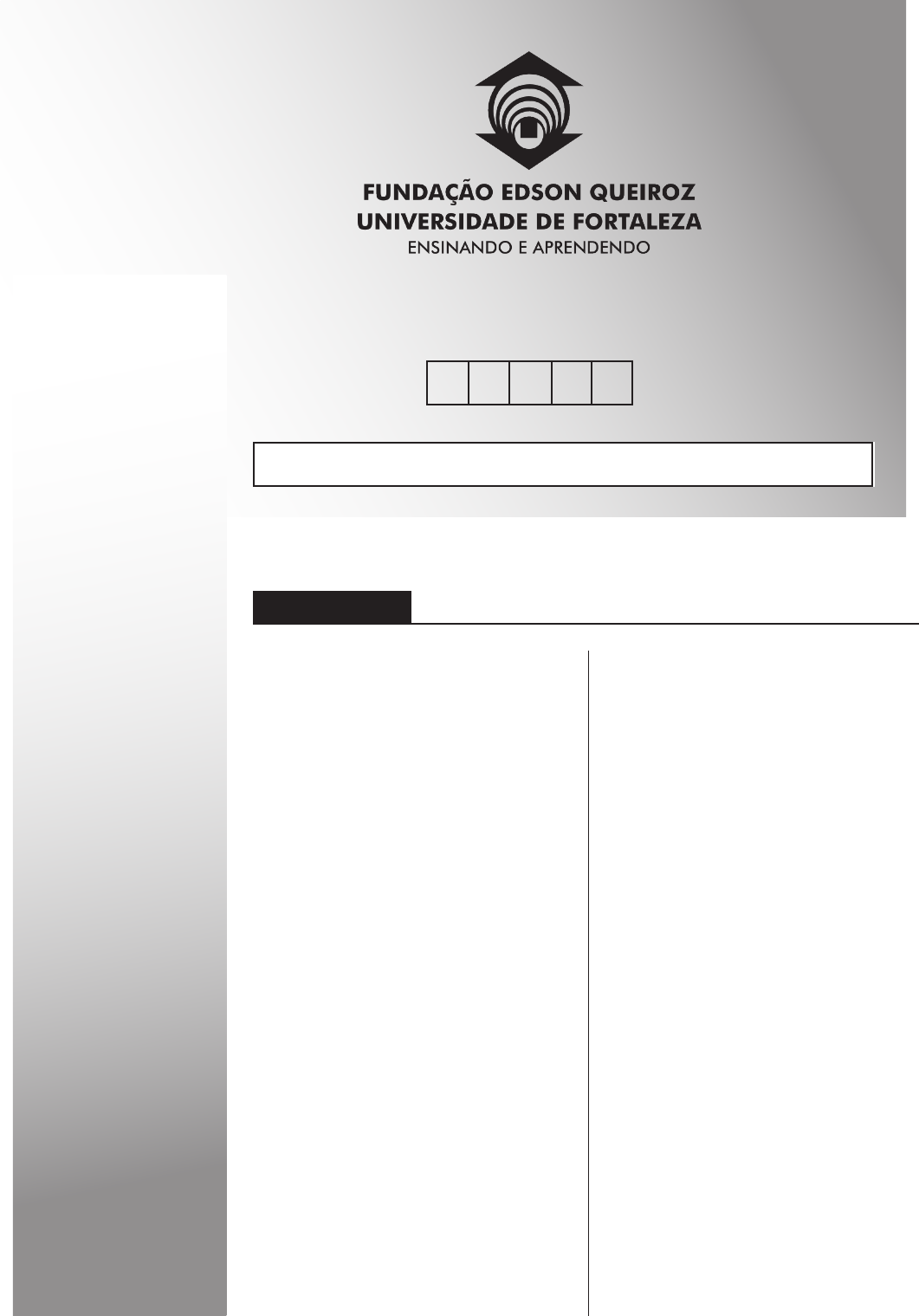 UNIFOR 1. Verifique se este caderno de prova contém um total de 60 questões e uma proposta de Redação. Caso contrário, solicite ao fiscal de sala um outro caderno completo. Não serão aceitas reclamações posteriores. 2. Você dispõe de quatro horas e trinta minutos para responder a todas as questões, preencher a folha de respostas e desenvolver a Redação, transcrevendo-a para a folha de redação. Controle o seu tempo. 3. Leia cada questão da prova e marque, inicialmente, a alternativa correta no próprio caderno de questões. Para cada questão, existe apenas uma resposta certa. 4. Antes de transcrever suas alternativas para a folha de respostas ou preencher a folha de redação, confira se o nome e o número impressos na parte superior delas coincidem com seu nome e o seu número de inscrição e assine- as conforme a sua carteira de identidade. 5. Caso o nome e o número impressos na folha de respostas ou na folha de redação que lhe foram entregues não estejam corretos, informe, imediatamente, ao fiscal. A utilização de uma folha de respostas ou de uma folha de redação cujo nome e número não coincidam com os de sua inscrição invalidará a sua prova, à qual será atribuída nota zero. 6. Para marcar a sua alternativa na folha de respostas, utilize caneta esferográfica preta, de acordo com a orientação a seguir: a) preencha completamente a bolha correspondente à sua opção e assinale somente uma alternativa para cada questão; b) nenhuma resposta poderá ser feita nem alterada depois de re- colhida pelo fiscal; c) não dobre, não amasse, nem faça qualquer marca na folha de respostas. 7. Ao terminar, entregue este caderno, a folha de redação e a folha de respostas, devidamente assinadas, ao fiscal da sala. 8. Atenção: após o encerramento da prova, este caderno será destruído por trituramento, e não será considerada qualquer resposta feita nele quando não transcrita para a folha de respostas. INSTRUÇÕES PR OC ES SO SE LE TIV O 20 17 .2 NÚMERO DE INSCRIÇÃO NOME: 2 UNIFOR – Processo Seletivo 2017.2 UNIFOR 3 UNIFOR – Processo Seletivo 2017.2 UNIFOR MATEMÁTICA E SUAS TECNOLOGIAS Questão 1 Questão 2 Um hotel em Dubai possui um aquário no formato de um tanque retangular, cujas dimensões internas são mostradas na figura abaixo. O volume de água contido no aquário é de 15 m3. O aquário será reposicionado de modo que a base será uma das faces com 3 m de largura e 2 m de comprimento, como mostrado abaixo. A altura da coluna de água no tanque após ele ser reposicionado será (A) 1,5 m (B) 2,0 m (C) 2,5 m (D) 3,0 m (E) 3,5 m Na última edição da feira das profissões da Universidade de Fortaleza, compareceram 8064 alunos de escolas públicas e particulares do Ceará. Desse total, eram de alunos do segundo ano do ensio médio. Já dos alunos do segundo ano que visitaram a feira eram do sexo masculino. E das meninas do segundo ano que visitaram a feira foram a pelo menos um estande de um dos cursos do Centro de Ciências Tecnológicas (CCT). A quantidade total de alunas do segundo ano que visitaram a feira e não visitaram algum estande dos cursos do CCT é (A) 768. (B) 864. (C) 989. (D) 1023. (E) 1152. 1 4 3 7 1 3 4 UNIFOR – Processo Seletivo 2017.2 UNIFOR Questão 3 Na tabela abaixo, temos a comparação entre os pacotes de canais básicos de uma determinada operadora de TV paga, em junho de 2015 e em junho de 2016. Pacotes Quantidade de canais Preço 2015 2016 Variação 2015 2016 Essencial 19 20 1 86,9 69,9 Na medida 60 58 -2 99,9 104,9 Na medida HD 84 86 2 126,9 119,9 Completo 73 65 -8 129,9 129,9 Completo HD 106 103 -3 151,9 144,9 Levando-se em consideração o preço por canal, é correto afirmar que os pacotes mais vantajosos com relação ao preço por canal em junho de 2016 eram (A) o Essencial e o Na medida HD. (B) o Na medida HD e o Completo HD. (C) o Na medida e o Na medida HD. (D) o Na medida HD e o Completo. (E) o Essencial e o Completo. Questão 4 O Centro de Ciências Tecnológicas da Universidade de Fortaleza promoveu, no dia 6 de maio de 2017, a 1ª Maratona de Cálculo do CCT / Unifor que teve como objetivo fomentar o interesse pelas disciplinas de Cálculo, tendo em vista que elas são pré-requisitos para várias outras. Além disso, o projeto visou aprimorar os conhecimentos que serão aplicados em diversas áreas e fortaleceu a importância do Cálculo para a vida profissional do engenheiro. Este evento foi planejado pelos professores da disciplina, com apoio da Assessoria Pedagógica e contou com a participação de 17 equipes de três alunos. Suponha que oito alunos desejam formar uma equipe para concorrer na Maratona de Cálculo. De quantos modos distintos essa equipe pode ser formada? (A) 286. (B) 296. (C) 316. (D) 326. (E) 336. 5 UNIFOR – Processo Seletivo 2017.2 UNIFOR Questão 5 Questão 6 No feriado de semana santa, Paulo viajou com seus amigos para uma casa alugada numa região serrana e levou consigo uma garrafa de vinho que havia ganhado num sorteio. Como o vinho era caro, ele guardou a garrafa trancada à chave, num armário da casa, para beber com seus amigos no último dia. Um de seus amigos conseguiu uma cópia da chave, abriu o armário, bebeu metade do conteúdo da garrafa, completou a garrafa com água e recolocou-a no lugar. Logo depois, deu a chave para um outro amigo que fez a mesma coisa. Quando Paulo percebeu, já havia menos de 1% de vinho na garrafa. Assim, o número mínimo de vezes em que os amigos de Paulo beberam da garrafa é de (A) 4 (B) 5 (C) 7 (D) 9 (E) 11 A cidade de Bom Paraíso possui 40.000 habitantes. Estima-se que a cada mês 12% da população necessita de atendimento médico. Desses atendimentos, 40 % serão de clínica médica, 15% de pediatria e 2,5% psiquiatria. Podemos afirmar que mensalmente (A) 2000 pessoas são atendidas na clínica médica. (B) 1200 pessoas são atendidas na psiquiatria. (C) 1000 pessoas são atendidas na psiquiatria. (D) 720 pessoas são atend