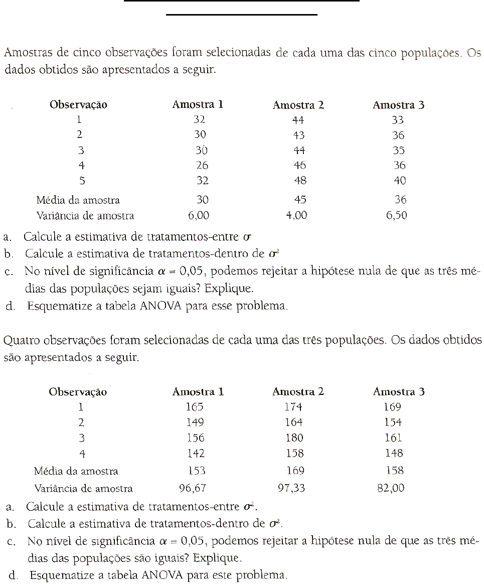 1 LISTA DE EXERCÍCIOS DE ANOVA Profa. Eliane da Silva Christo 1) 2) 2 3) 4) Os dados referentes às quantidades de cálcio (parte média por milhão) de água medidas em três locais ao longo do rio Mississipi estão apresentados na tabela abaixo. Local 1 42 37 41 39 43 41 Local 2 37 40 39 38 41 39 Local 3 32 28 34 32 30 33 Efetue uma análise de variância para testar, ao nível de significância de 0,01, se as diferenças entre as médias obtidas nos três locais são significativas. Resp. F= 36,71 rejeita H0. 5) Um técnico de laboratório quer comparar a resistência à ruptura de três marcas de fios, e, inicialmente, tinha planejado repetir cada medição seis vezes. Entretanto, não dispondo de tempo suficiente, ele limita sua análise aos seguintes resultados (em quilogramas) Fio 1 18,0 16,4 15,7 19,6 16,5 18,2 Fio 2 21,1 17,8 18,6 20,8 17,9 19,0 Fio 3 16,5 17,8 16,1 Supondo que esses dados constituem amostras aleatórias de três populações normais com o mesmo desvio-padrão, efetue uma análise de variância para testar, ao nível de 0,05 de significância, se as diferenças entre as médias amostrais são significantes. Resp. F=4,06 rejeita H0. 6) A tabela abaixo apresenta a produção, em toneladas, de certa variedade de trigo cultivada em um tipo particular de solo tratado com os fertilizantes A, B e C. Efetue uma análise de variância para testar, aos níveis de significância de 0,05 e 0,01, se há igualdade entre as médias dos três fertilizantes. Resp. F= 6,00 (a) rejeita H0 (b) aceita H0. A 48 49 50 49 B 47 49 48 48 C 49 51 50 50