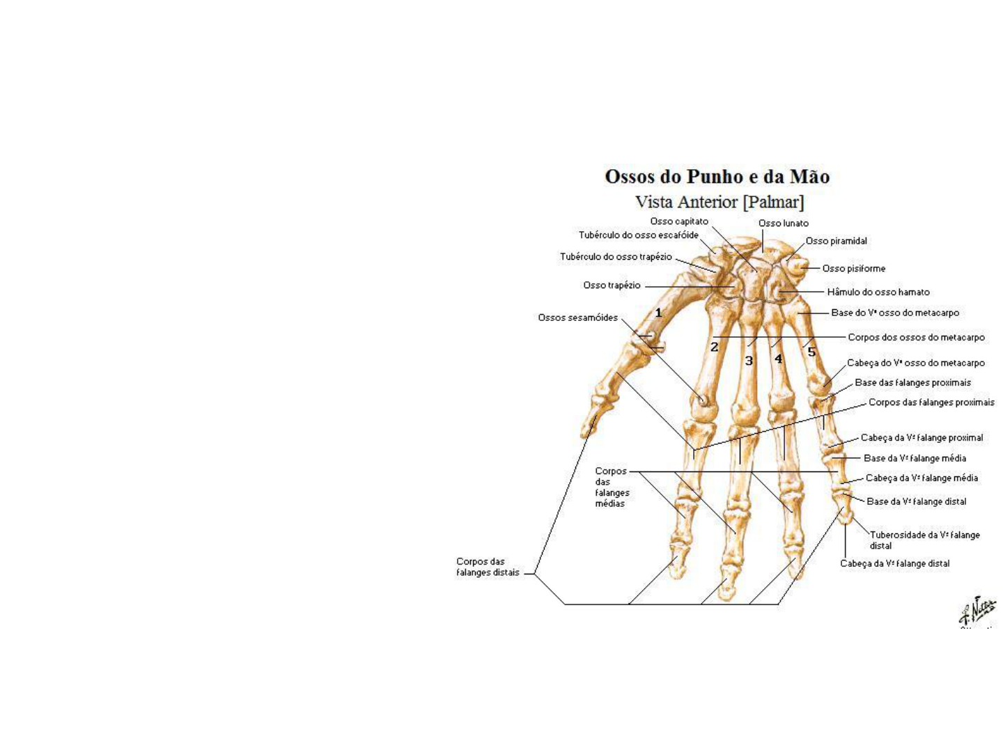 Falanges •Os ossos dos dedos são 14 em cada mão. •Cada falange consiste de uma base (proximal), corpo e cabeça (distal). •No polegar, só existem duas falanges: uma proximal e outra distal. •Nome dos dedos: polegar, indicador, médio, anular e mínimo.