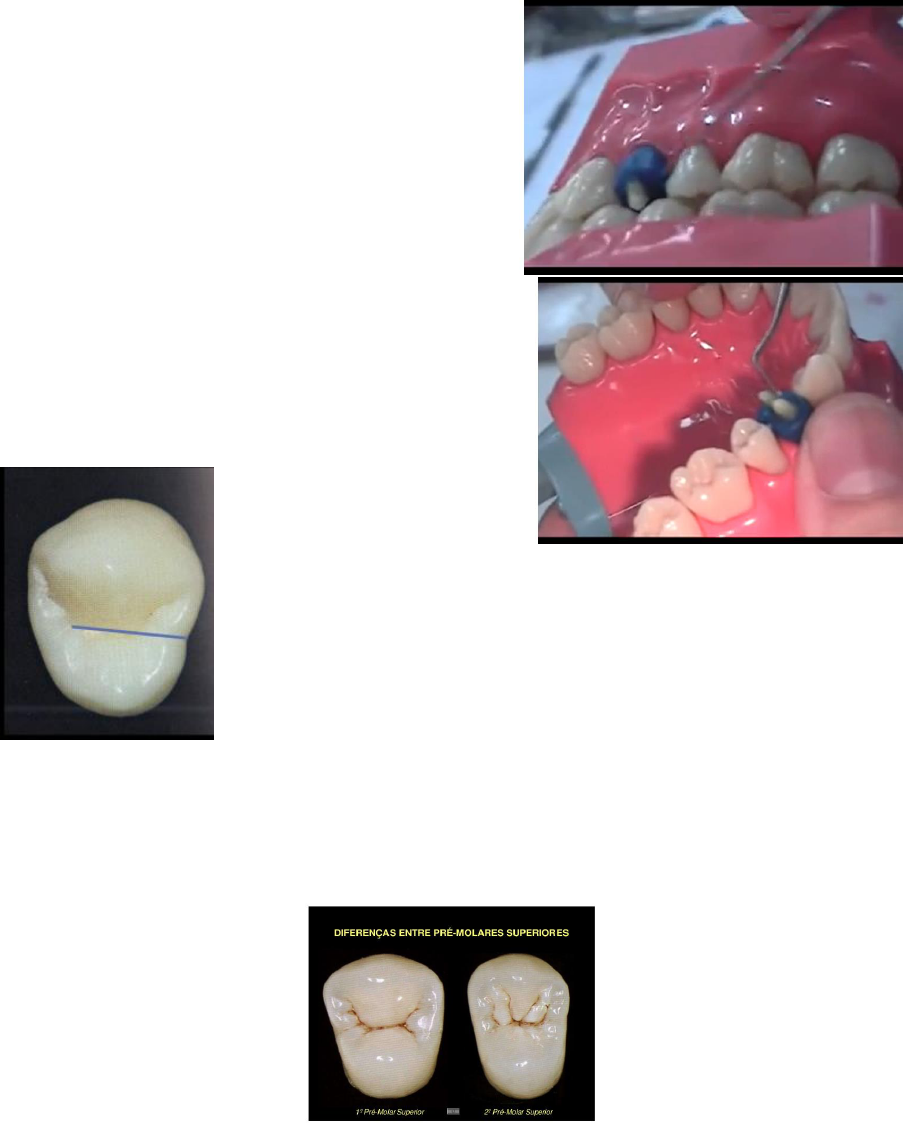Noções e técnicas de enceramento progressivo e anatomia dentária Primeiro pré-molar Com o gotejador mais robusto, aquecemos a cera e começamos pelo perímetro dentário, no troquel, para sabermos onde se situarão as cúspides e por consequência a oclusal. Nos baseamos sobre o tamanho do dente pela face vestibular e lingual dos dentes vizinhos e determinamos os contatos proximais. Depois preenchemos o interior do dente conformando a oclusal em sua forma básica. Fundimos um pouco o dente e ocluímos com o antagonista (Imagem 1). Dessa forma, a cúspide palatina ocluirá com a fossa central e as vertentes da cúspide vestibular estará entre dois antagonistas (1º e 2º pré-molar inferior). Isso será mostrado na cera e onde houver uma projeção, indicará o espaço interdental desses antagonistas. Fazemos as cúspides vestibular e lingual, sendo a lingual mais desviada para mesial (Imagem 2). Fazemos as vertentes internas. Arredondamos as arestas. Convergimos as proximais para lingual e acertamos as alturas das cúspides. O sulco na vestibular do 1º pré- molar tem formato de dois “S” um oposto ao outro, e o sulco central é retilíneo (Imagem 3). Na ocluso- vestibular há uma pequena depressão no sulco e na lingual há duas depressões em S parra projetar as vertentes. Segundo pré-molar O segundo pré-molar é menor do que o primeiro pré-molar em todas as dimensões. O sulco mésio- oclusal é mais estreito e dele sai o sulco vestibular e lingual, de forma semelhante à um chifre. Na lingual esses “S” são apenas depressões. As cúspides de maior para menor são: M-L, M-V, O-V, O- L. Primeiro molar (26) A cúspide irá ocluir na região central do molar inferior e a cúspide mésio-vestibular ocluirá no espaço interdental dos antagonistas. Segundo molar É menor do que o primeiro molar em todas as dimensões. Não possui ponte de esmalte e tubérculo de Carabelli. Pode ter três ou quatro cúspides. Dentes anteriores Fazemos três cones de apoio e uma barra de cera sobre eles, e depois preenchemos o centro.