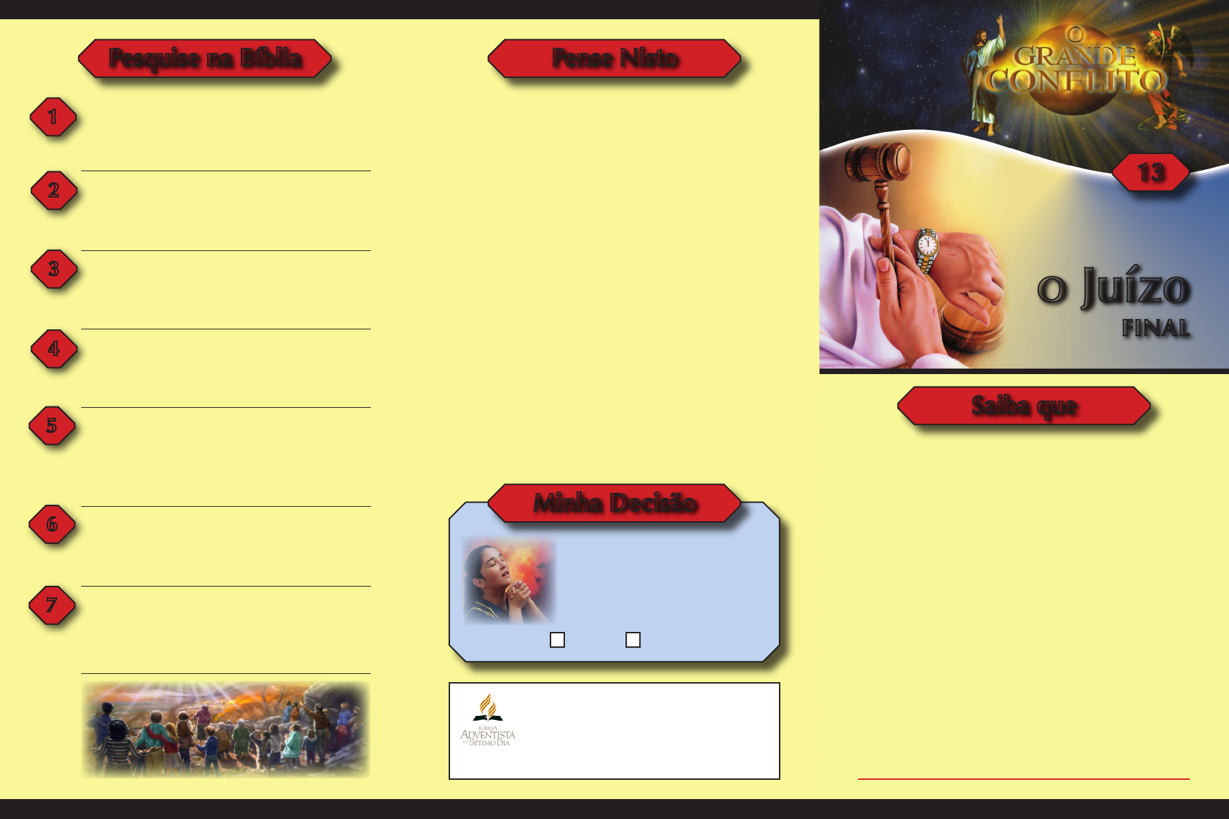 O Juízo FINAL Pela Graça de Divina, eu dese- jo temer a Deus, dar toda hon- ra e glória a Ele e adorá-Lo com todas as minhas faculdades físi- cas e mentais e espirituais. SIM NÃO Diante de que tribunal todos irão compare- cer? II Coríntios 5:10. Quais são as três coisas que devemos na pri- meira fase do juízo? Apocalipse 14:6, 7. Quem vai ajudar no julgamento durante a segunda fase do juízo? I Coríntios 6:2, 3. De acordo com que lei todos serão julga- dos? Tiago 2:8 a 12. Que diz Jesus ao terminar a obra de puri- ficação (juízo) do santuário celestial? Sofo- nias 2:1 a 3; Apocalipse 22:11. De acordo com o quê cada um receberá a sentença no juízo final? Mateus 16:27. Qual é a certeza dos que permanecerem fir- mes até o fim? Apocalipse 2:10 e 3:5. 1 2 3 4 5 6 Minha Decisão Pesquise na Bíblia Pense Nisto Todos os vivos, como os mortos, devem ser jul- gados segundo as suas obras. Vivemos hoje no grande Dia da Expiação do Santuário Celeste A obra de preparação é uma obra individual. Não somos salvos em grupos. Cada um deve ser provado e achado sem mancha, defeito ou coisa semelhante. Solenes são as cenas ligadas à obra final da expiação. Na augusta presença de Deus nossa vida deve passar por exame... quando se encerrar a obra do juízo de investigação, o destino de todos terá sido decidido, ou para a vida, ou para a morte. Saiba que 13 Todas as pessoas vão estar, em breve, diante de Deus. Ricos e pobres, pretos e brancos, cultos e analfabetos, cantores, artistas, juizes, advogados, médicos, presidentes, políticos em geral, líderes religiosos e, não se esqueça, você também vai es- tar, um dia, diante de Deus para receber uma re- compensa de acordo com o seu feito por meio do corpo, quer seja o bem, quer seja o mal. Deus vai Julgar todas as obras. Até as que estão escondidas. Que tipo de obras costuma esconder? As boas ou as más? A propósito, você já fez muitas coisas erradas? Pense agora em tudo de errado que você já fez, algo de errado que você já praticou e seu marido ou sua mulher nem imagina. PENSE EM TUDO ISSO E LEMBRE-SE: “Você pode esconder seus pecados dos homens, mas lembre-se que Deus registra tudo em Seus livros e Ele trará juízo todas as obras”. Portanto, entre em intima comunhão com Deus. Converse seriamente com Ele sobre seus problemas. Não esconda nada e, quanto ao que você não se lembra, peça misericórdia e Deus te perdoará. ©Reprodução permitida com autorização da Igreja Adventista do 7º Dia - Sede Sul-Americana - www.dsa.org.br 7 As Fases do Juízo Investigação - Apocalipse 14:6, 7. Comprovação - Apocalipse 20:4. Execução - Mateus 25:34 e 41. Acontece agora. Começou em 1844. Daniel 8:14. Termi- nará um pouco antes da volta de Jesus. Apocalipse 14:7. Agora é hora de abandonar o mundo de pecado e buscar o Deus vivo e verdadeiro. Você pode ser transformado agora. Jesus está ao seu lado e, se você quiser, Ele vai te abraçar e te fazer a pessoa mais feliz deste mundo. Esta fase acontecerá durante o período milênio. Começa- rá na volta de Jesus e terminará quando a Cidade Santa descer do céu. Durante esta fase haverá três surpresas: 1ª surpresa - Você estar lá. 2ª surpresa - Pessoas que você acha que não irão para o céu poderão estar lá. 3ª surpresa - Pessoas que você acha que irão para o céu não estarão lá. Acontecerá após o milênio. Quando a Cidade Santa descer do céu todos os ímpios ressuscitarão, haverá uma tentativa de ataque por parte de Satanás e deles, à Cidade de Deus. Jesus vai intervir e acontecerá a cena mais emocionante da história, quando os ímpios, inclusive o Diabo, irão se ajoe- lhar diante de Jesus e então Ele dará a sentença final. Aos justos Ele dirá: “Vinde benditos de meu Pai.” Aos ímpios: “Apartai-vos de mim malditos de meu Pai.” O FOGO VAI CONSUMIR TODO O MAL E PURIFICAR A TERRA. CRISTO CRIARÁ UM NOVO CÉU E UMA NOVA TERRA E COMEÇARÁ A TÃO SONHADA VIDA ETERNA. A Bíblia apresenta a realidade de um tempo de Juízo final: O Senhor vem julgar a terra. I Crônicas 16:33; Salmo 96:13; 98:9. Deus julgará o justo e o perverso. Eclesiastes 3:17. Deus trará a juízo todas as obras. Eclesiastes 12:14. Estabeleceu um dia de juízo. Atos 17:31. Há um juízo vindouro. Atos 24:25. Todos compareceremos ao tribunal. Romanos 14:10. Vinda do Senhor para exercer juízo. Judas 14 e 15. A profecia revela a hora do juízo 408 AC 457 AC 27 AD 34 AD 1844 AD Volta de Jesus Fase do Juízo Investigativo O Evangelho a Todo o Mundo 31 AD 434 Anos - 62 Semanas 7 Anos - 1 Semana49 Anos - 7 Semanas 490 Anos - 70 Semanas estão determinadas sobre o teu povo - Daniel 9:24 a 27. 2300 Anos - 2300 tardes e manhãs. . . Daniel 8:14. ...e o santuário será purificado. Daniel 8:14. Jerusalém ReconstruidaDecreto de Artaxerxes Esdras 7 1810 Anos Batismo de Jesus Morte de Cristo Apedrejamento de Estevão Conversão de Saulo de Tarso Pedro prega para Cornélio Início do Juízo ...é chegada a hora do seu juízo. Apoc. 14:7. O D IA G R A M A D O J U ÍZ O Q ue m é ... Fa se IN V ES TI G A TI V A Fa se C O M PR O V A TI V A Fa se EX EC U TI V A Ju iz D eu s - Sa lm o 50 :6 . Ju st os - A po c. 2 0: 4. Je su s - Jo ão 5 :2 2. A dv og ad o Je su s - I Jo ão 2 :1 . N ão H av er á N ão H av er á A cu sa do r Sa ta ná s - A po c. 1 2: 9, 10 . Es ta rá P re so - A po c. 2 0: 1- 3. Sa ta ná s - A po c. 2 0: 7. Te st em un ha s A nj os - A po c. 5 :1 1. A nj os - A po c. 5 :1 1. A nj os - A po c. 5 :1 1. R éu s Ju st os - I P ed ro 4 :1 7. Ím pi os - I C or . 6 :2 ,3 . To do s - M at . 2 5: 34 ,4 1. Le i D ez M an da m en to s T ia go 2 :1 0- 13 . D ez M an da m en to s T ia go 2 :1 0- 13 . D ez M an da m en to s T ia go 2 :1 0 -1 3. 3 anos e meio 3 anos e meio